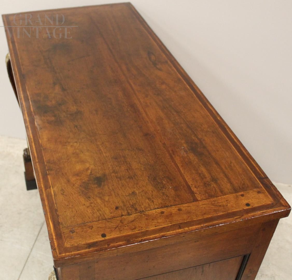 Cassettone comò antico con ribalta epoca Impero in noce massello, intarsiato e filettato in vari legni pregiati, con applicazioni in bronzo. Epoca primi '800 - Impero, provenienza Italia - Piemonte.