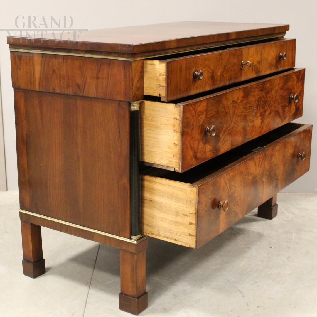 Cassettone Impero a tre cassetti in noce massello lastronato in noce, con profili in ottone, epoca primi '800 - Impero, provenienza Italia - Emilia Romagna, Bologna.