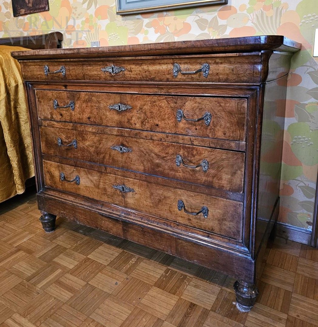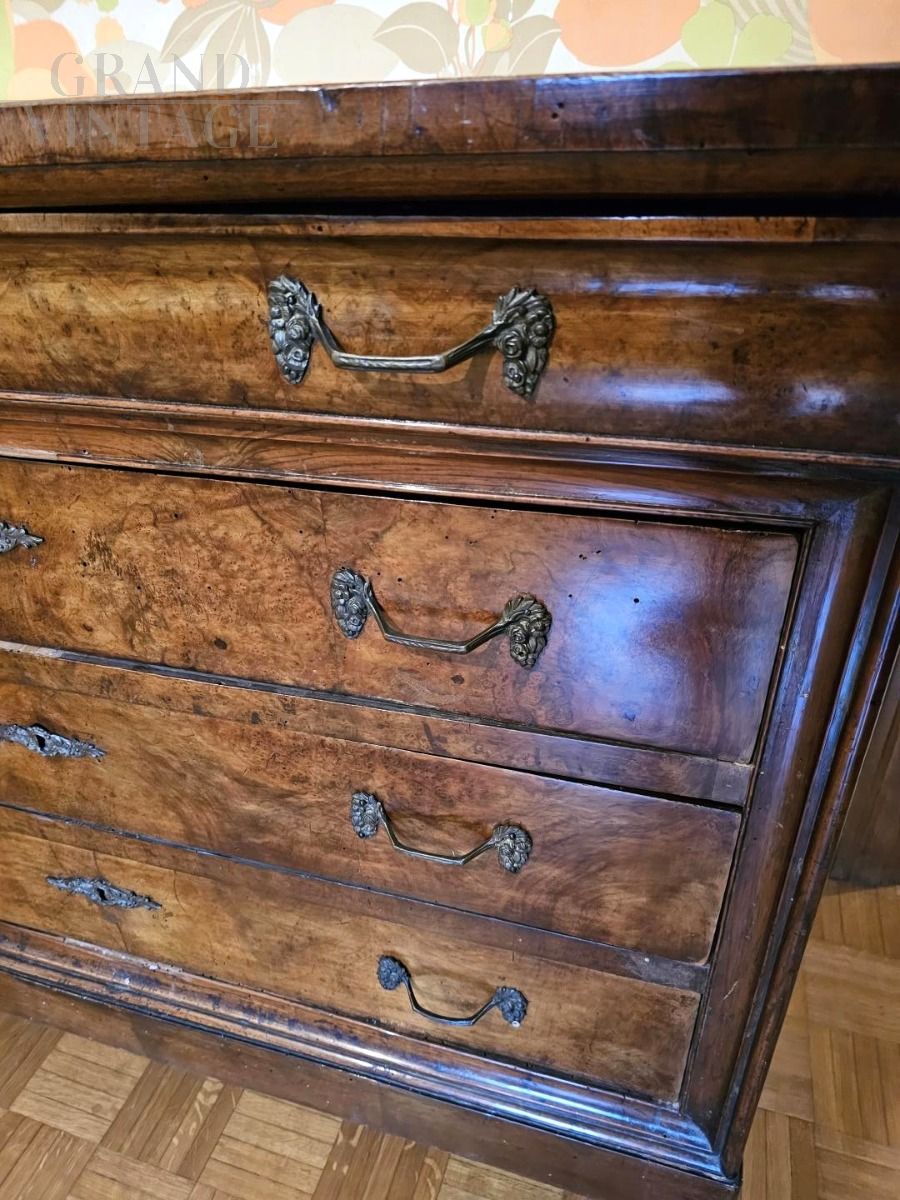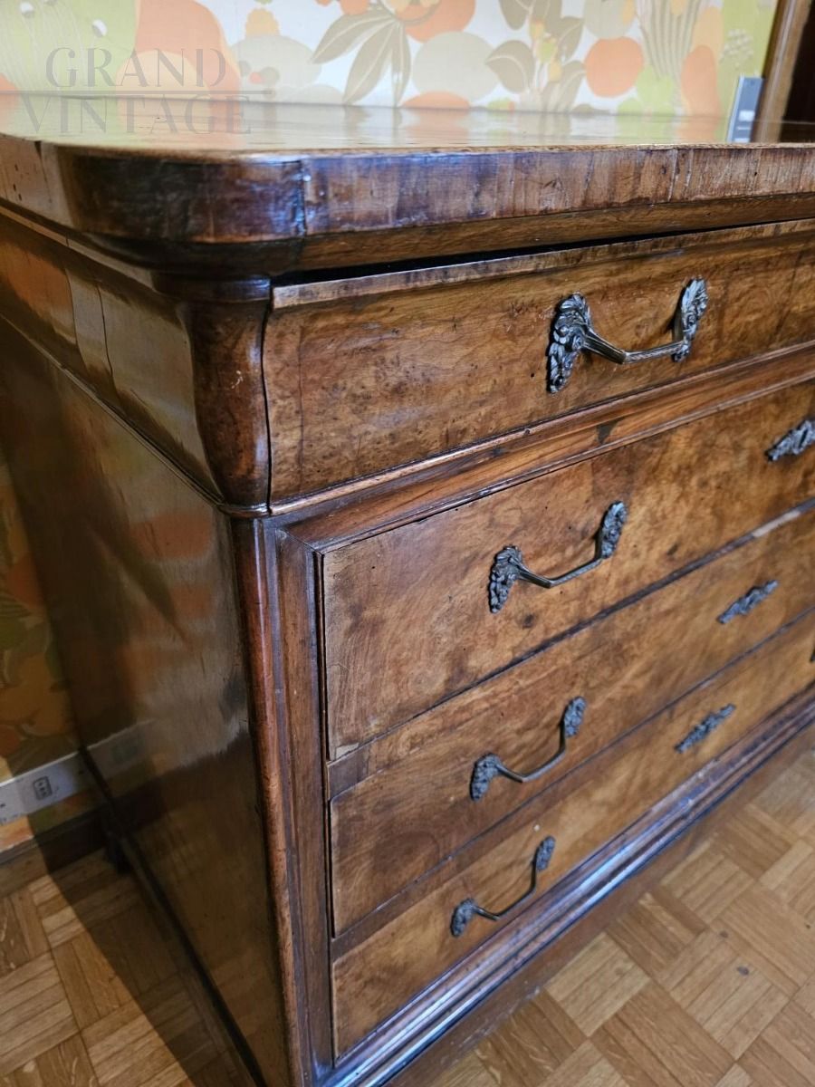 Comò canterano antico del XVII secolo in pregiata finitura in legno di noce e radica di noce, dotato di 3 cassetti profondi più un cassetto nella parte alta del mobile. I cassetti sono di ottima fattura e in ottimo stato. Struttura integra e perfettamente stabile, che appoggia su quattro piedi a cipolla. Piano superiore di appoggio in ottimo stato di conservazione e con finitura originale, probabilmente si tratta di un'asse unica. Legno integro e senza evidenti segni di deterioramento.