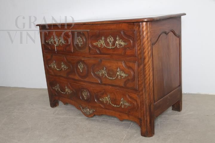 Antico cassettone comò provenzale in noce massello di fine '700 dalla bellissima linea mossa, con tre cassetti finemente intagliati e magnifiche maniglie in bronzo. Restaurato in maniera conservativa con finitura a cera d'api.