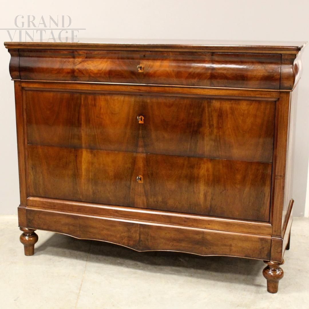 Cassettone cappuccino Luigi Filippo in noce massello e lastronato in noce, epoca metà '800, provenienza Italia - Emilia Romagna, restaurato.