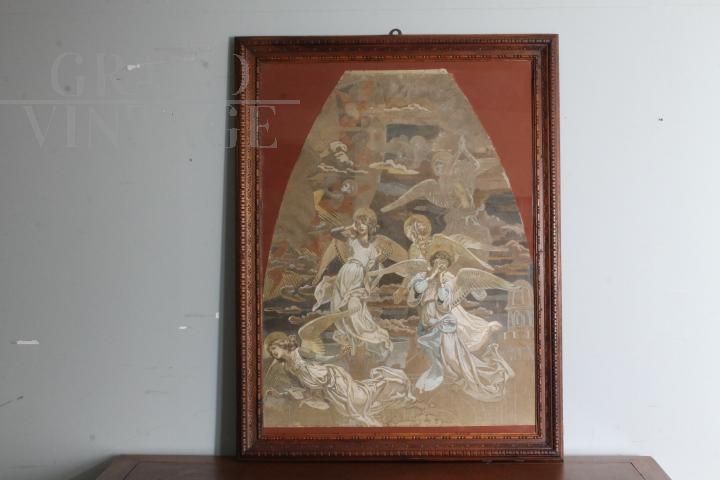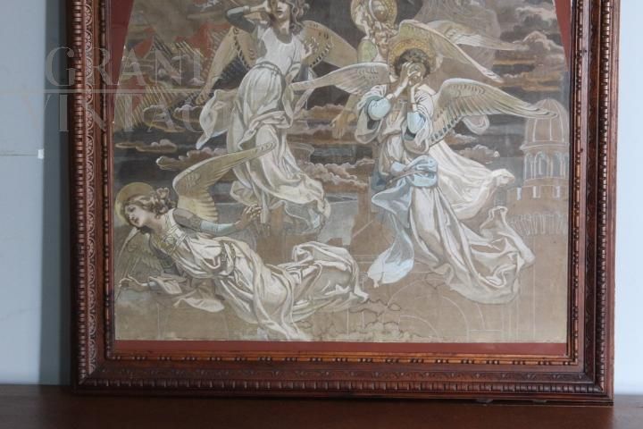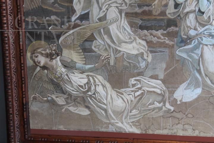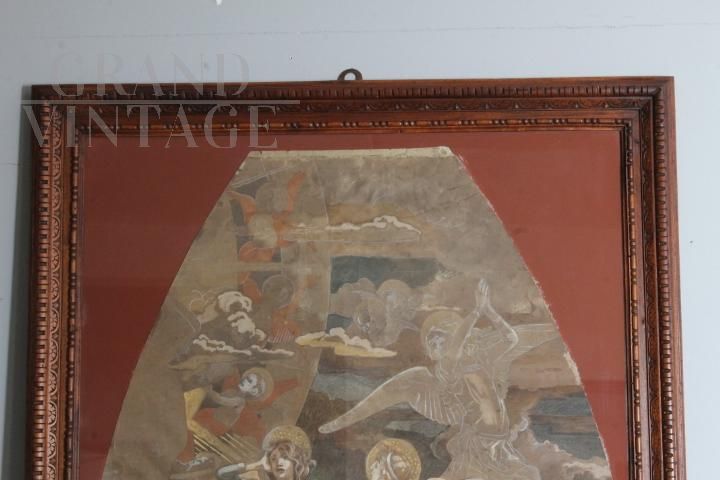 Dipinto antico realizzato a tempera raffigurante angeli con architetture sullo sfondo, si tratta di un bozzetto preparatorio per un affresco della fine del XIX secolo, di grande qualità, in cornice antica intagliata di noce.