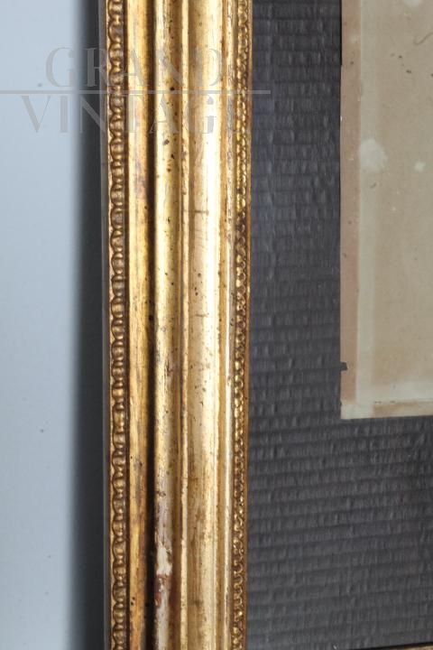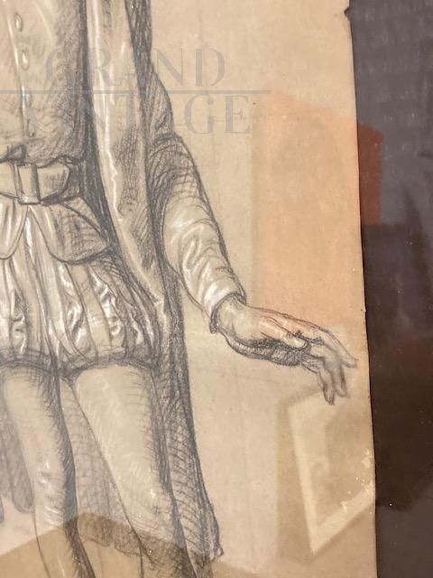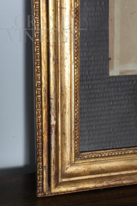 Antico disegno del XIX secolo con bozzetto di personaggio nobile in costume d’epoca, in cornice antica coeva in foglia d'oro coeva. Ottimo stato di conservazione.