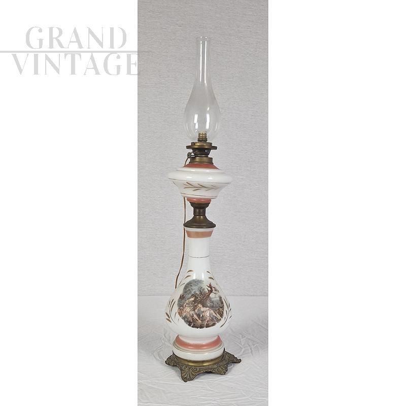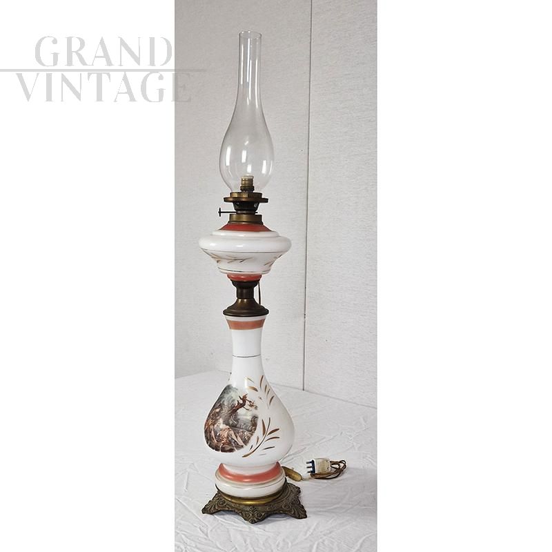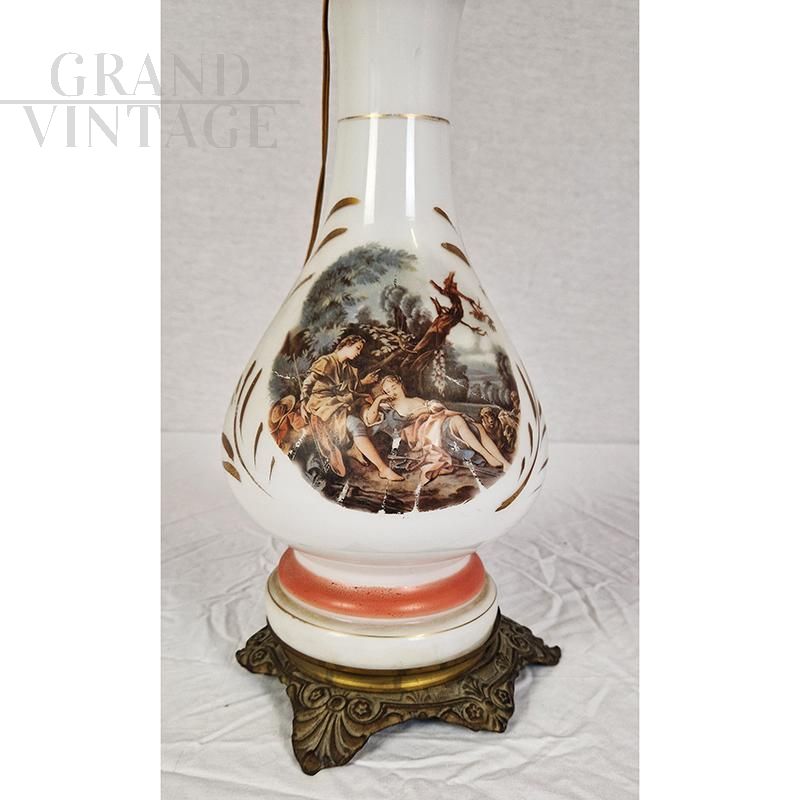 Antico lume elettrificato in bronzo e vetro di Murano dipinto a mano