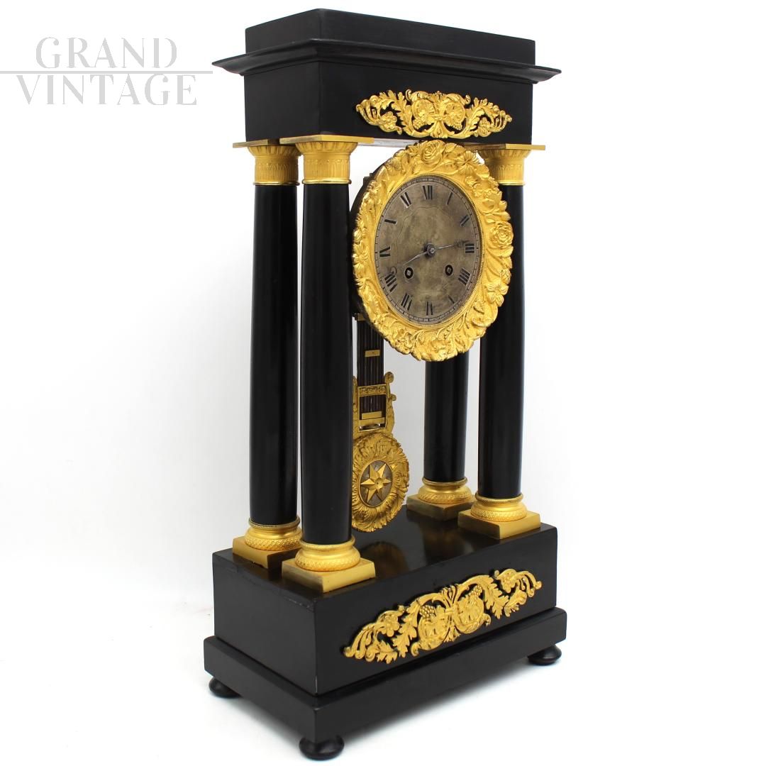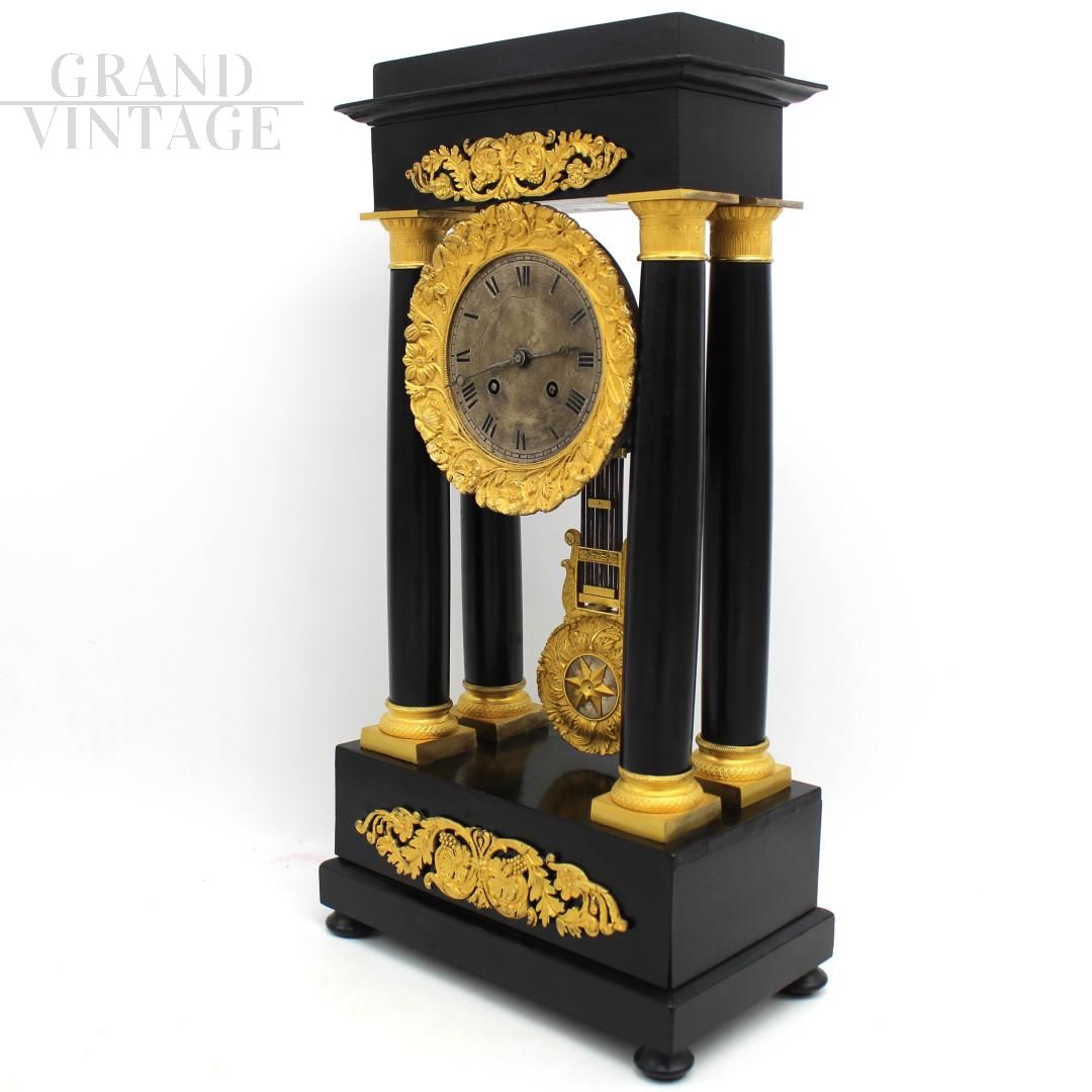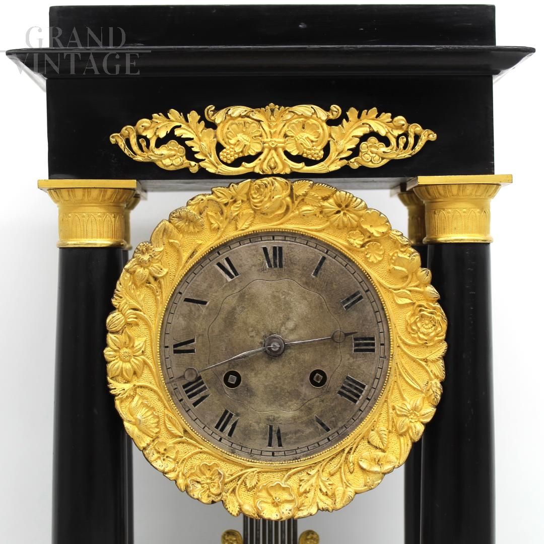 Orologio a pendolo Impero in legno ebanizzato, completo di bronzi dorati, doratura al mercurio, epoca primi '800 - Impero (periodo Restaurazione), provenienza Francia.