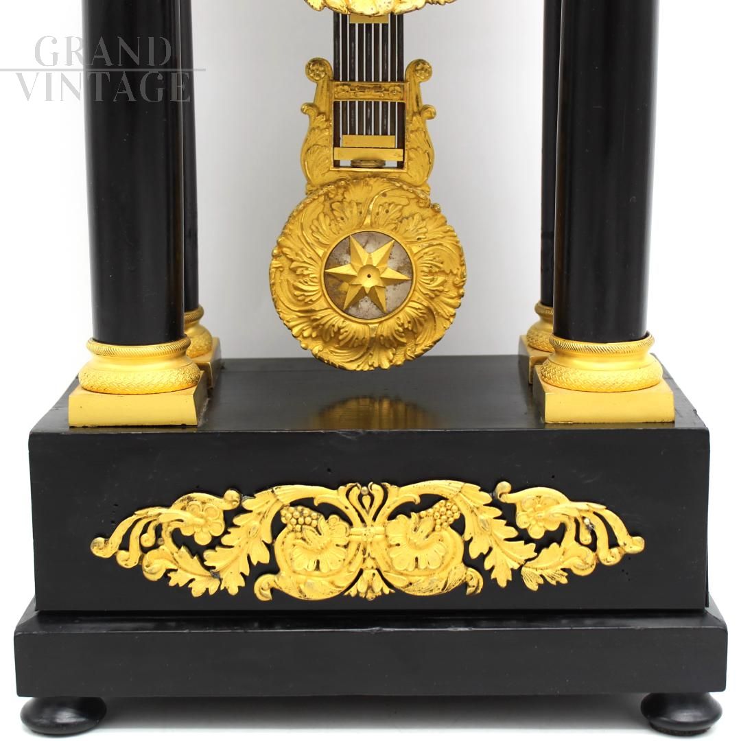 Antico orologio a pendolo portico Impero in legno e bronzo dorato, 1800