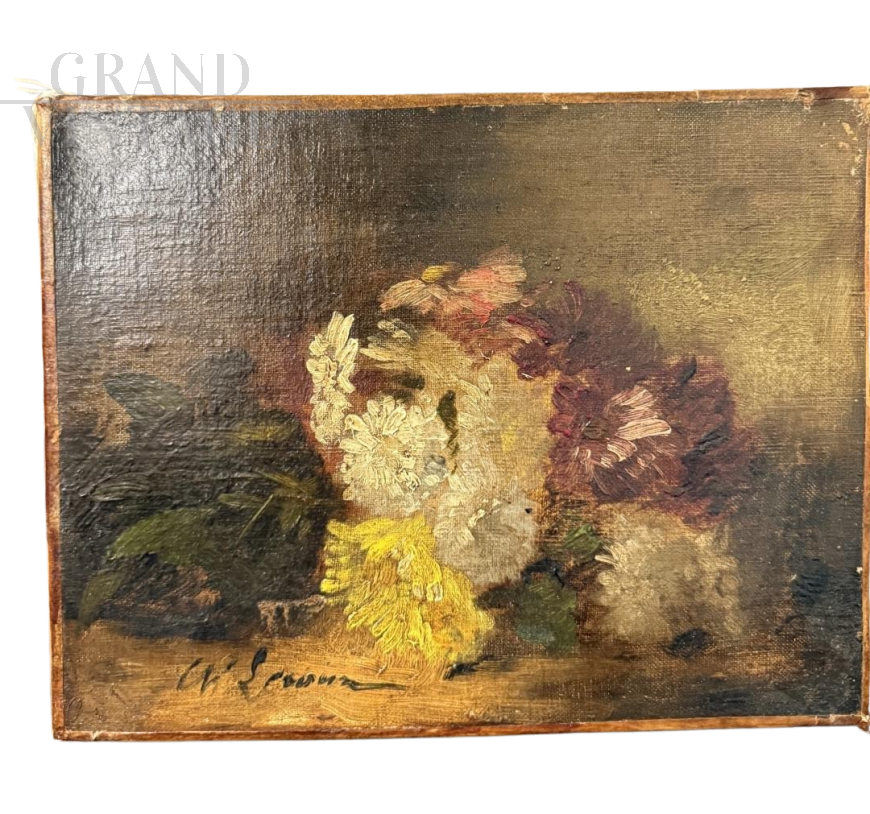 Antico piccolo dipinto ad olio su tela raffigurante natura morta con fiori, XIX secolo, 29 x 39cm, di bella qualità e in buono stato conservativo. Firmato.