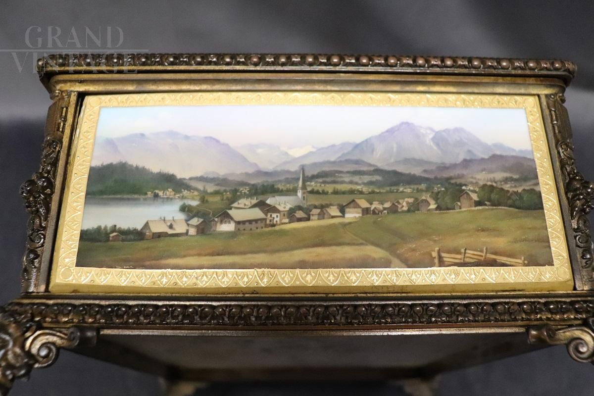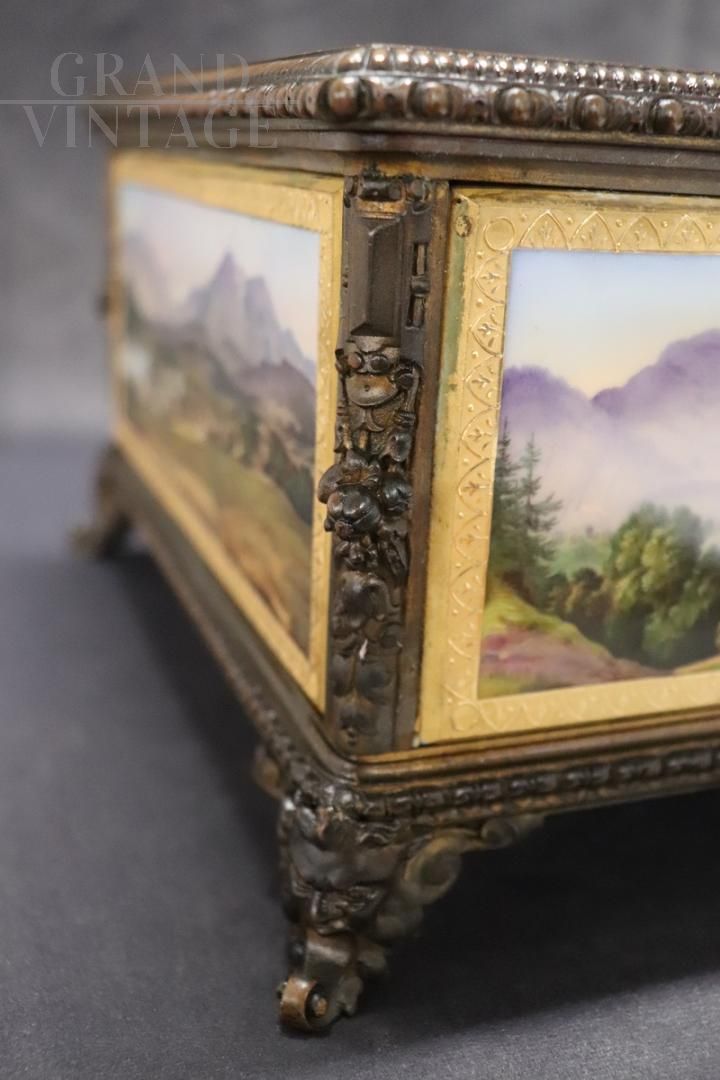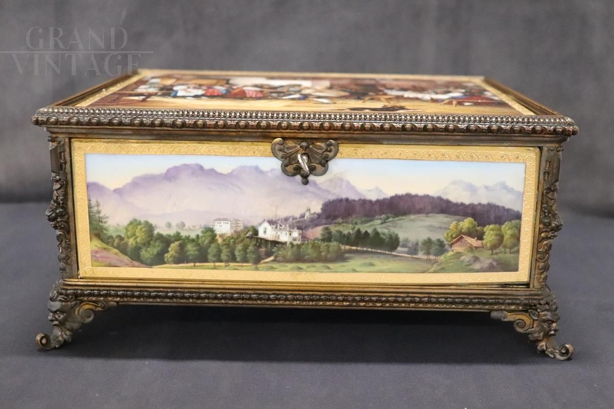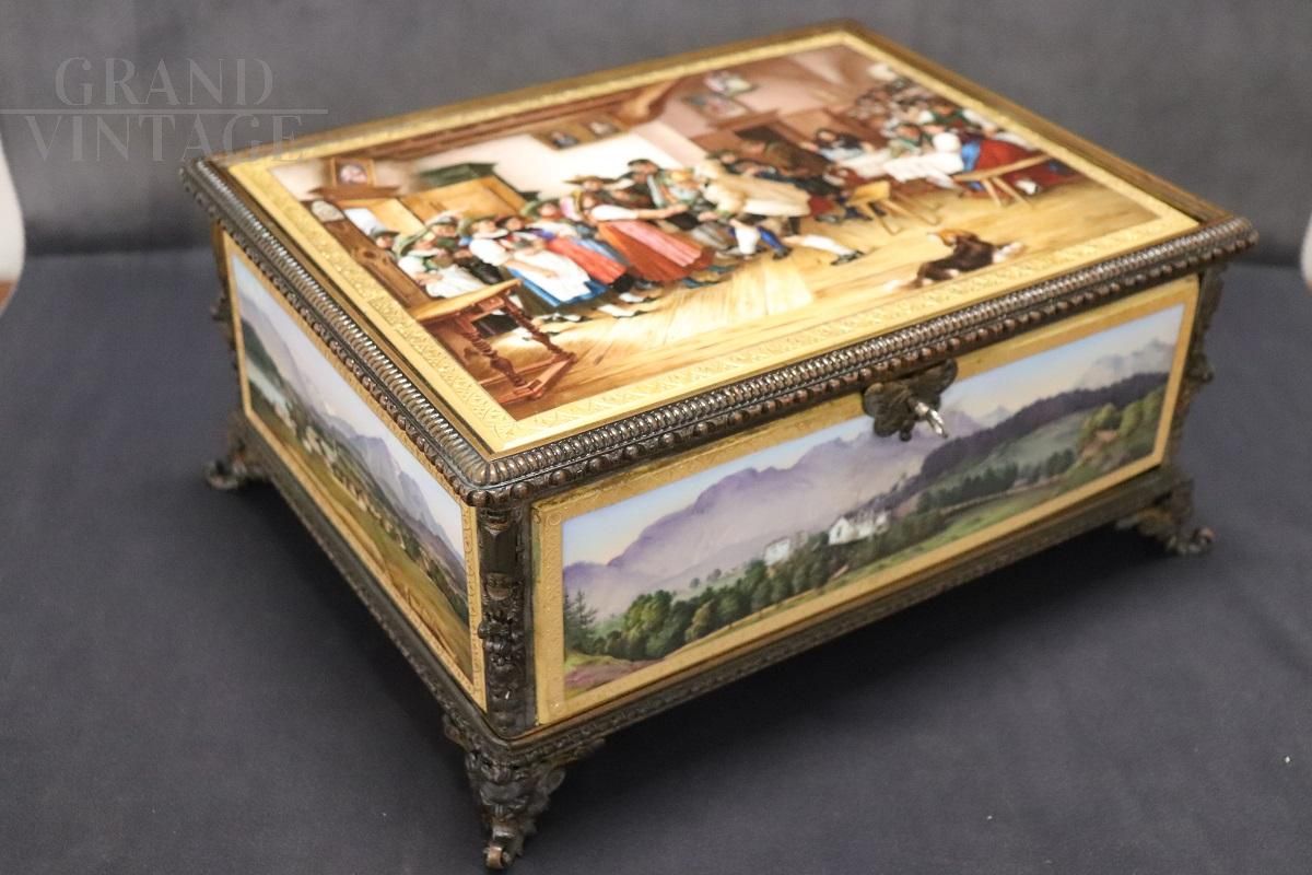 Davvero raro questo antico portagioie rettangolare finemente decorato, prodotto dalla manifattura tedesca di porcellana KPM, intorno al 1870. Il marchio KPM è inciso all’interno. Realizzato con una struttura di bronzo finemente cesellato che ha acquisito una bella patina antica. Ogni lato di questo portagioie è una vera opera d’arte con porcellana dipinta a mano. Sul coperchio troviamo una scena animata all'interno di una taverna con molti personaggi, la scena è tratta da un dipinto dell’artista tedesco Franz Von Defregger “Ball auf der Alm”. Ogni lato è finemente dipinto a mano con splendidi paesaggi austriaci, sotto i quali un’iscrizione identifica la località. Questo cofanetto è un perfetto esempio dell’alta qualità artistica raggiunta dalla manifattura di porcellane KPM.