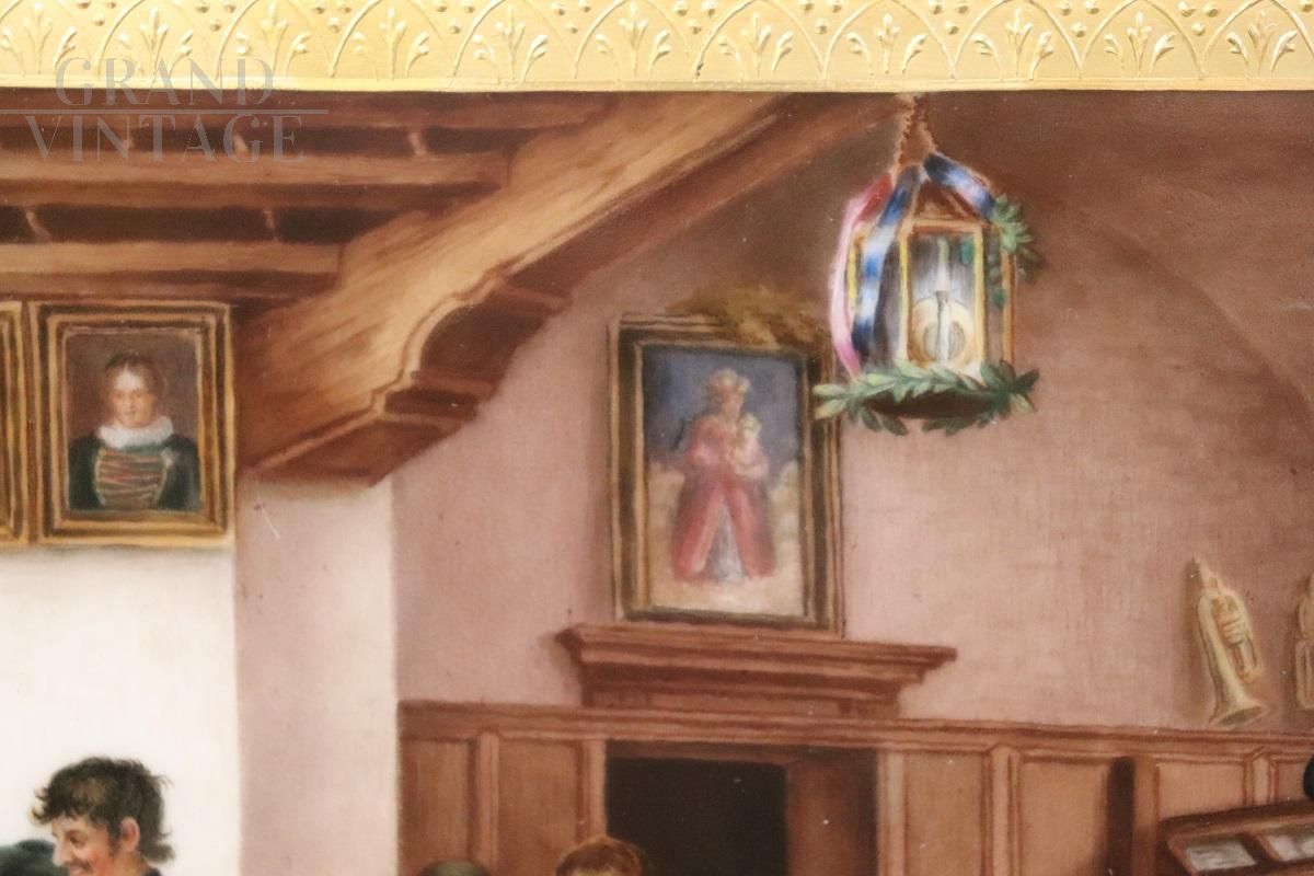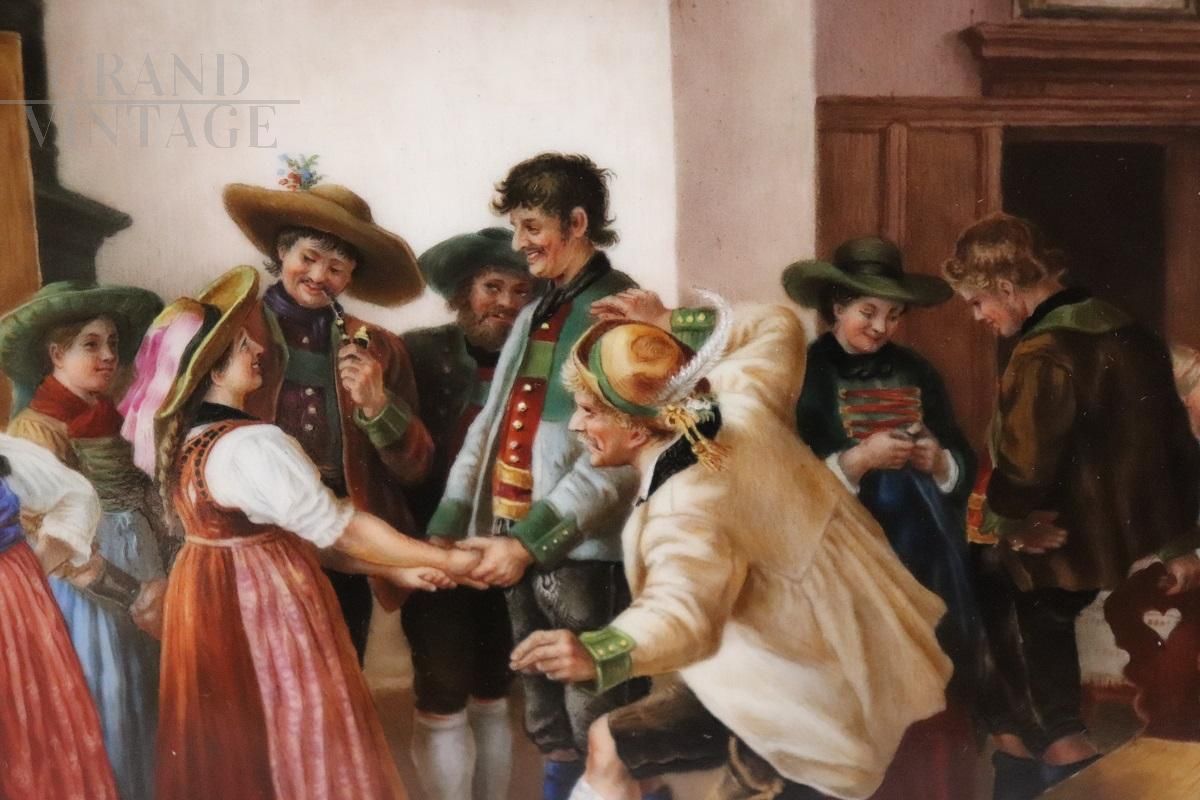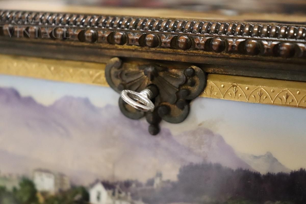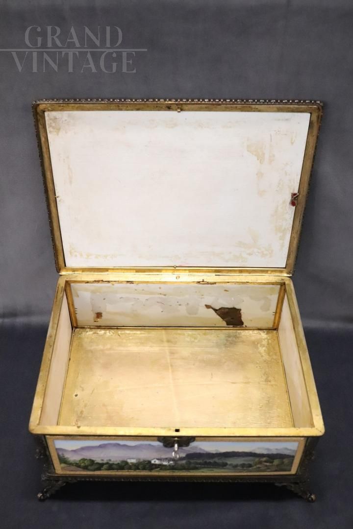 Davvero raro questo antico portagioie rettangolare finemente decorato, prodotto dalla manifattura tedesca di porcellana KPM, intorno al 1870. Il marchio KPM è inciso all’interno. Realizzato con una struttura di bronzo finemente cesellato che ha acquisito una bella patina antica. Ogni lato di questo portagioie è una vera opera d’arte con porcellana dipinta a mano. Sul coperchio troviamo una scena animata all'interno di una taverna con molti personaggi, la scena è tratta da un dipinto dell’artista tedesco Franz Von Defregger “Ball auf der Alm”. Ogni lato è finemente dipinto a mano con splendidi paesaggi austriaci, sotto i quali un’iscrizione identifica la località. Questo cofanetto è un perfetto esempio dell’alta qualità artistica raggiunta dalla manifattura di porcellane KPM.