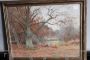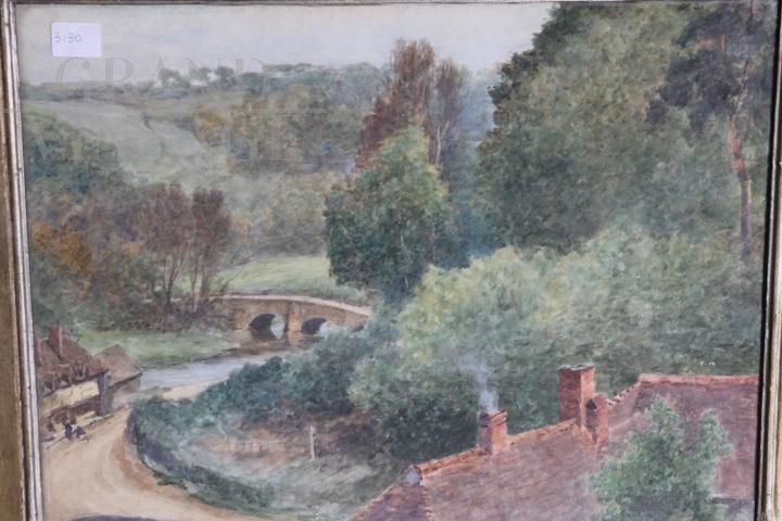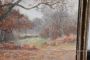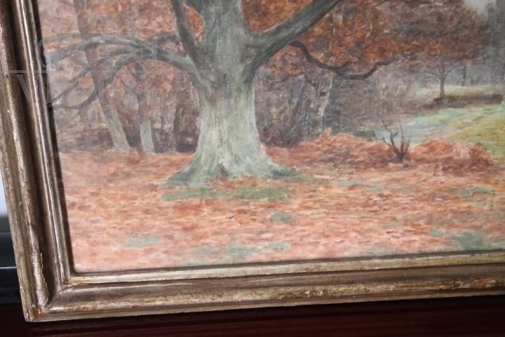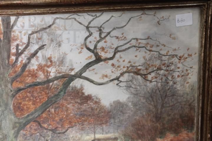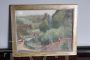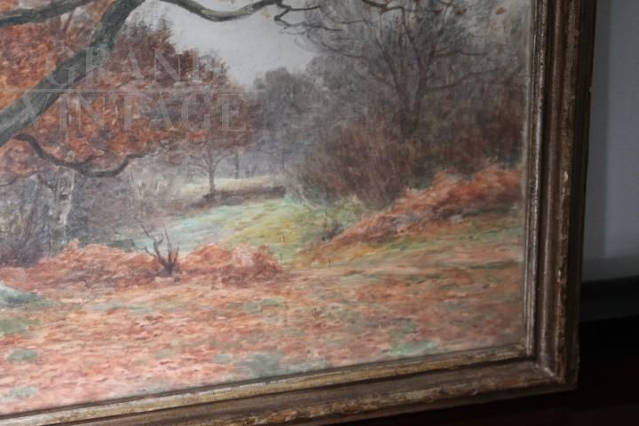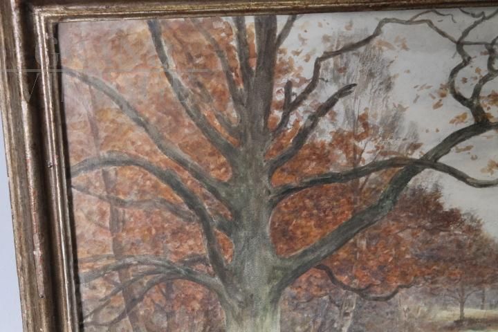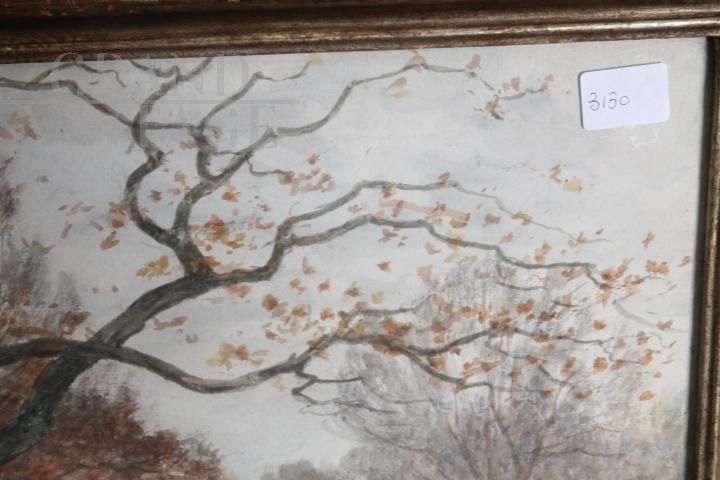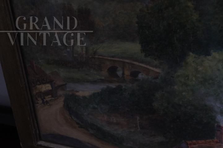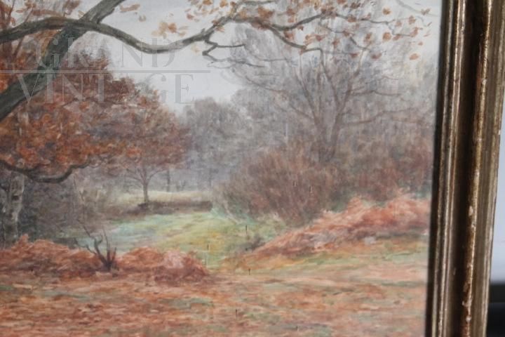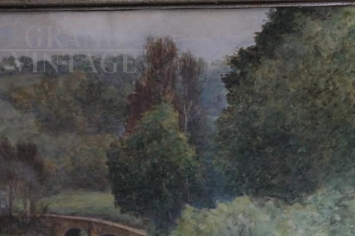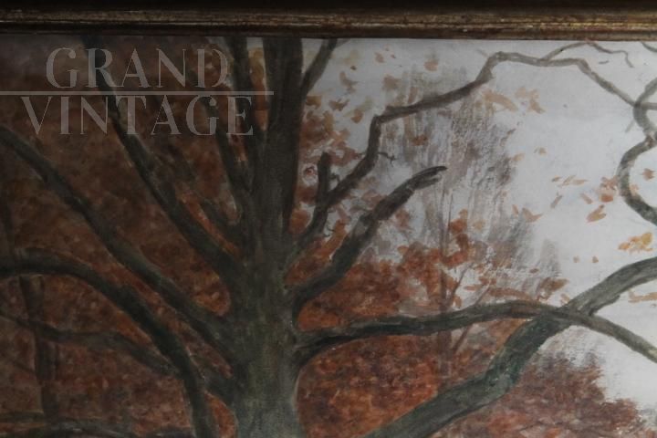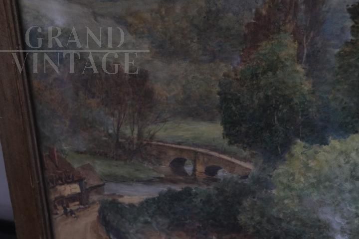 Antico dipinto ad acquerello antico bifacciale raffigurante paesaggi, da una parte vi è un paesaggio autunnale con alberi, dall'altro ha un paesaggio con ponte, natura primaverile o estiva e case rurali. Di bellissima fattura e unico nel suo genere. XIX secolo.