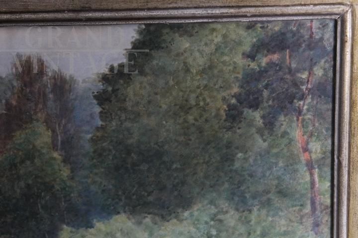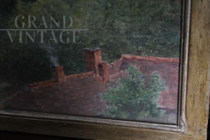 Antico raro dipinto bifacciale con paesaggi ad acquerello, XIX secolo