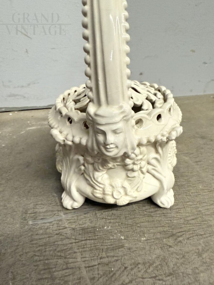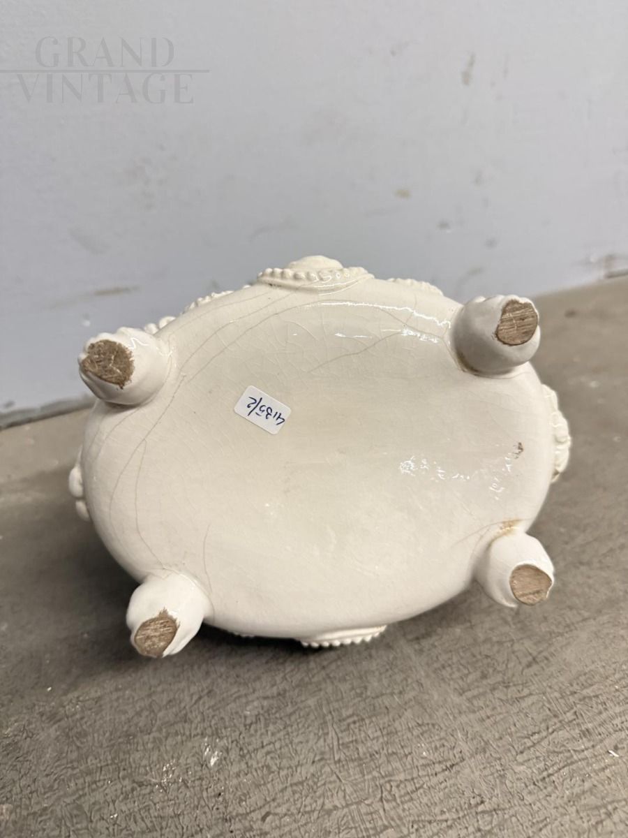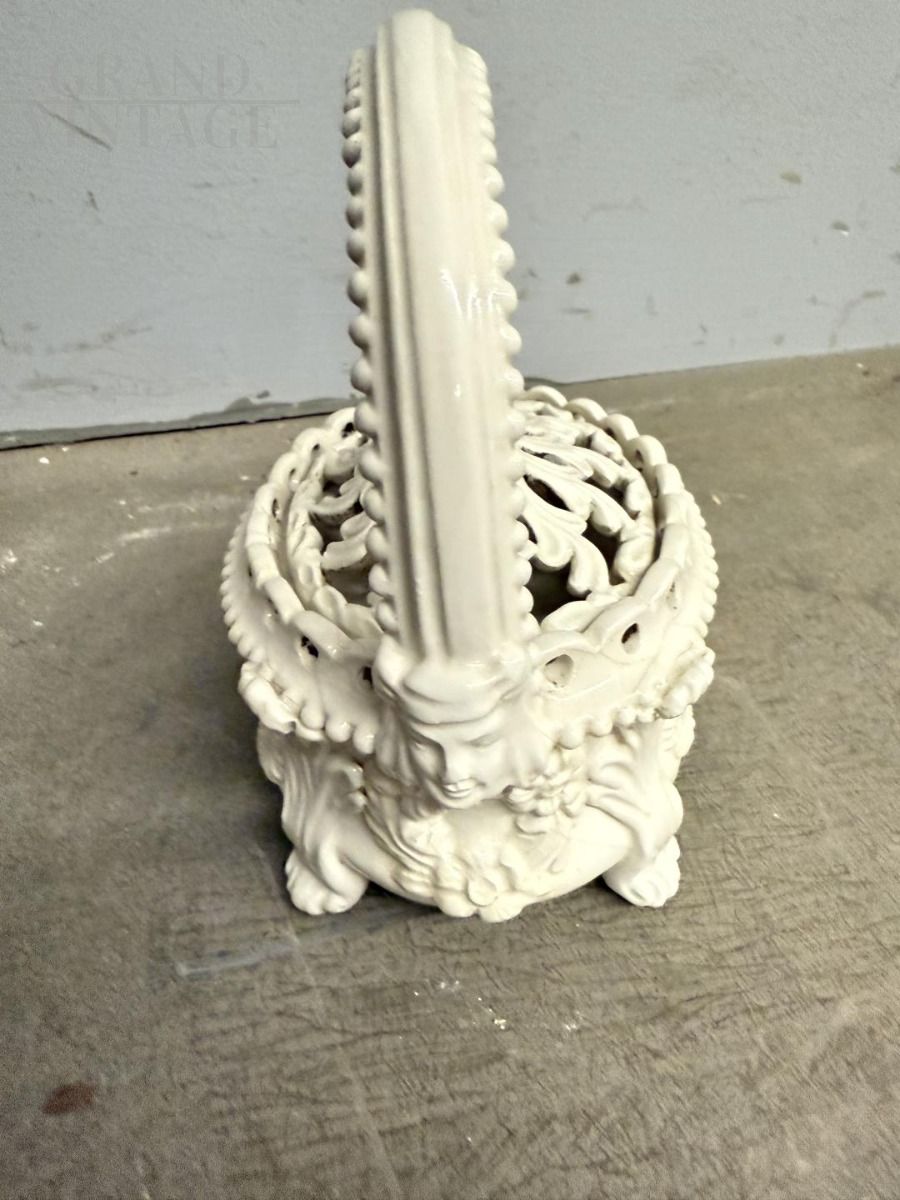 Antico scaldino cestino in ceramica smaltata bianca con lavorazione a rilievo e traforata, realizzato nei primi dell'800, 22 x 40 x 14 cm.
