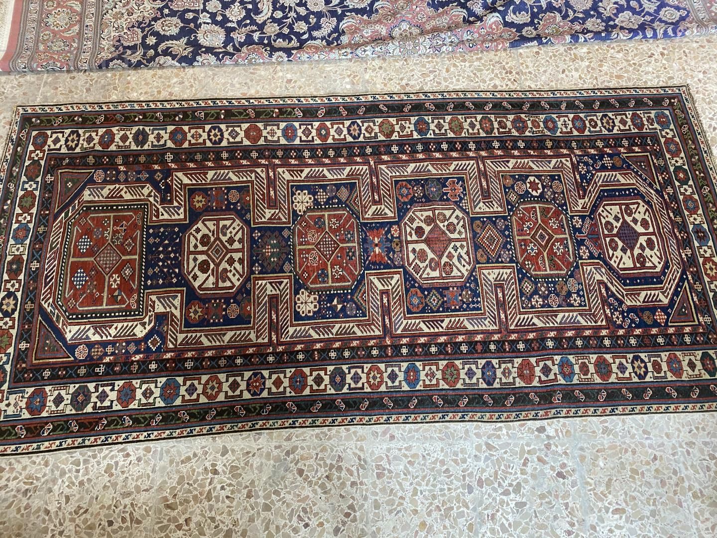 Tappeto caucasico della seconda meta’ dell’800, stato di conservazione ottimo, trama ordito e vello in lane policrome colorate vegetalmente. Tappeto corredato di certificato di autenticità’ rilasciato da perito della camera di commercio di Milano.