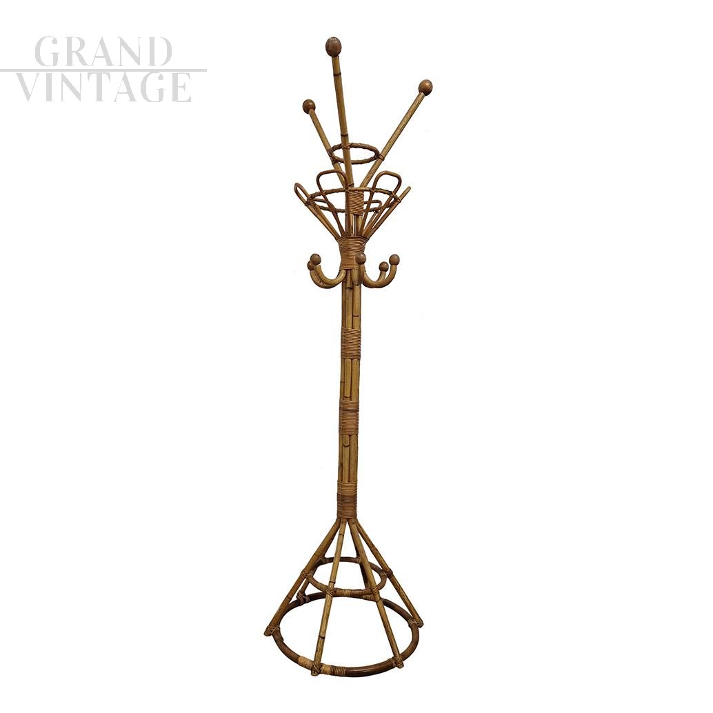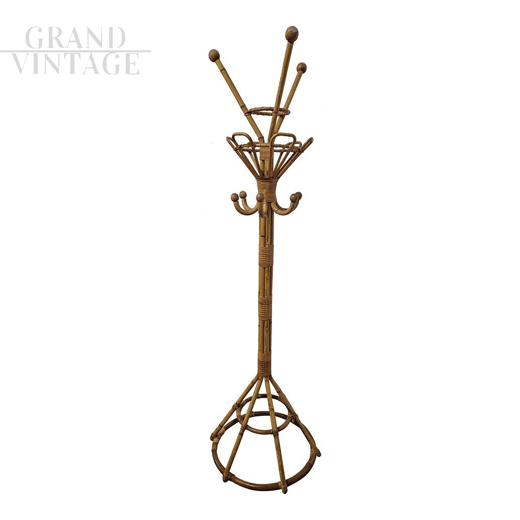 Appendiabiti a piantana in bamboo e rattan a tre aste alte con finale con palline di bamboo e sei ganci più bassi.
