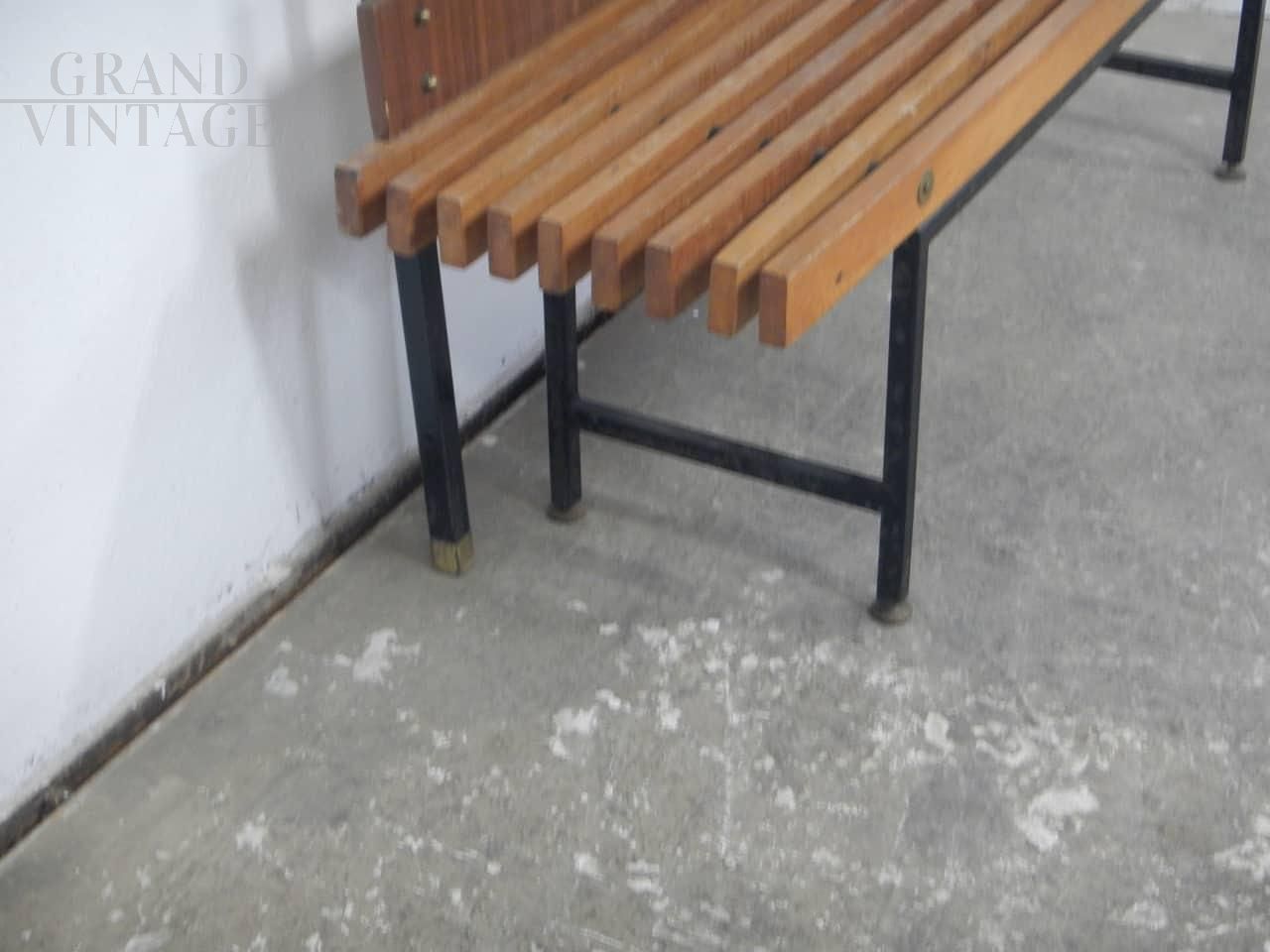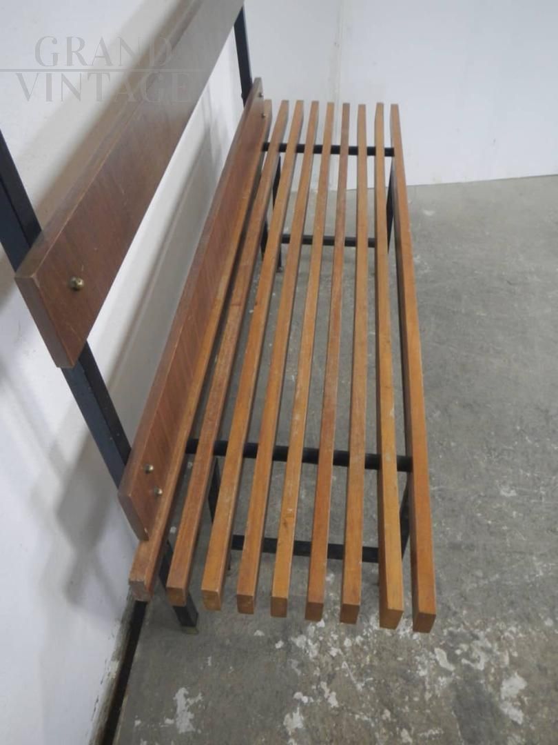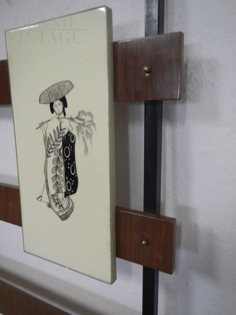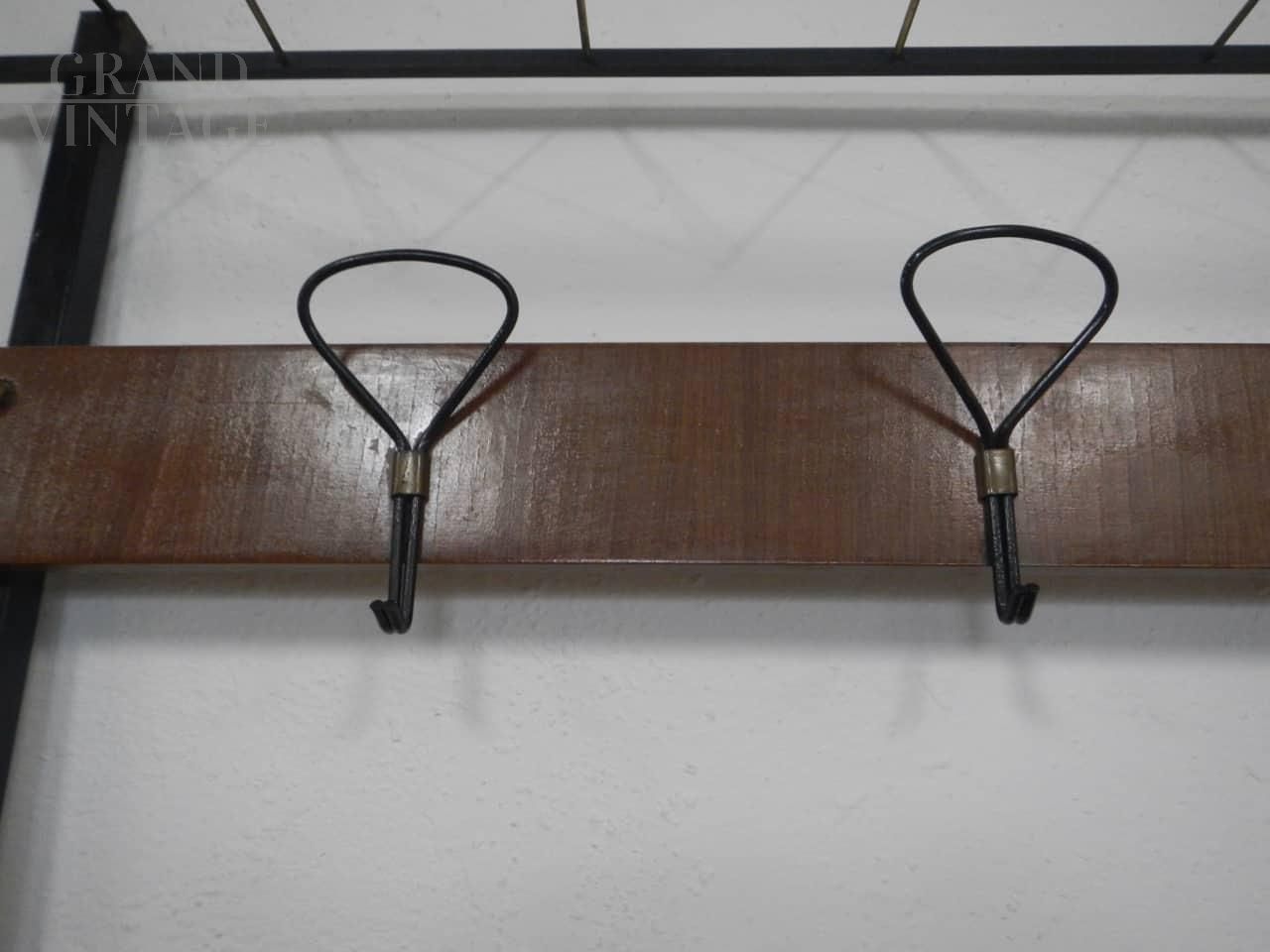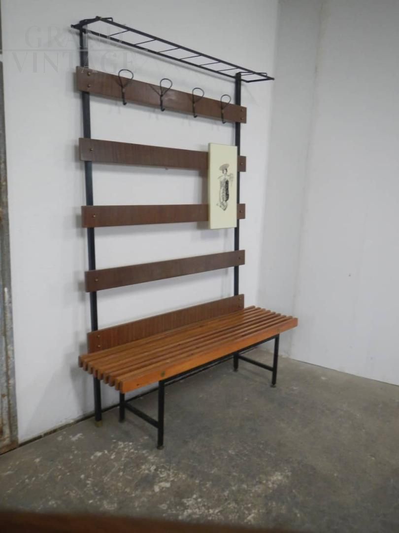 Attaccapanni da ingresso vintage con panca realizzato in legno di frassino e noce tinto marrone, dotata di 4 ganci e cappelliera in ferro nero e un riquadro con disegno chinoiserie. I pezzi sono separati, la mensola cappelliera è smontabile. La panca è di colore più chiaro dovuto probabilmente all’esposizione alla luce. In buone condizioni.