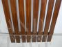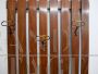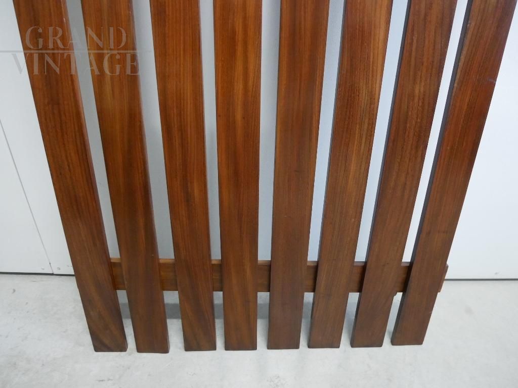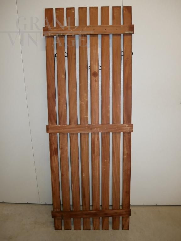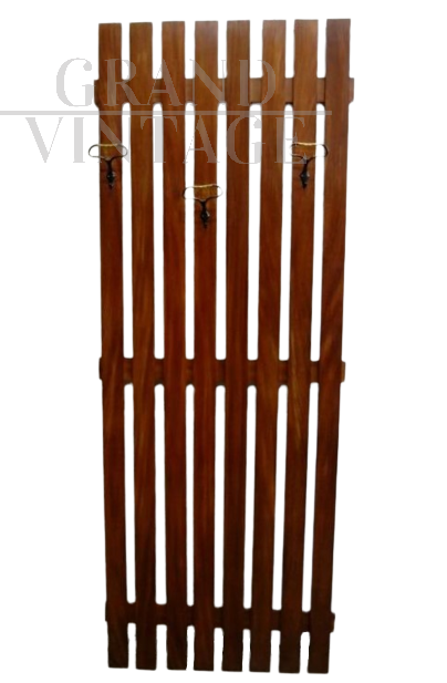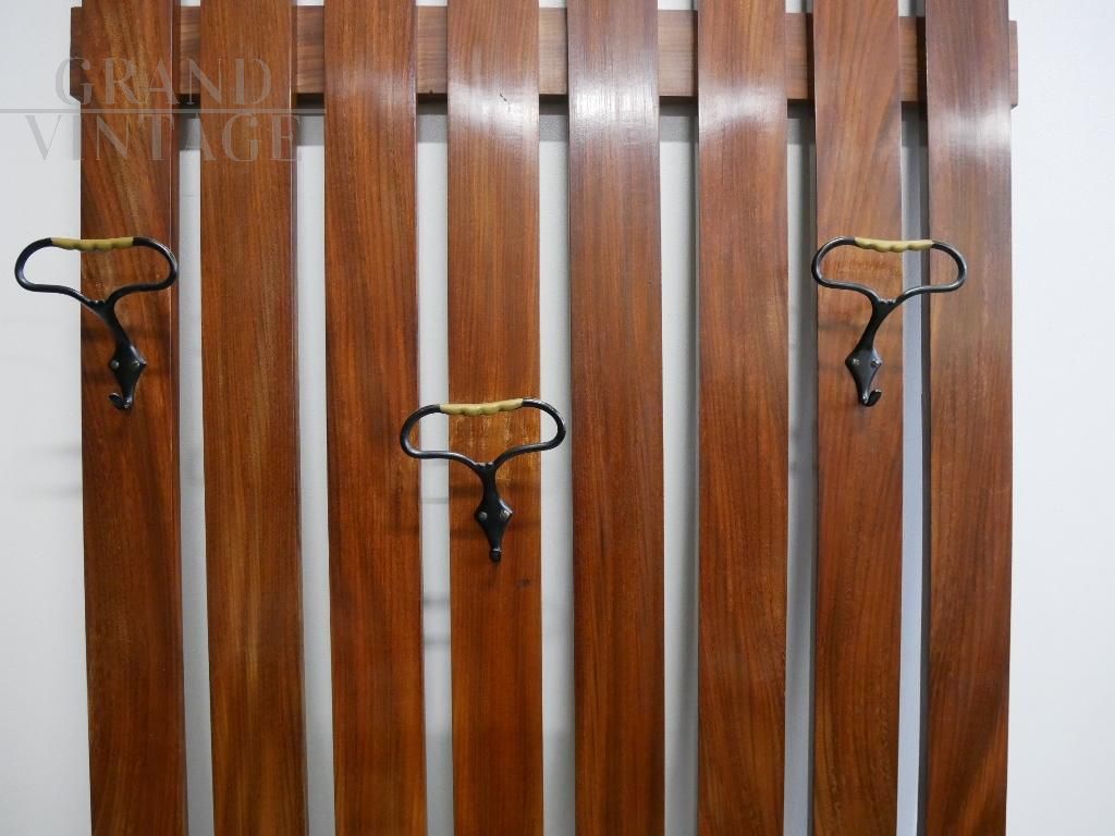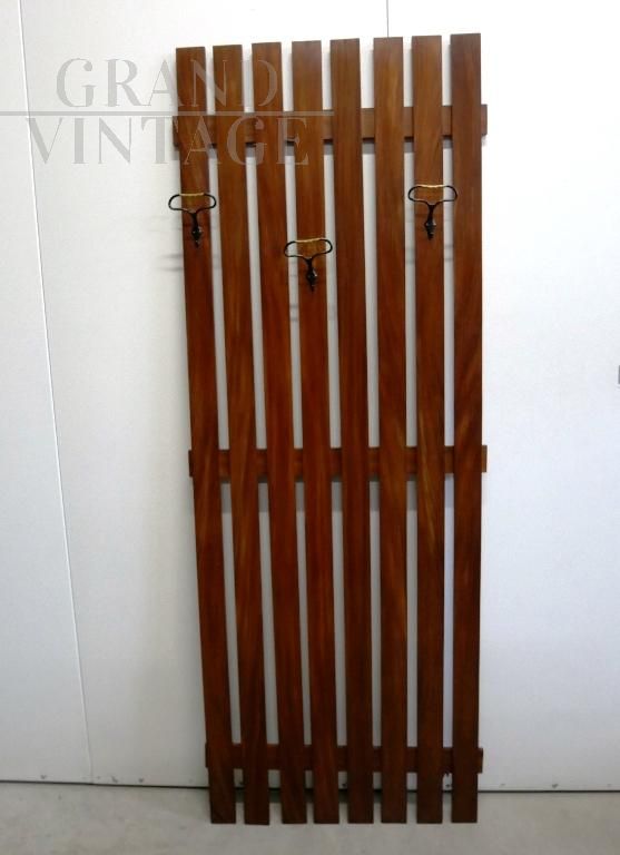 Attaccapanni da muro in legno di teak anni '60 modernariato italiano, modello con otto stecche verticali unite da tre orizzontali avvitate sul retro. L'attaccapanni è completo di tre ganci appendiabiti in metallo nero. L'attaccapanni va appeso al muro nei suoi appositi spazi. In patina originale, ottimo stato di conservazione.