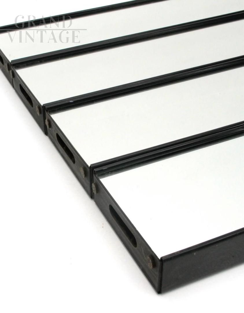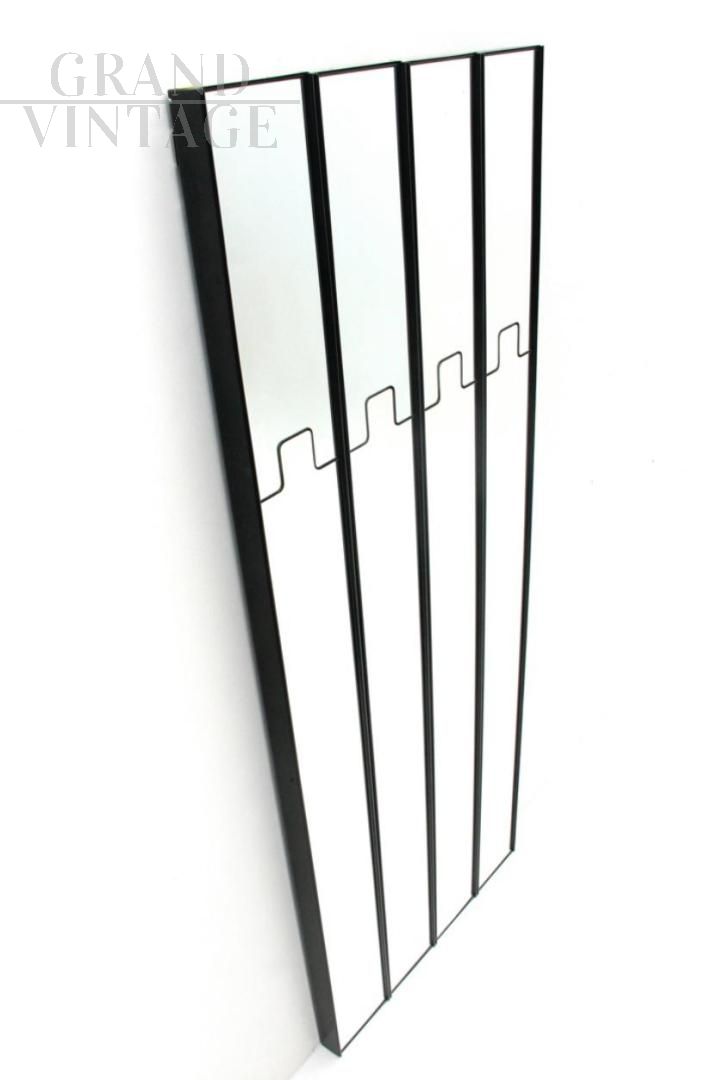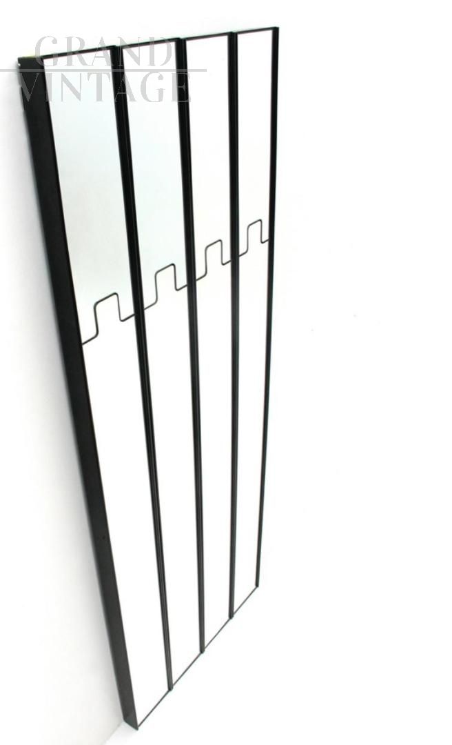 Appendiabiti modulare da ingresso, design Gronda di Luciano Bertoncini per Elco, composto da quattro elementi a specchio, Italia anni '60 - '70. La parte a muro è composta da uno scatolato plastico di colore marrone; il frontale è a due sezioni di specchio, quella superiore rientra a molla per permettere di appendere i capi. La struttura è dotata di due binari per poter appenderla a muro. I quattro elementi ravvicinati misurano circa 80 cm di larghezza. Sono presenti i naturali segni dell'uso.
