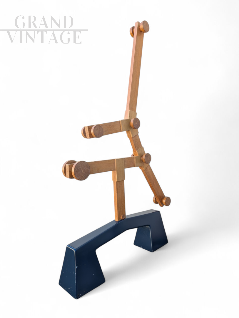 La Base: Realizzata in legno massiccio, è scolpita in una forma geometrica a portale, verniciata in un profondo blu scuro. Questa base solida e angolare contrasta nettamente con la leggerezza della struttura superiore, garantendo al contempo una stabilità impeccabile.