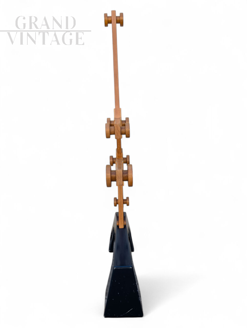 Questo appendiabiti in legno è un pezzo unico e scultoreo che combina estetica moderna e funzionalità. La sua costruzione rivela un'attenzione meticolosa all'equilibrio dei materiali e delle forme. L'appendiabiti è composto da due parti distinte: