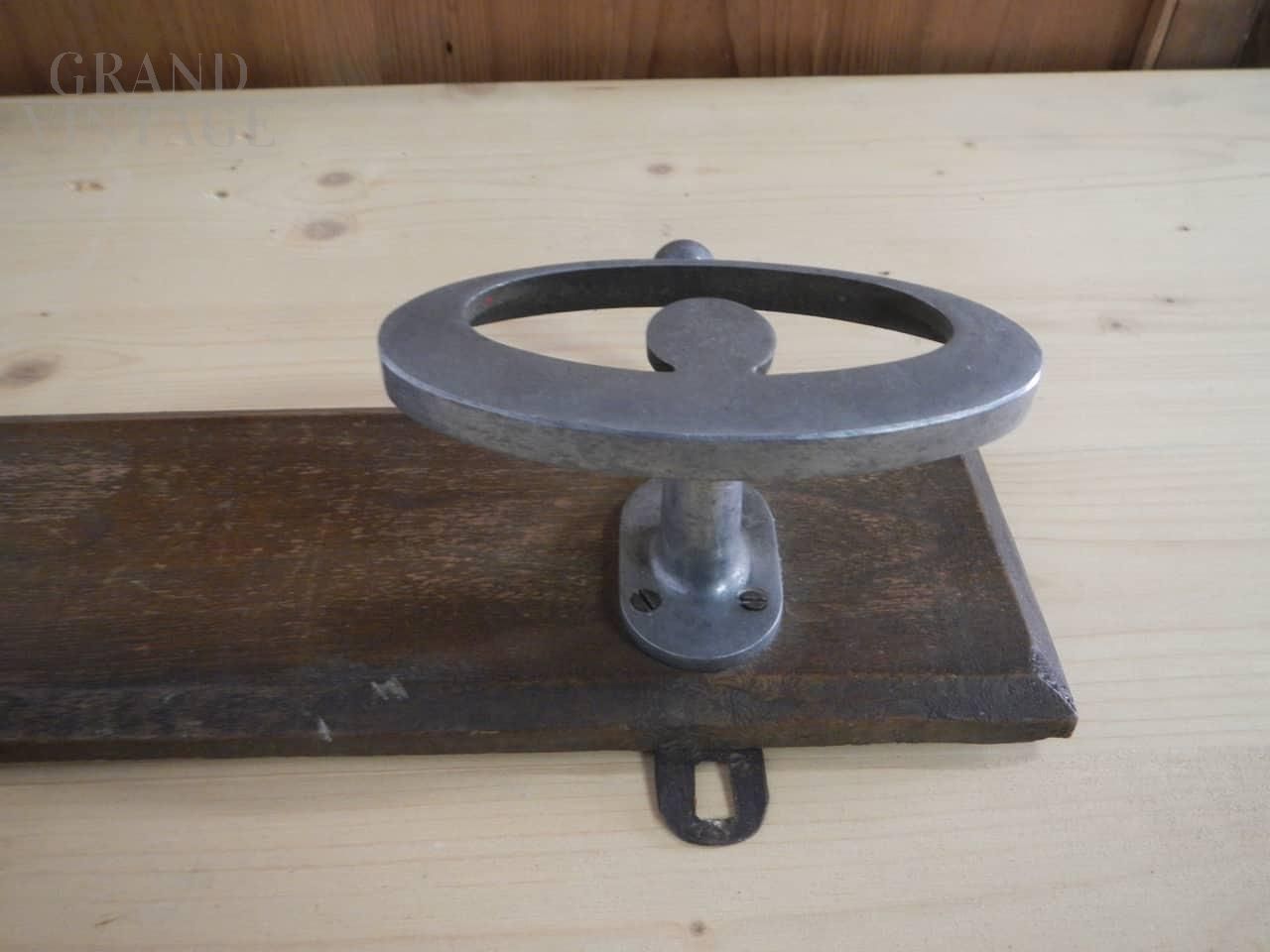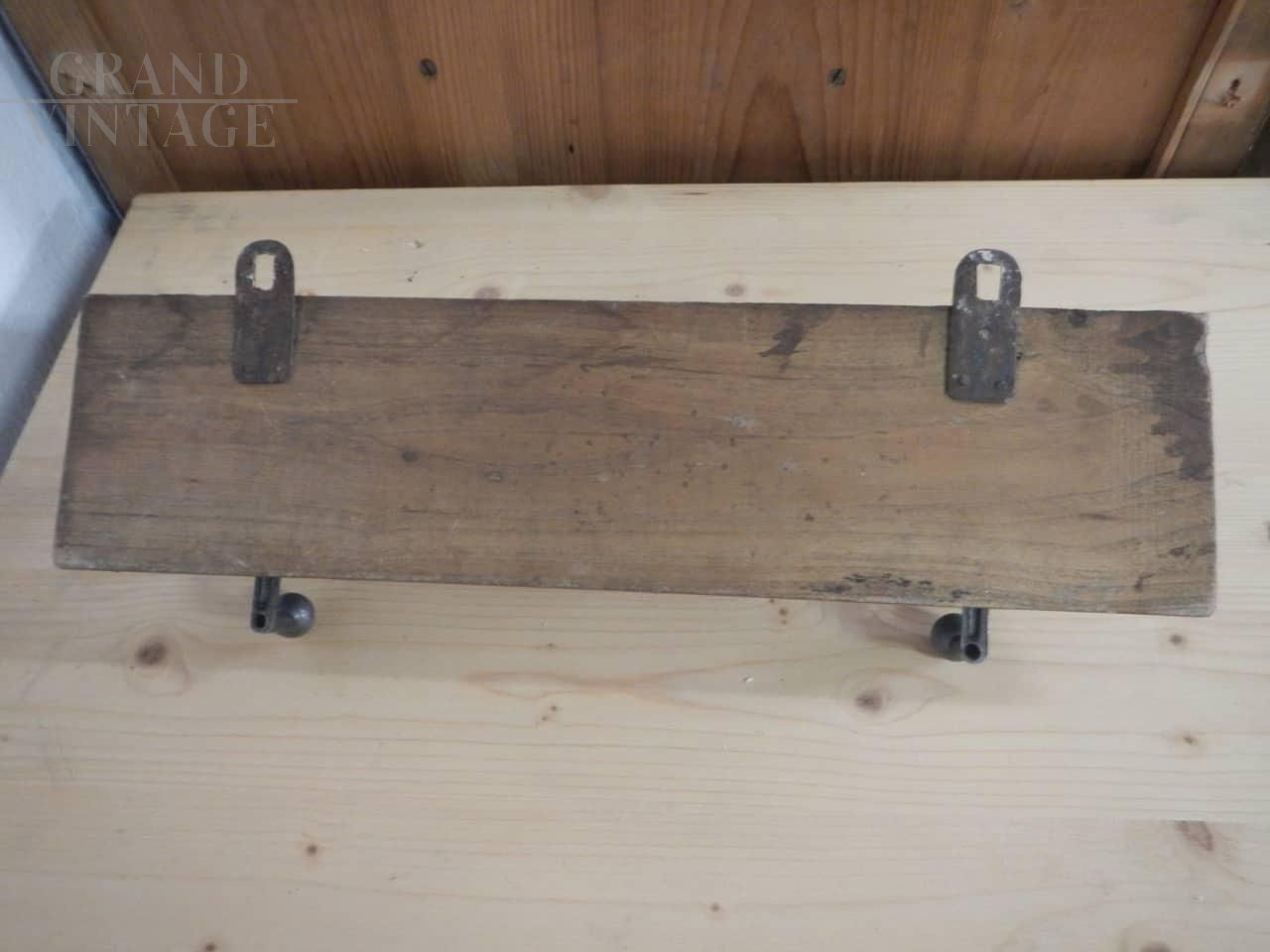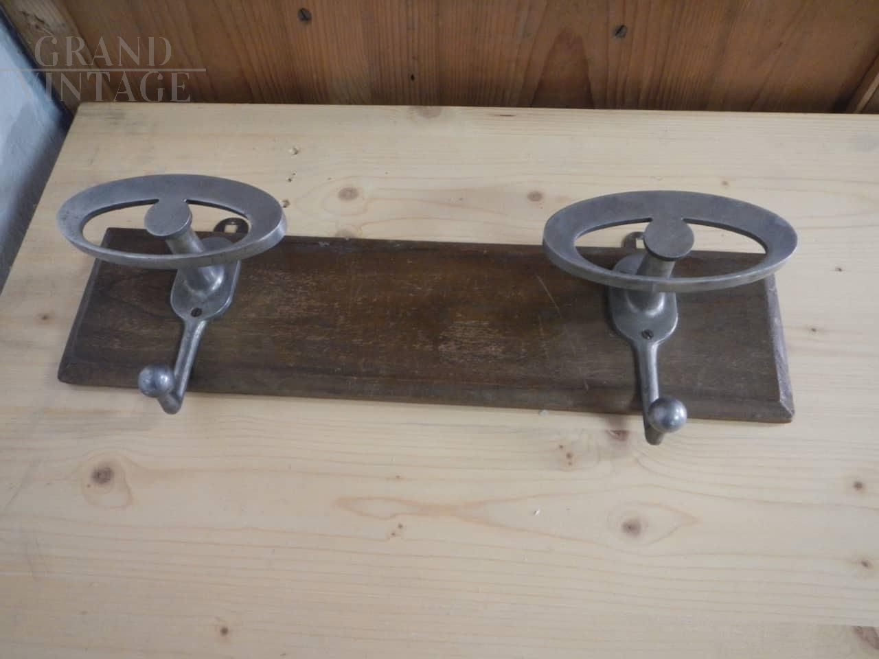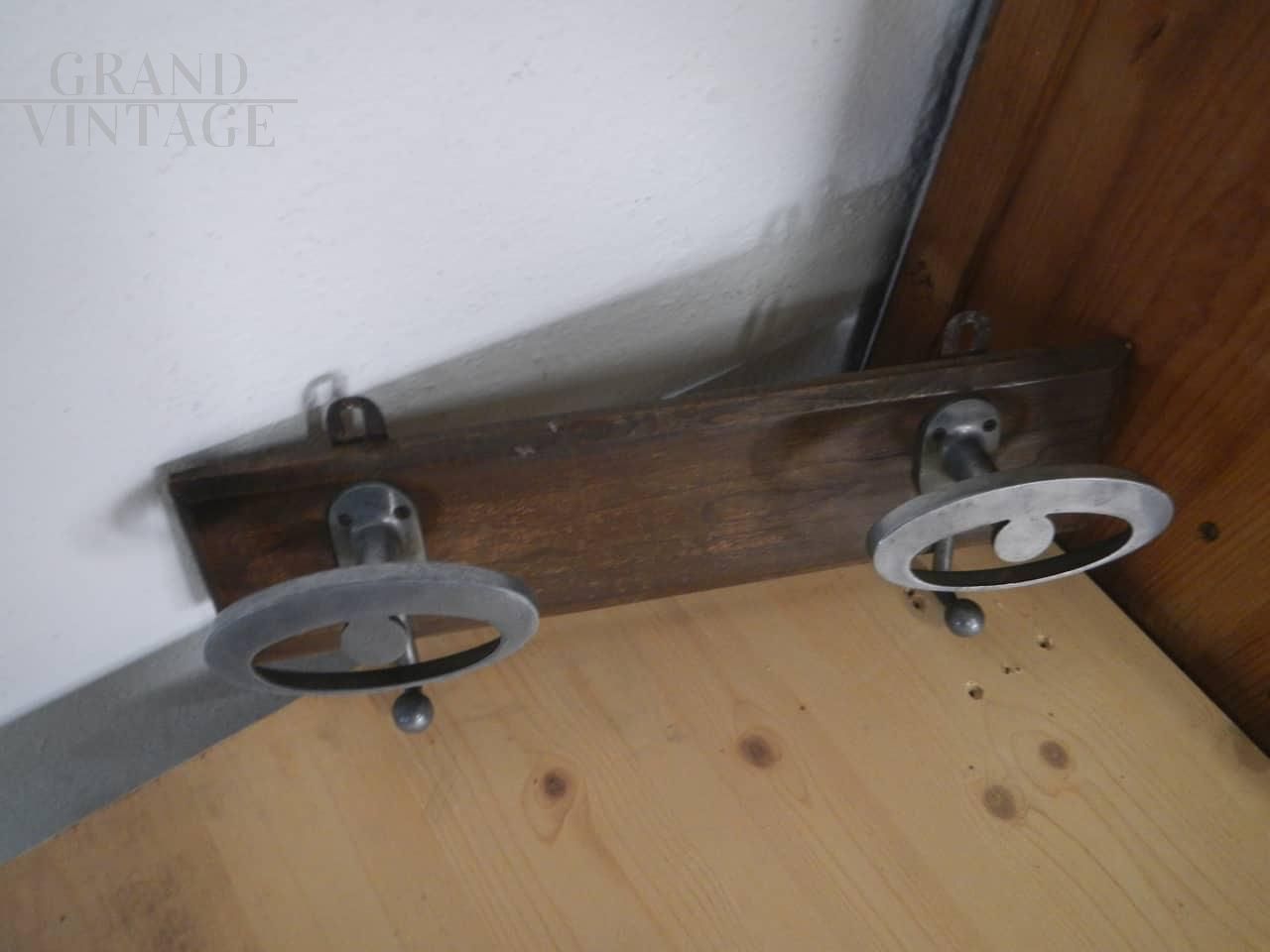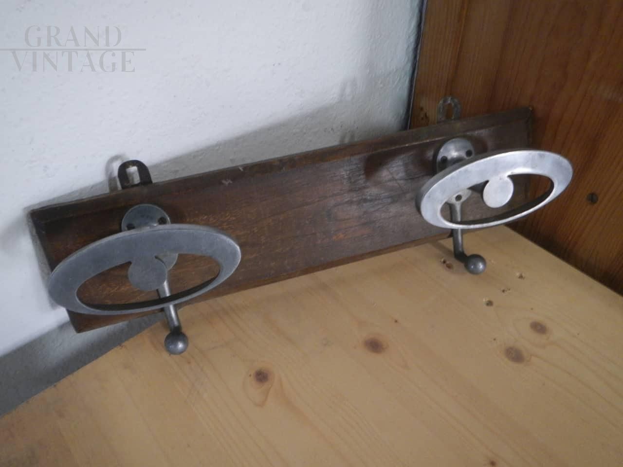 Appendiabiti da parete vintage prodotto da MT in legno di abete con 2 ganci in metallo cromato a forma di occhio. In buone condizioni, piccoli segni d’uso.