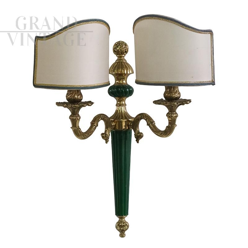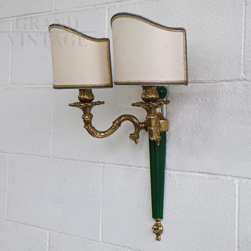 Applique in stile antico con struttura e bracci in metallo dorato con laccatura verde bottiglia e due punti luce con paralumi in tessuto rigido bianco con bordatura verde e oro.