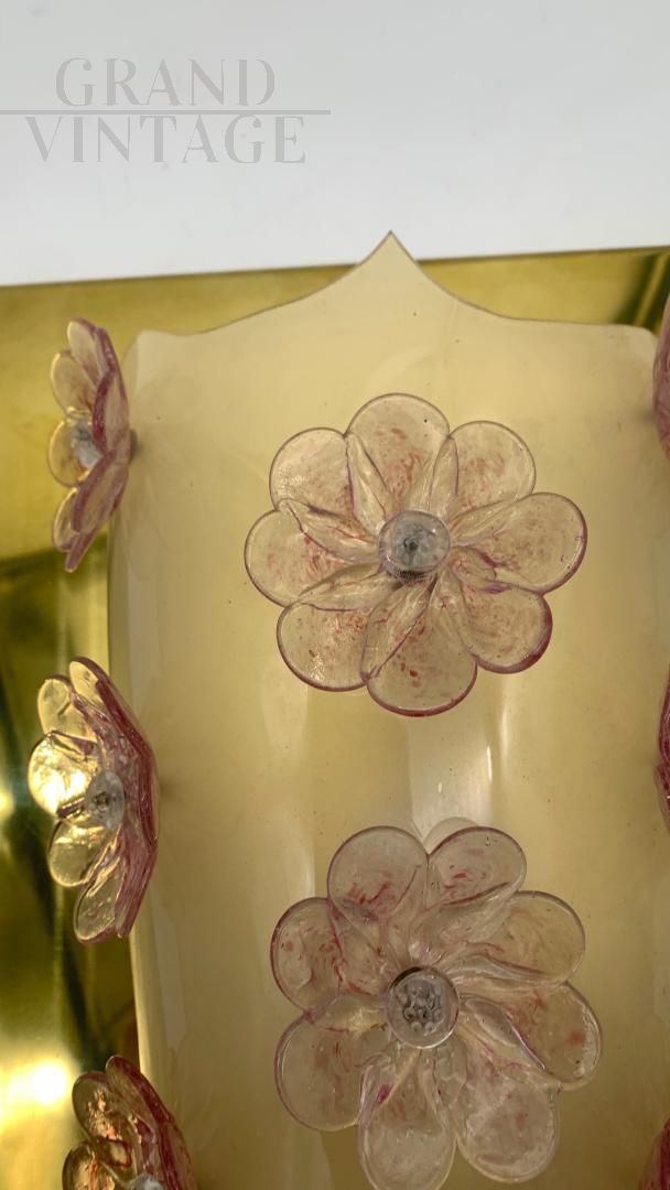 Lampada da parete con base rettangolare in ottone lucido su cui è montata una struttura centrale curva in vetro satinato, molato a mano, decorata con fiori tridimensionali in vetro trasparente e rosa, fissati con elementi in vetro al centro di ciascun fiore; la luce interna diffonde un’illuminazione calda e avvolgente che mette in risalto sia la texture satinata del vetro sia i riflessi dell'ottone, creando un effetto decorativo raffinato e scenografico.La struttura curva in vetro satinato ha un profilo dolcemente ondulato che accentua la morbidezza dell'insieme, mentre i fiori applicati, ciascuno composto da petali in vetro trasparente leggermente venato di rosa, donano un tocco romantico e artigianale; i petali sono leggermente irregolari, suggerendo una realizzazione manuale.