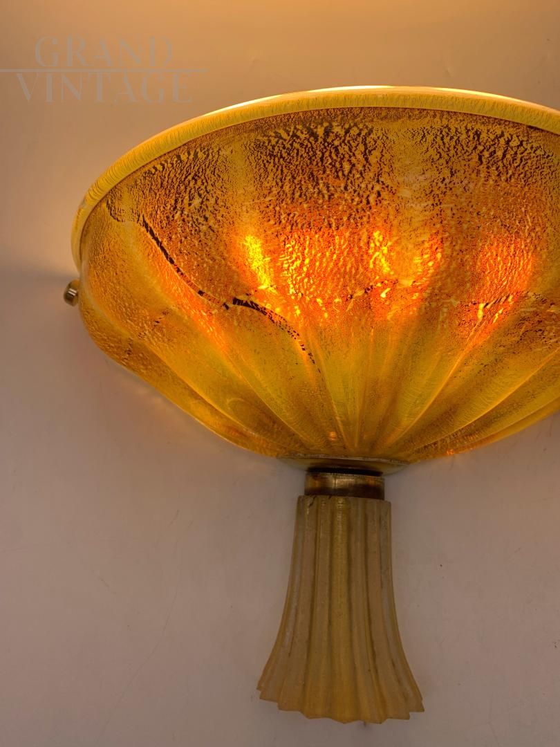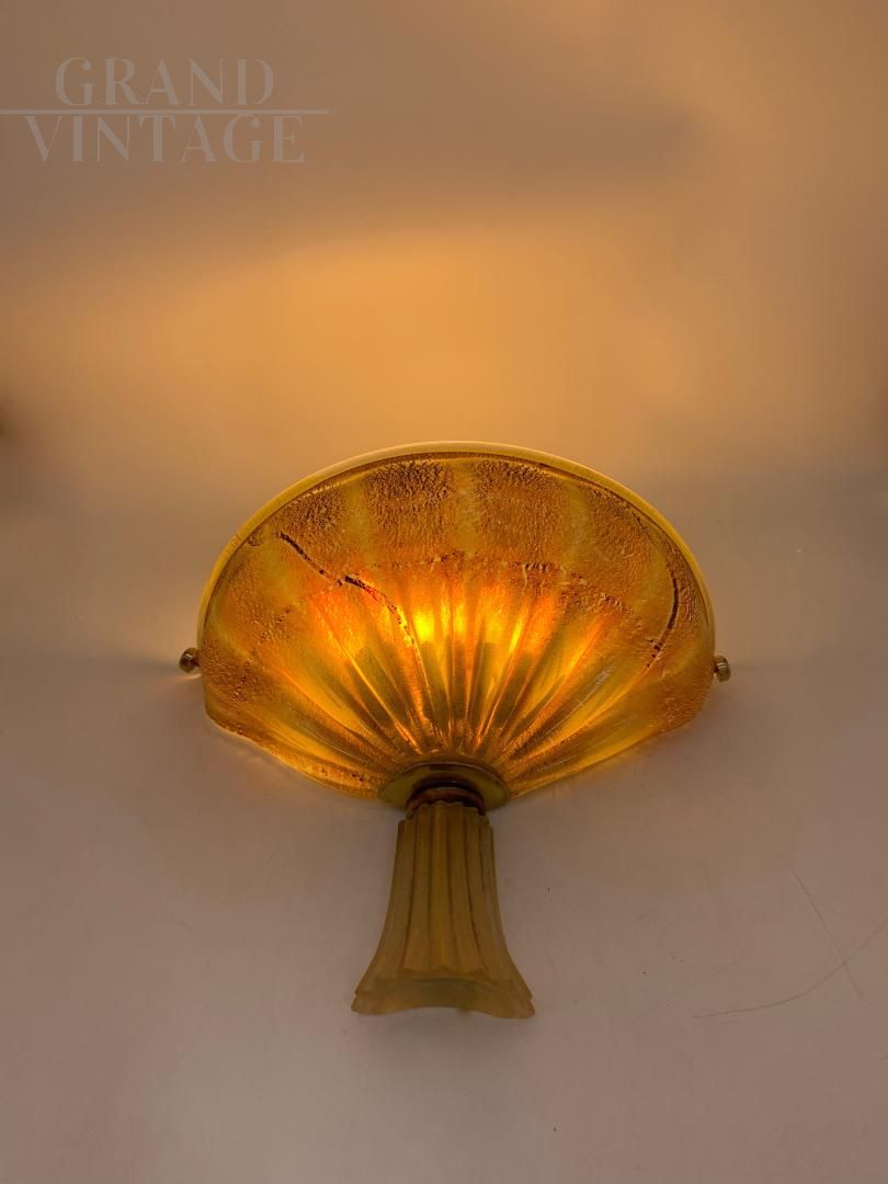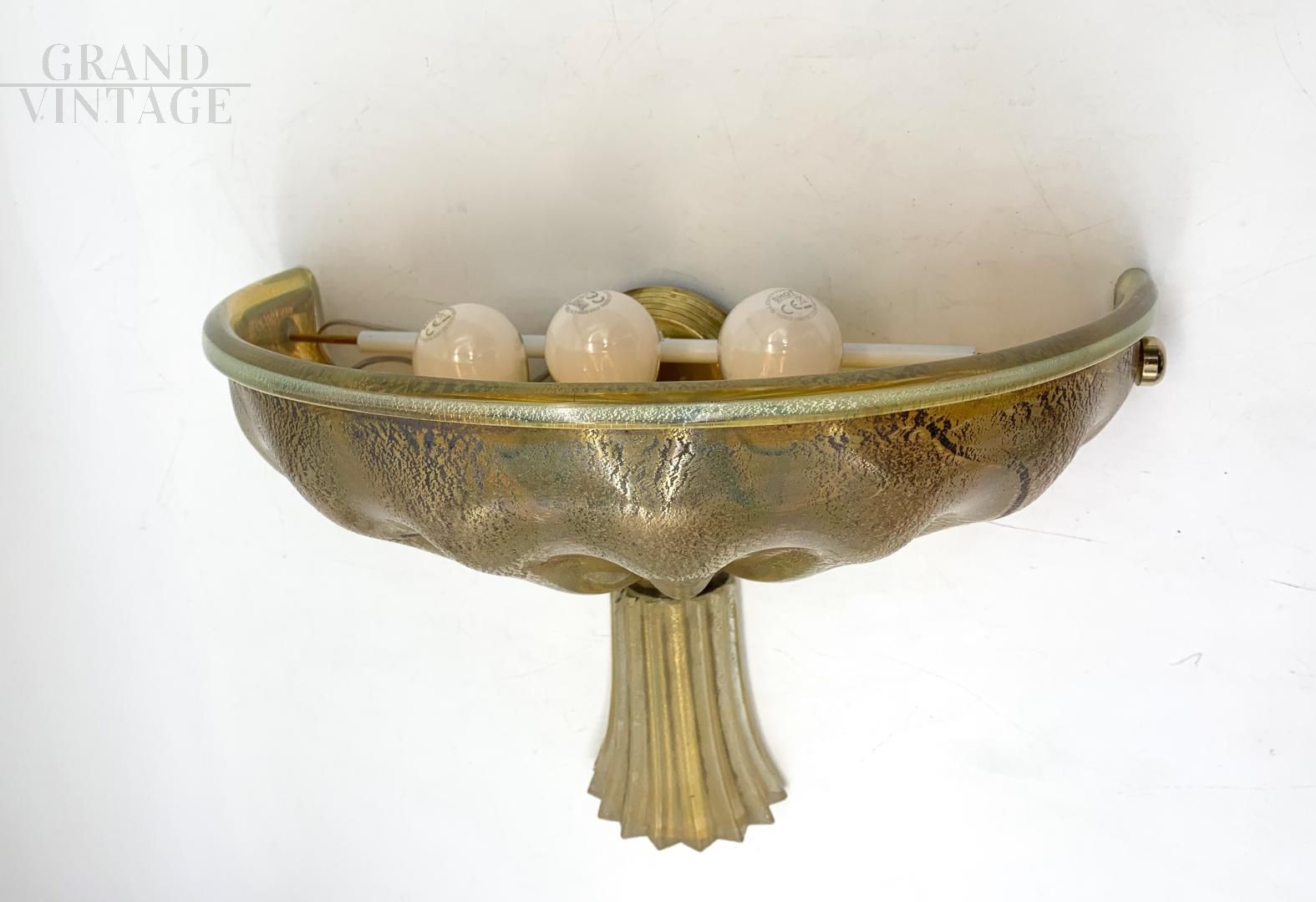 Il vetro è molto particolare, l'applique sia da accesa che da spenta è spettacolare. In ottime condizioni, il vetro è intatto e non crepato e la struttura portante in ottone e ferro è stata verniciata di bianco. La lampada ha 3 attacchi per lampadine di tipo E14 in ceramica. Pochi segni del tempo sulla struttura.