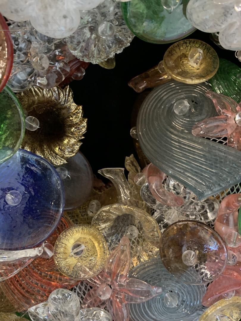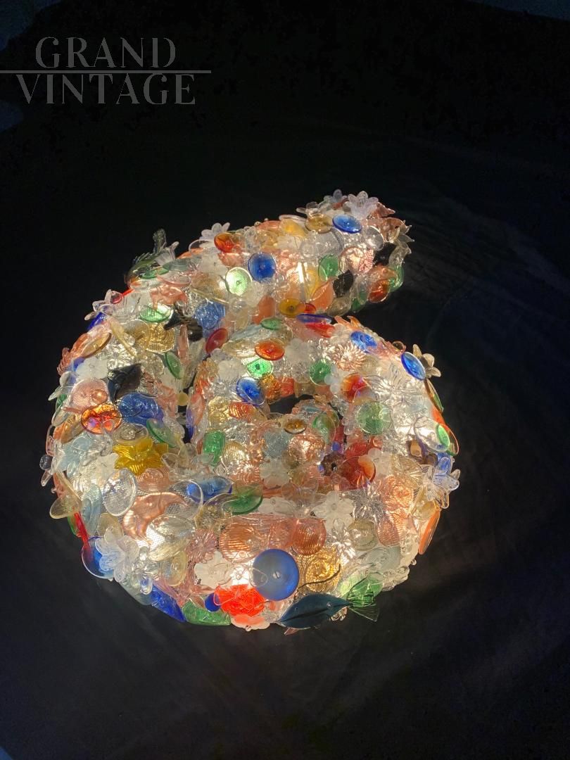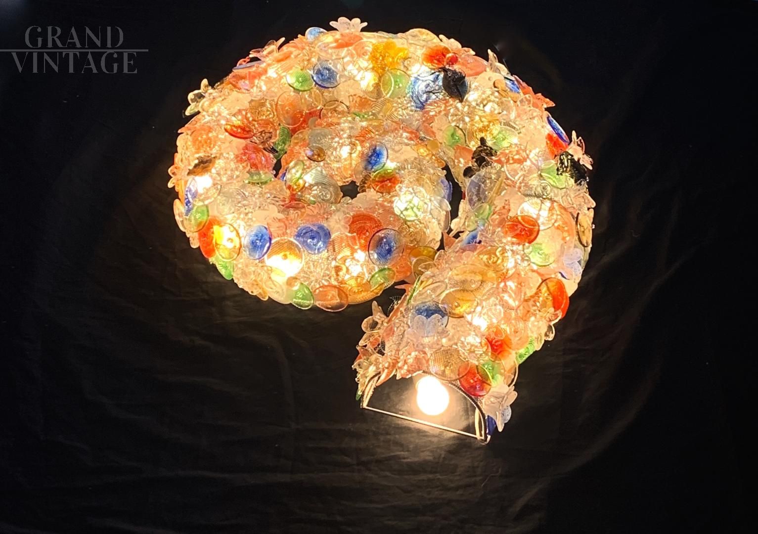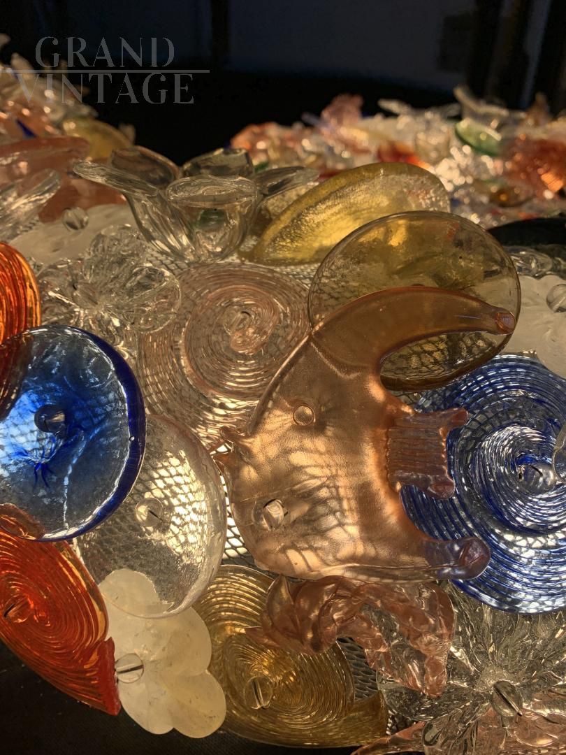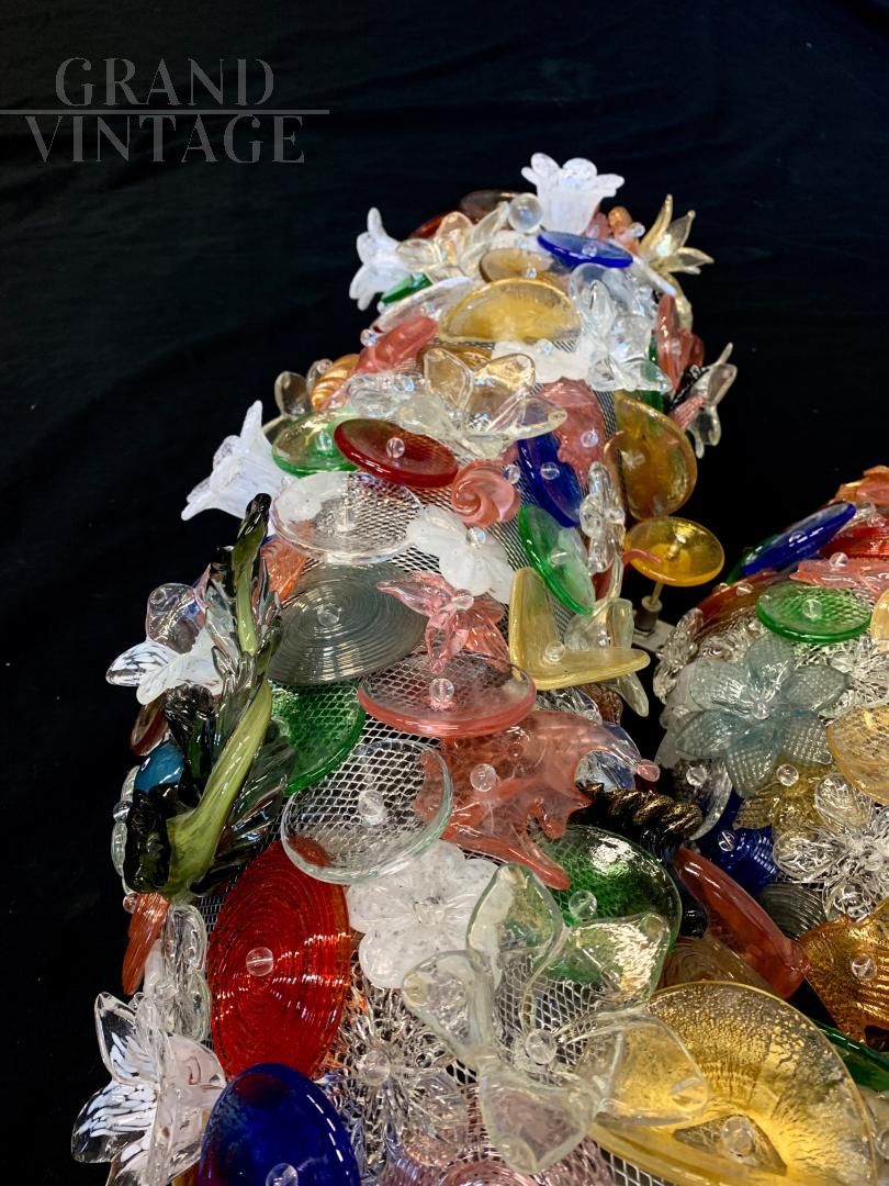 Applique Nautilus, pezzo unico produzione artistica recente, creato da professionisti e laureati del settore. La forma è di una conchiglia marina, con struttura in ferro saldato con rete. La lampada è decorata interamente con pesci, conchiglie, animali marini, oggetti decorativi fatti a mano a Murano e inseriti nella rete. Impianto elettrico nuovo, molto luminosa grazie a diversi portalampada E14 posti sapientemente a illuminare tutti i colori e le decorazioni.