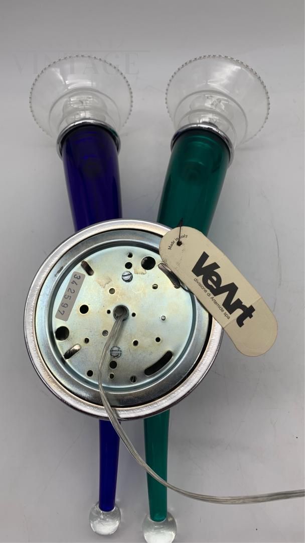 Applique singola della ditta VeArt in vetro di Murano nei colori verde, blu e trasparente, su montatura in ferro, anni '80. In ottime condizioni, tutti i pezzi sono originali con vetri intatti, non scheggiati nè crepati, e impianto elettrico rifatto, con due attacchi per lampadine E14, adatti per l'utilizzo di lampadine a LED. Pezzo di design veramente importante e armonioso, perfetto da affiancare a un arredamento classico o moderno, la lampada accesa non abbaglia ma illumina bene. I coni in vetro flettono leggermente sulla struttura in metallo. A completare la lampada, Ha il foglietto originale della ditta VeArt.
