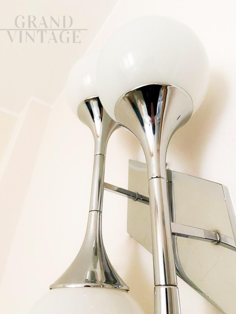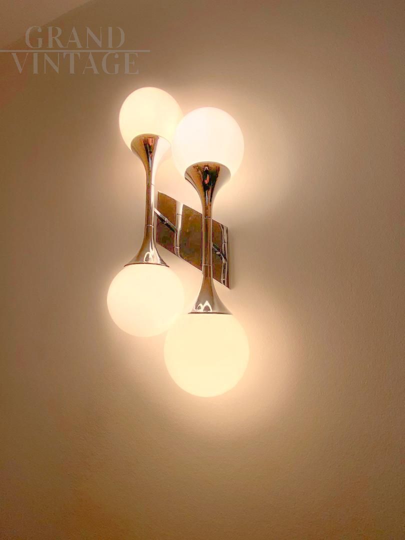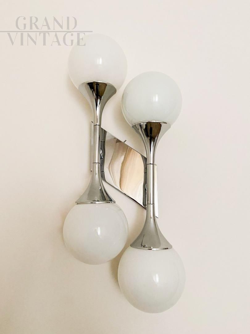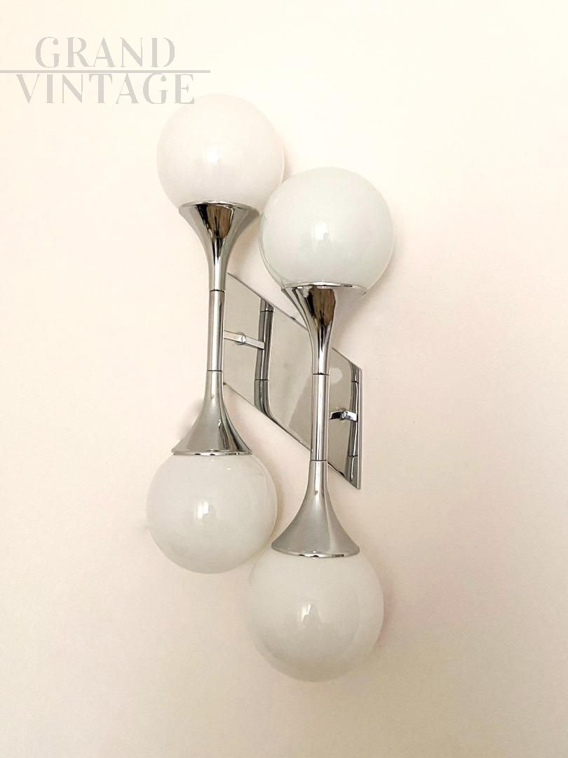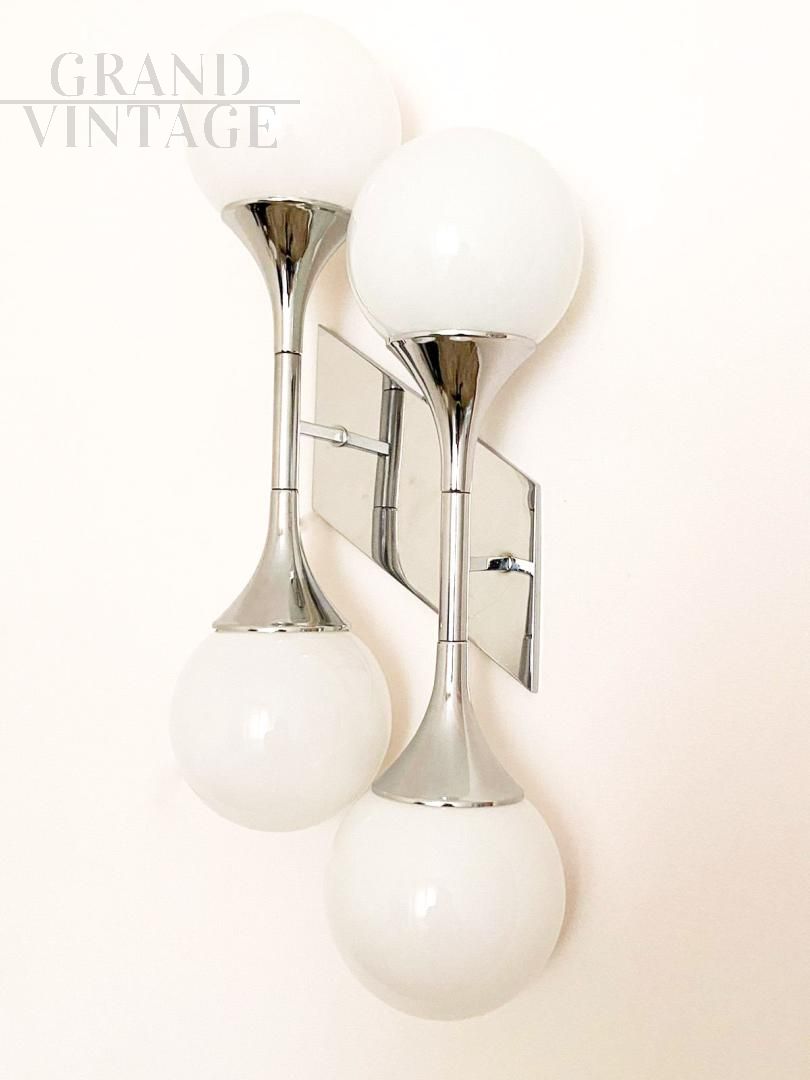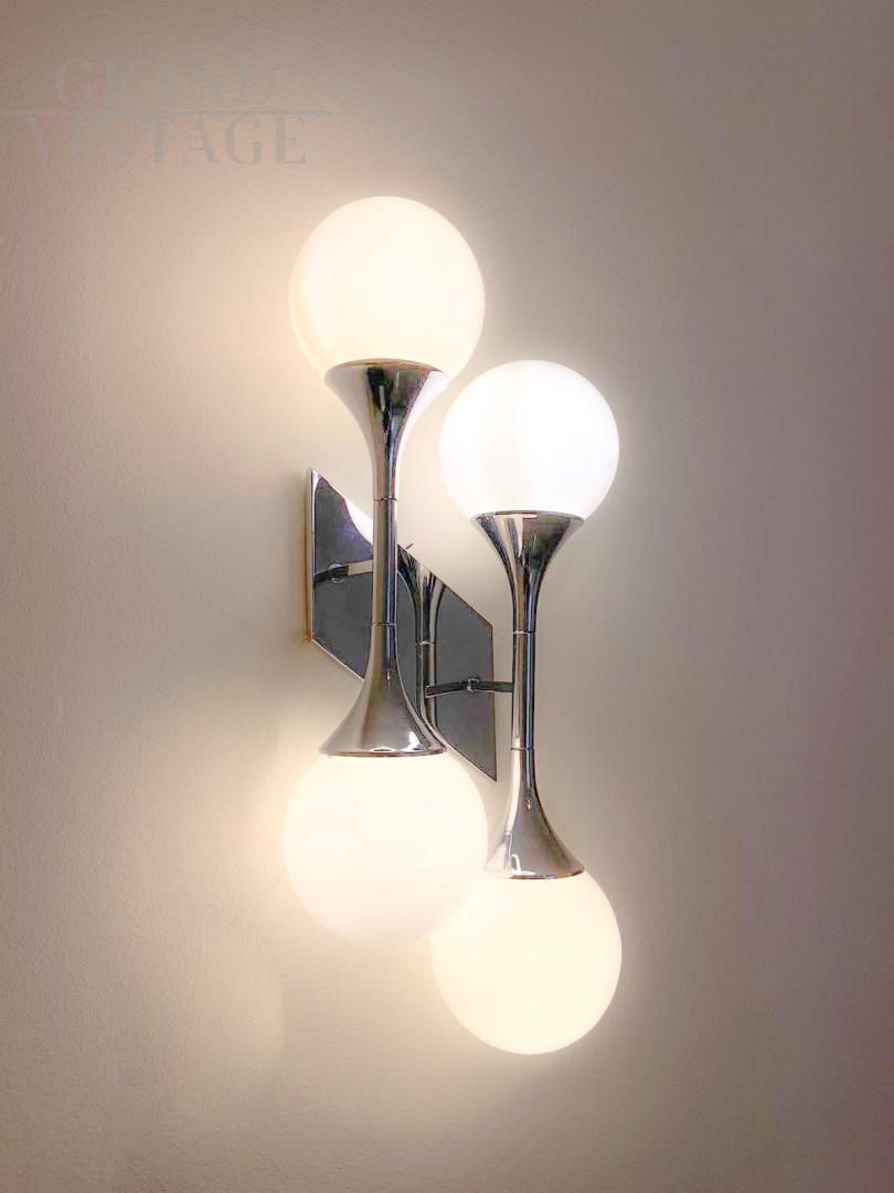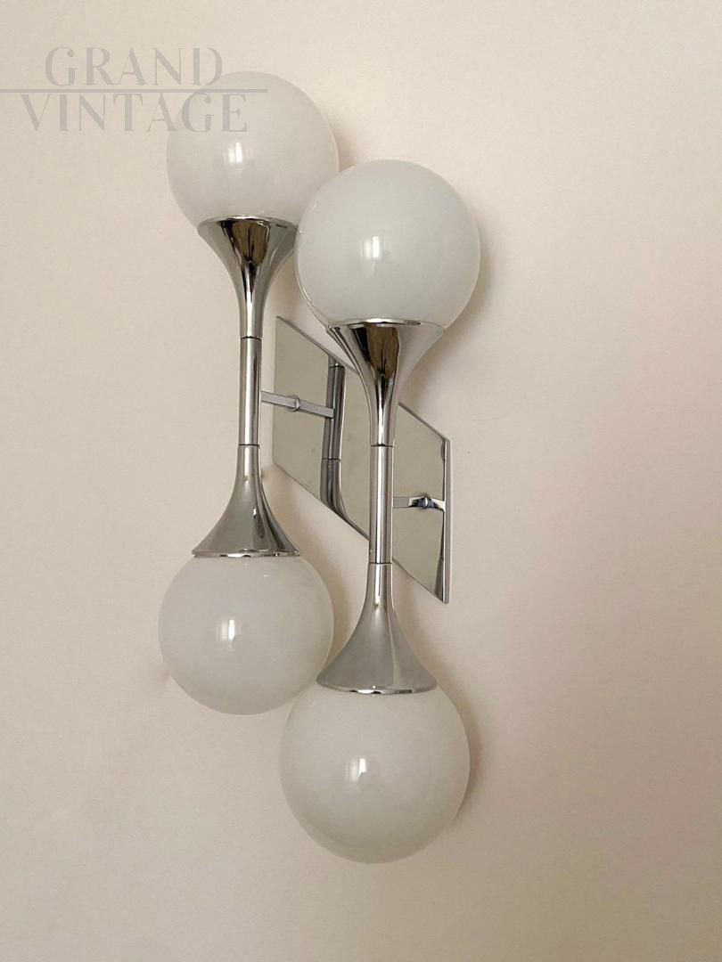 Applique lampada da parete vintage anni '70 n stile Stilnovo in metallo cromato con sfere in vetro soffiato bianco, Italia anni'70. Le bolle sono in vetro bianco, l'appique è di grandi dimensioni, in ottimo stato di conservazione e funzionante.