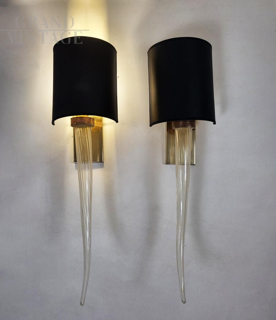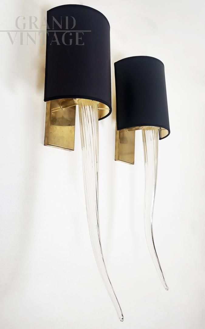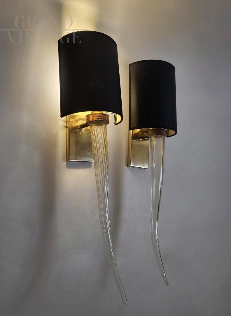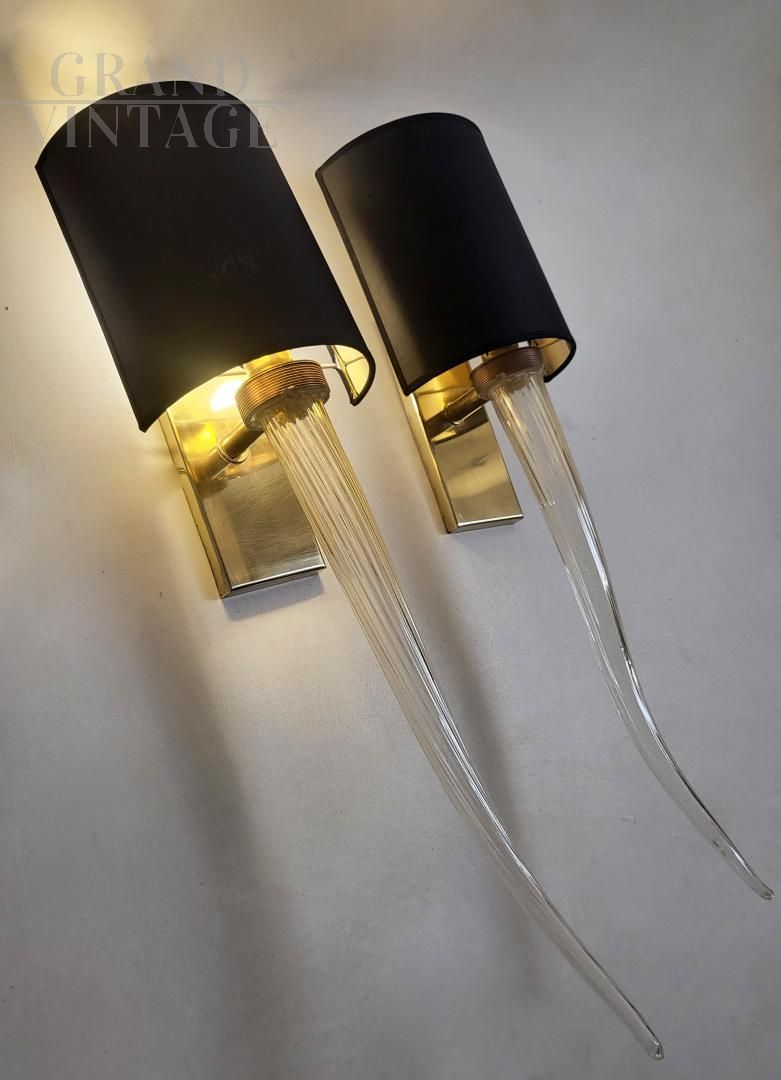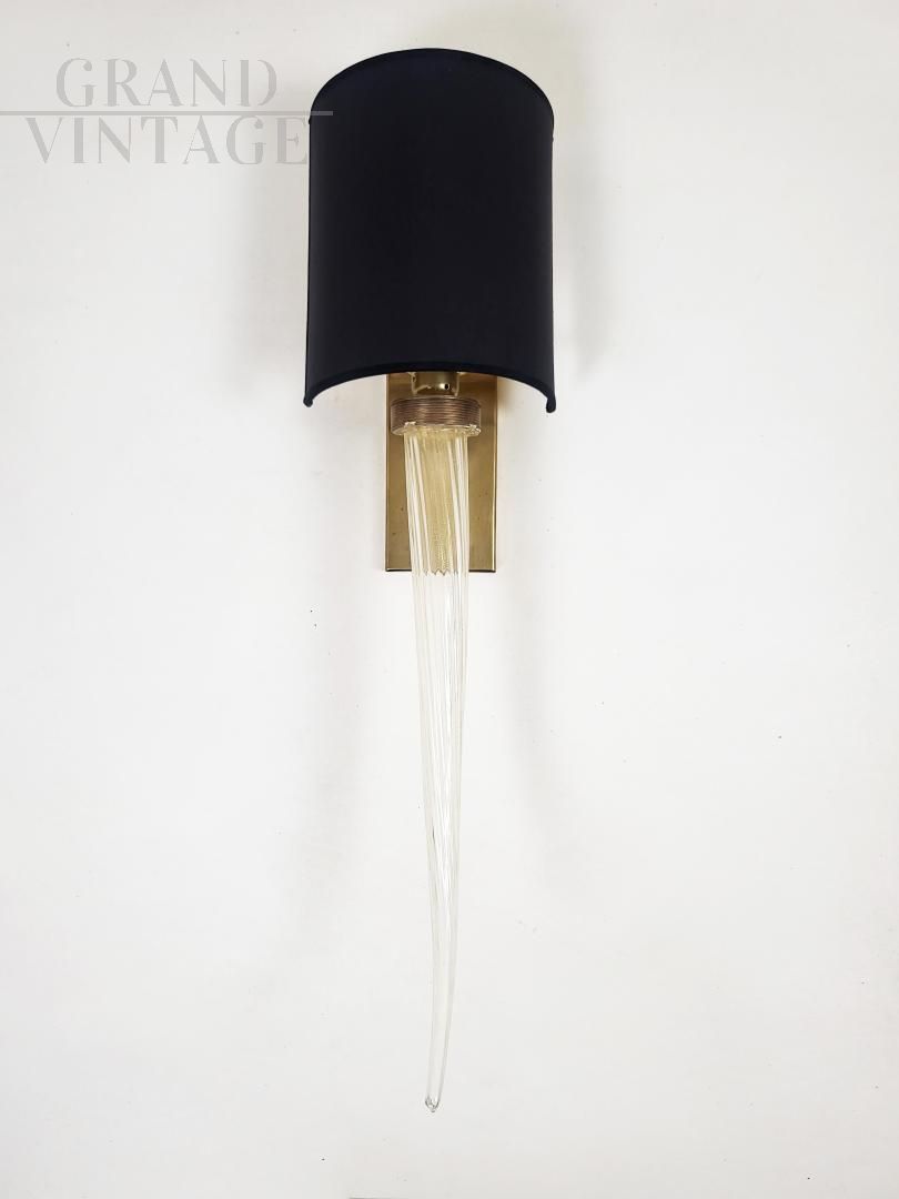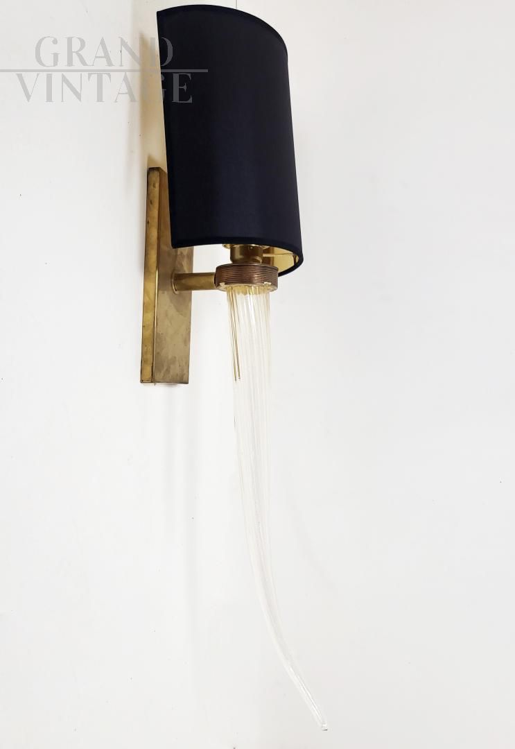 Particolare applique lampada da parete vintage in ottone con paralume nero e meravigliosa decorazione in vetro, Italia anni '70, perfetta per arredare uno stile Hollywood Regency.