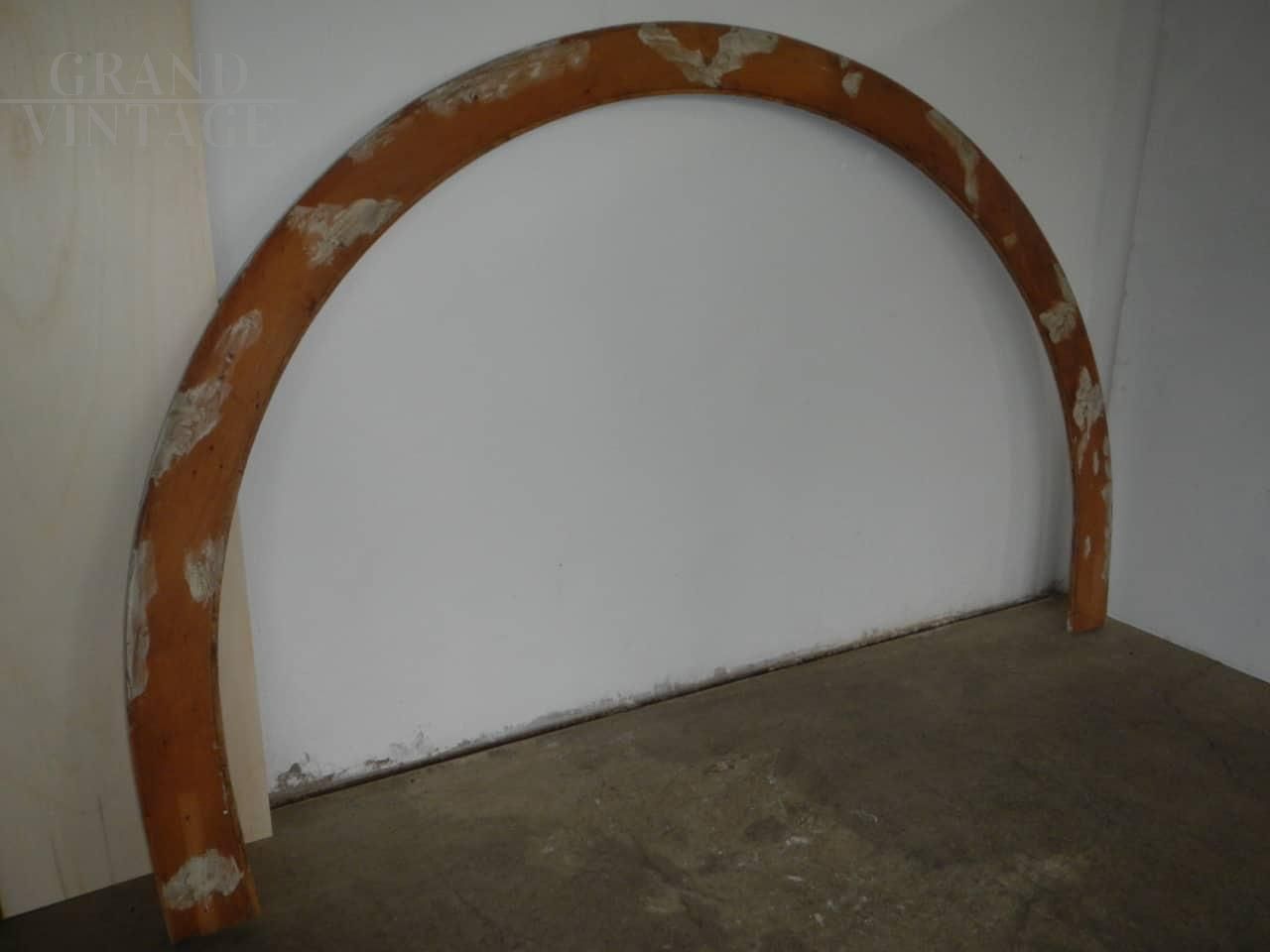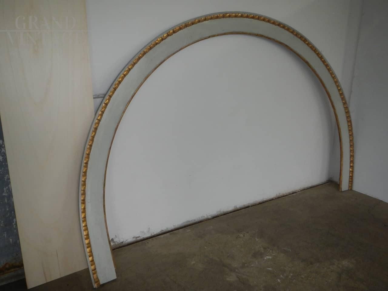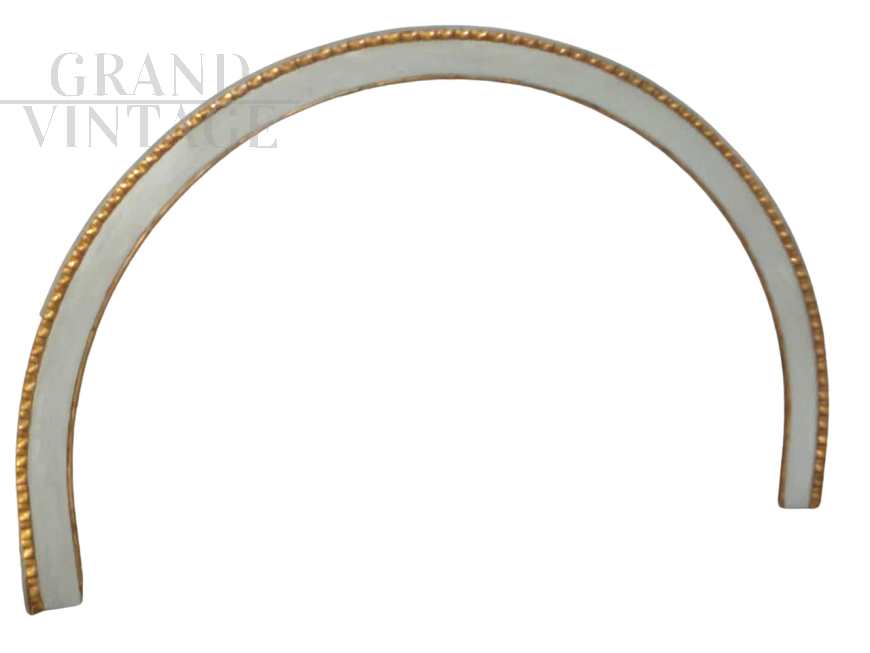 Cornice a forma di arco in legno di abete e pioppo laccato bianco, con ritorcitura in foglia oro, epoca anni '20. Restaurato con pulitura dell'oro, ottima patina.