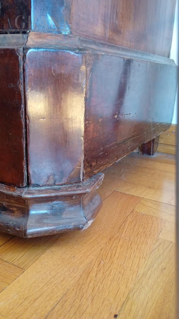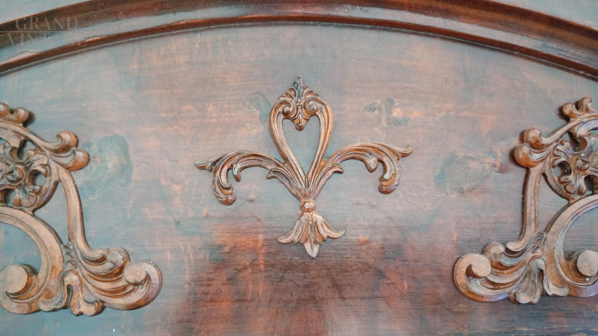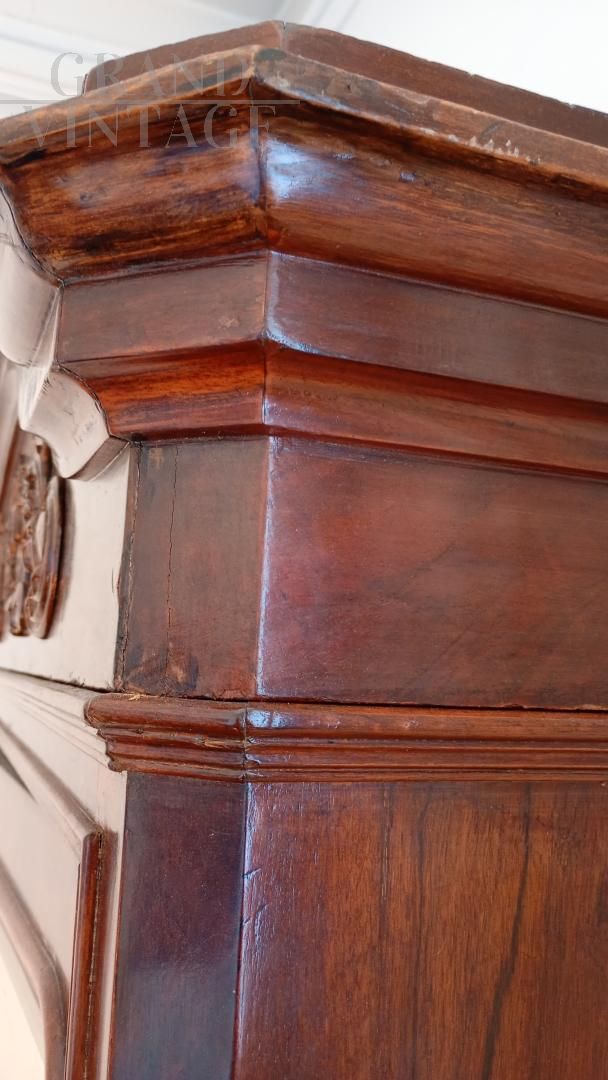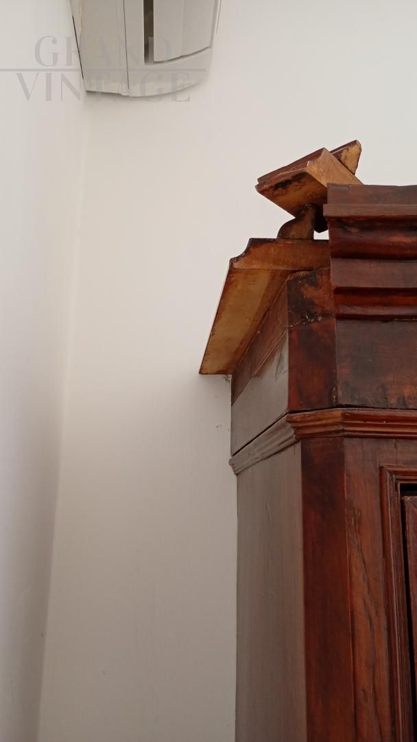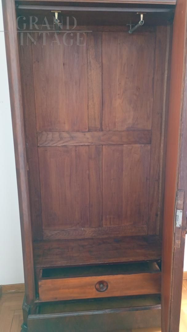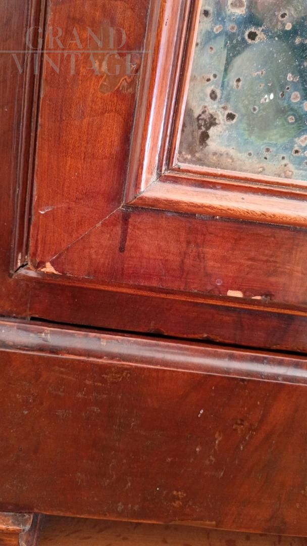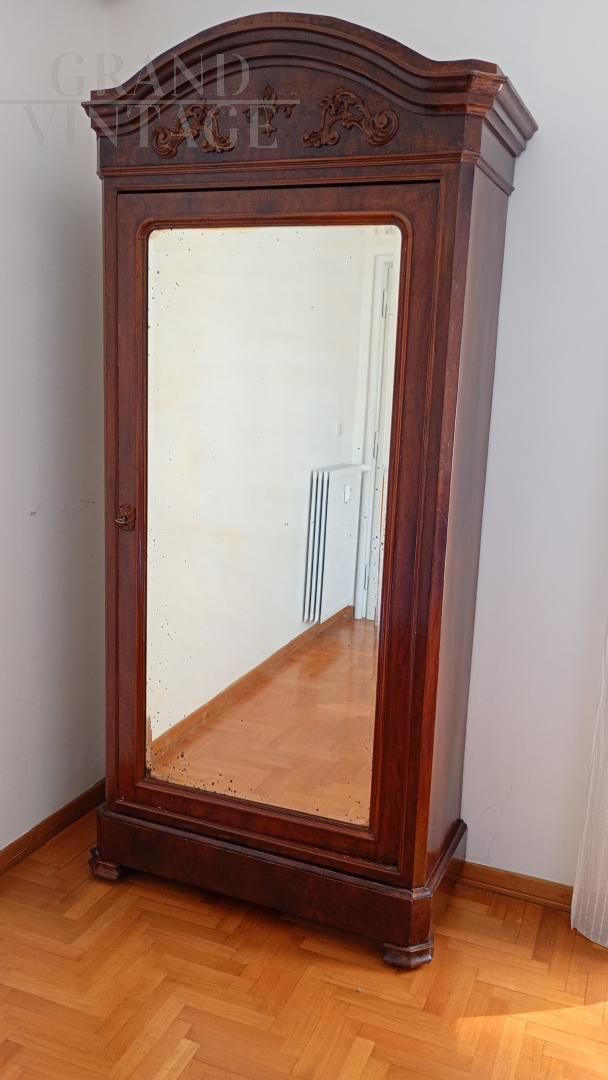 Bellissimo armadio con specchio completo di un cassetto a scomparsa, nella parte inferiore ed un altro con pomello nella parte interna oltre all' appendiabiti. Cappello smontabile con decorazioni. A causa dell'età e dell'usura, il prodotto necessita di interventi di restauro e ripresa della lucidatura. Lato sinistro del cappello scollata. Trattamento antitarlo effettuato con prodotto naturale e brevettato. Misure: Largh massima comprensiva di cappello 107xh227xp47 comprensiva di cappello.