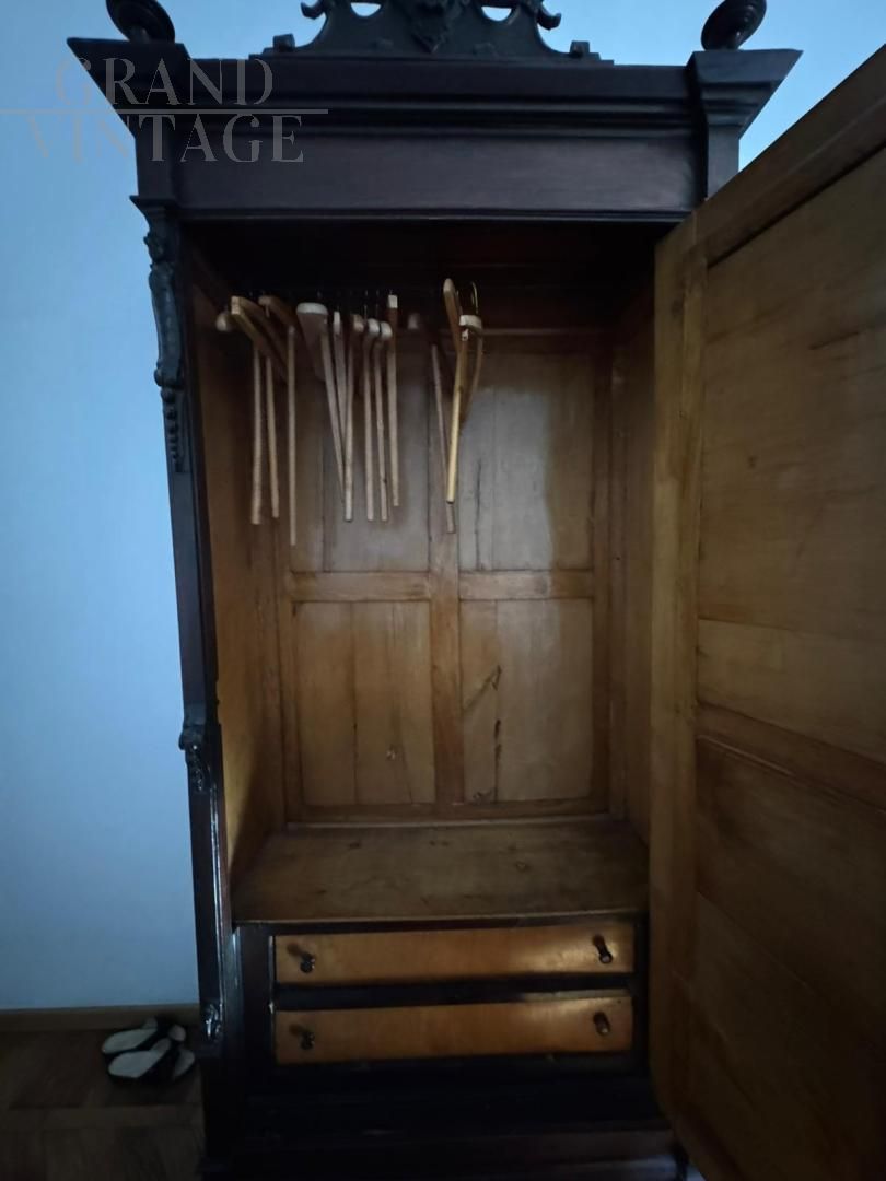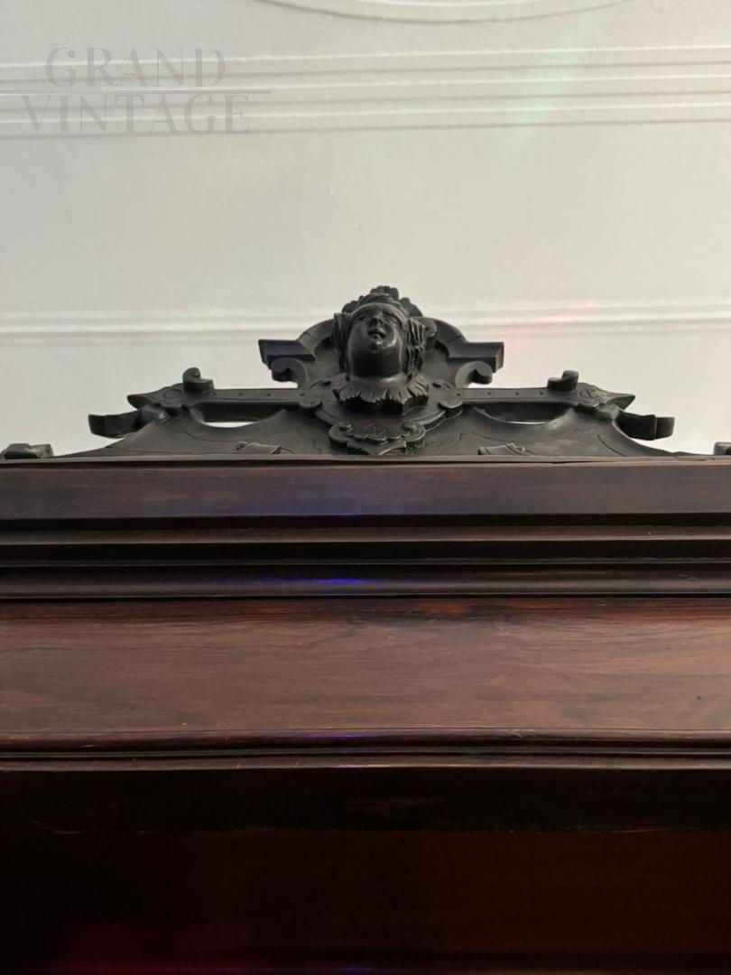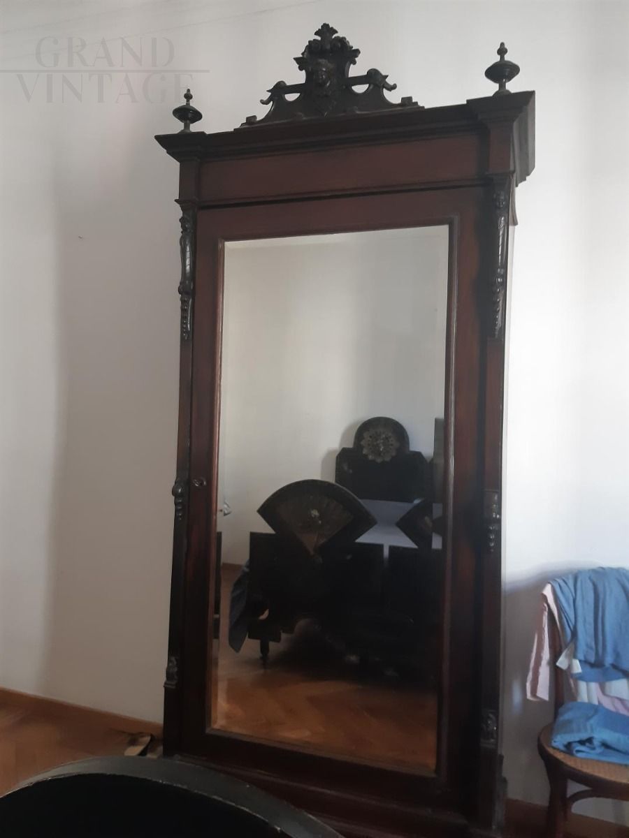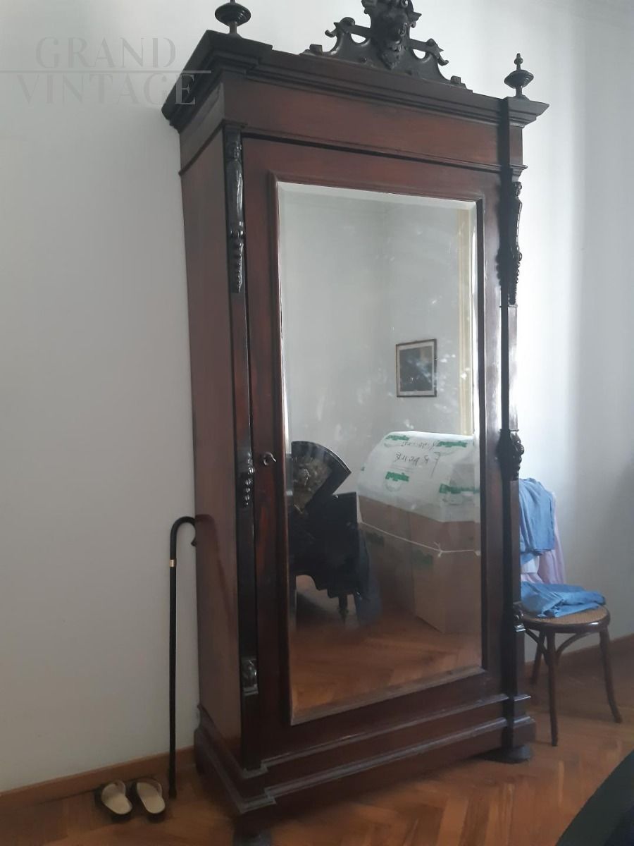 Elegante armadio a un’anta con grande specchio centrale, realizzato in palissandro indiano massello, databile alla seconda metà dell’Ottocento. Decorazioni scolpite a mano con figure laterali e cimasa superiore riccamente intagliata con mascherone centrale. Lo specchio è originale (con lievi segni tipici del tempo), così come le parti lignee e la ferramenta. Ottime proporzioni e grande impatto scenografico, ideale come pezzo d’arredo di pregio per interni classici o eclettici.
