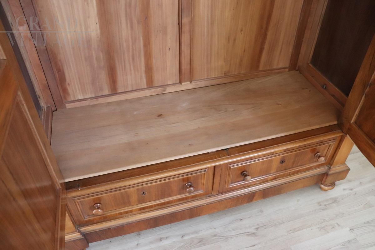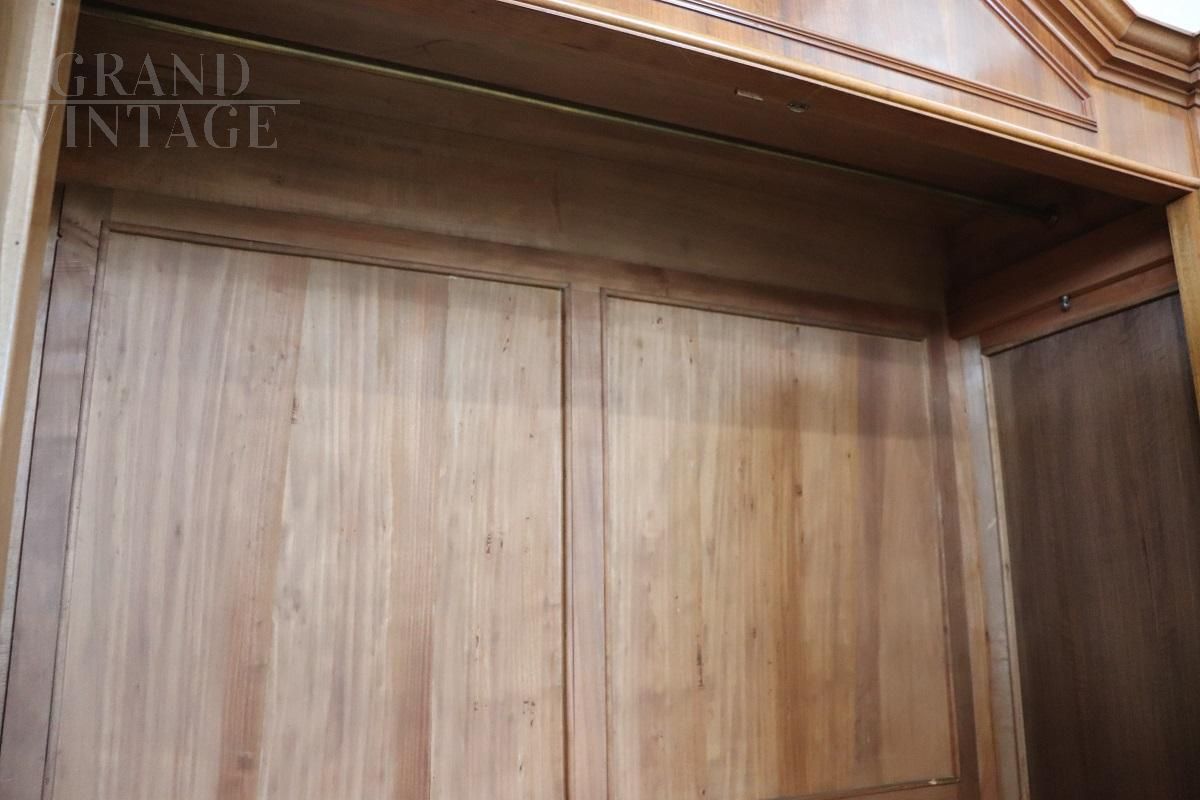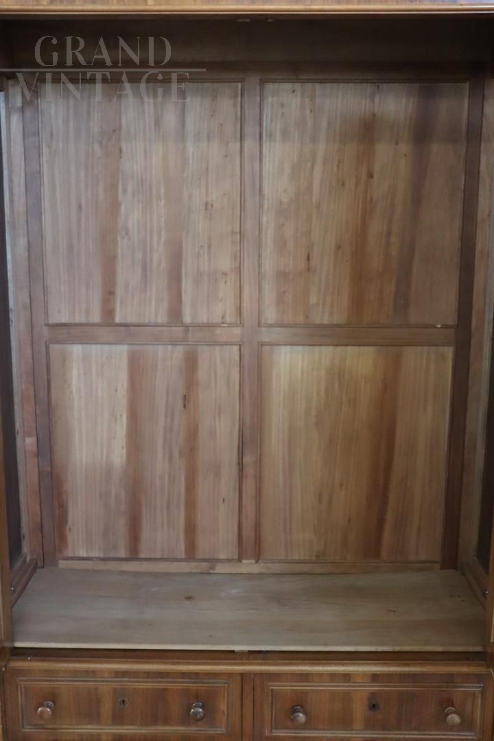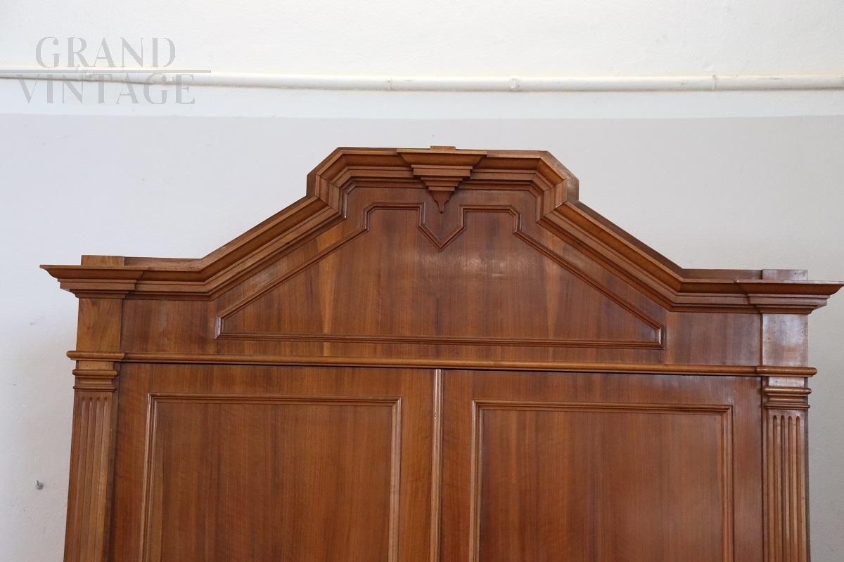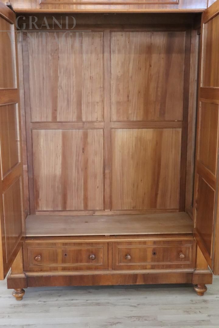Armadio antico italiano a due ante in legno massello impiallacciato in noce, realizzato alla fine del XIX secolo. Particolarissimo armadio caratterizzato da un cappello slanciato con una cornice dalla linea geometrica. Dotato di due ante, l'interno è attrezzato con un'asta per appendere gli abiti, nella parte inferiore presenta due comodi cassetti. Possibilità di cambiare l'interno in base alle proprie esigenze. Armadio molto semplice e lineare in colore noce chiaro, perfetto anche per un ambiente moderno. L'armadio verrà spedito smontato per agevolarne il trasporto. Ottimo prezzo trattabile.