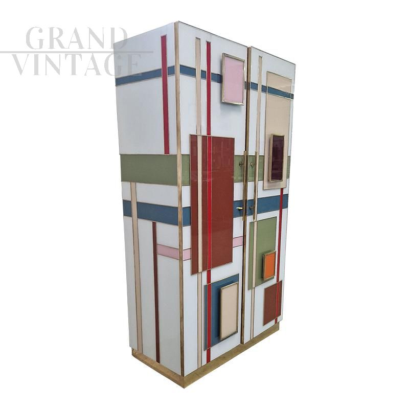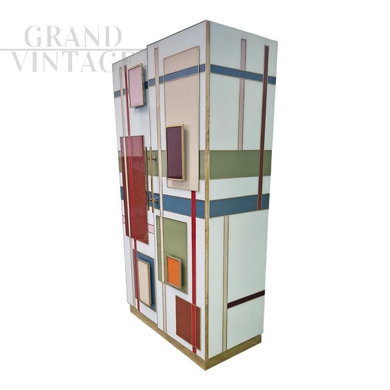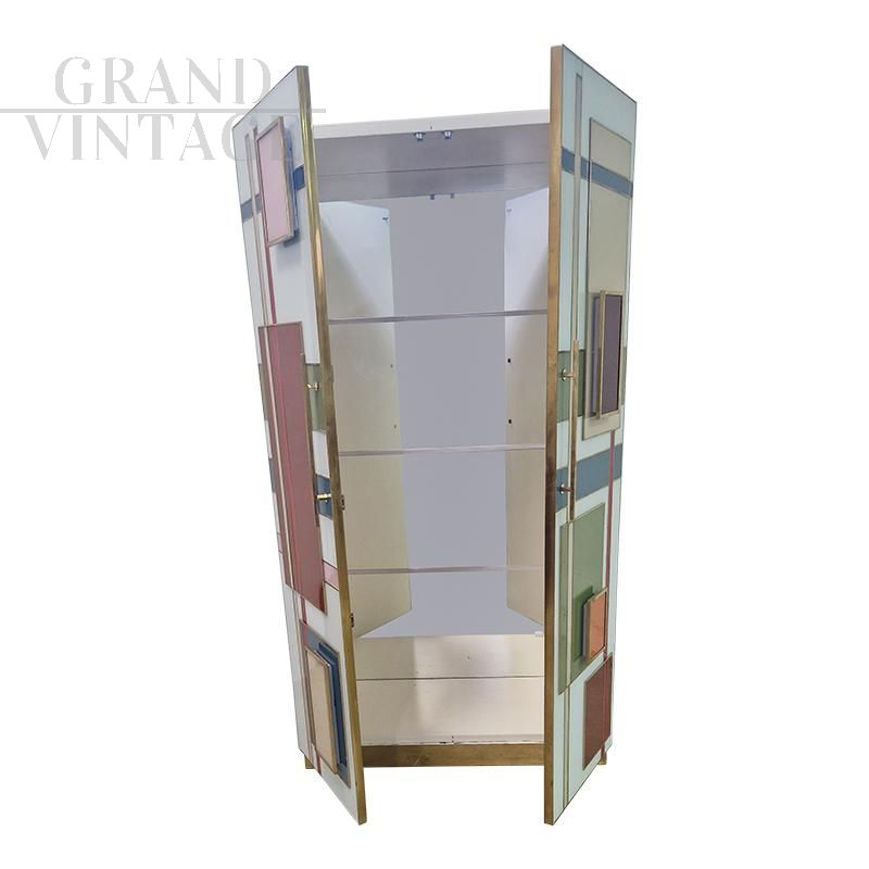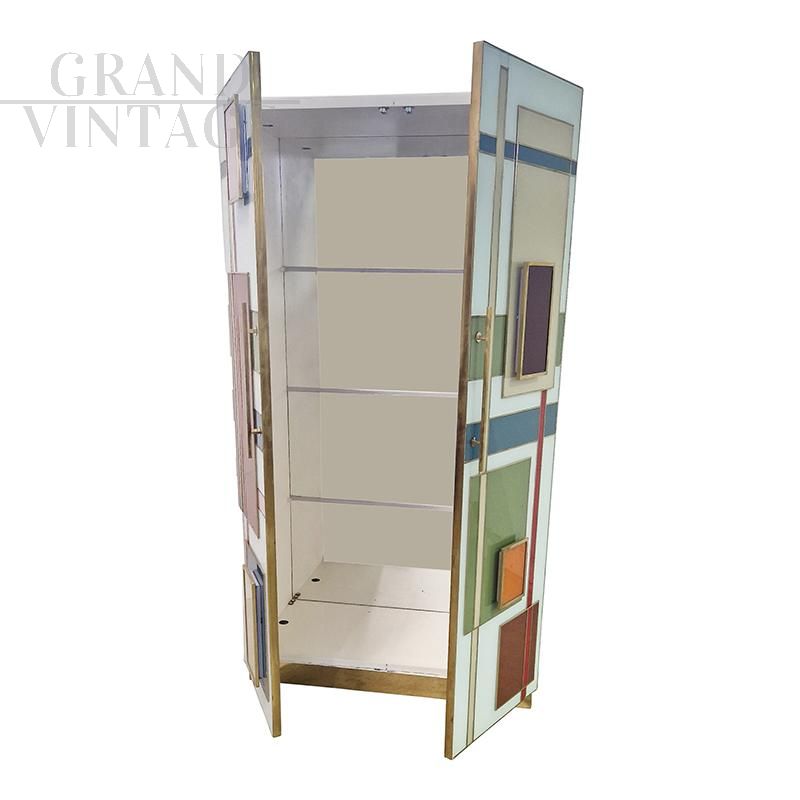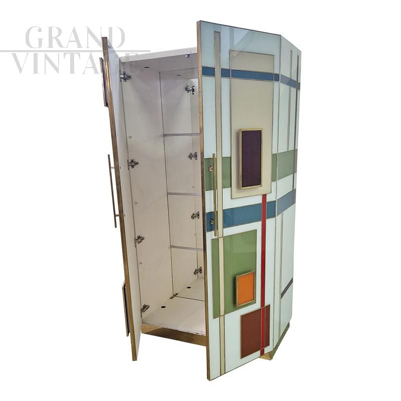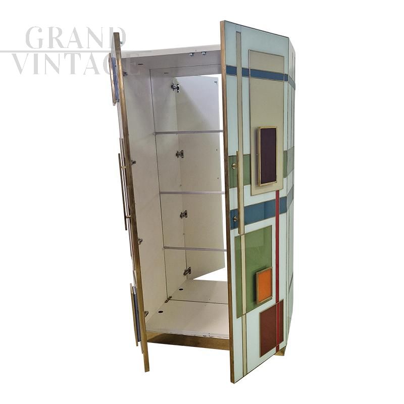 Armadio o dispensa interamente realizzato a mano, con struttura in legno rivestita in vetro color pastello, interno a specchio con ripiani. Profili e piedi in ottone dorato. Le maniglie sono retroilluminate con strisce a led.