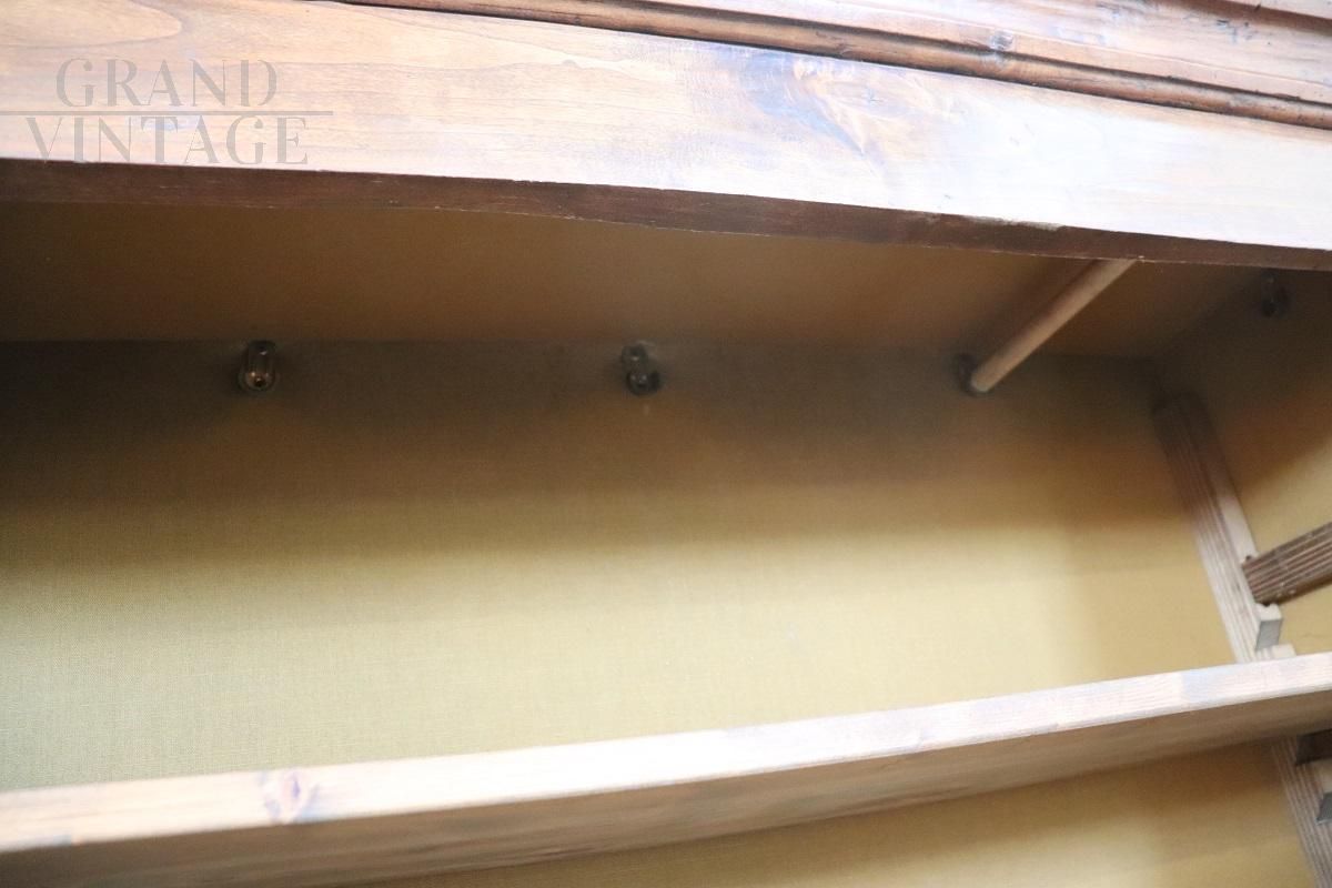 Armadio antico italiano lombardo dei primi del XIX secolo realizzato in pioppo massello in una splendida finitura. Caratterizzato da una struttura molto lineare, senza eccessivi ornamenti, una leggera decorazione intagliata sulle ante ne ammorbidisce la linearità. L'interno presenta una pratica disposizione con cinque ripiani e un piccolo appendiabiti posizionato a sinistra, che può essere utilizzato rimuovendo i ripiani. L'interno è inoltre rivestito in tessuto, e può essere personalizzato in base alle proprie esigenze aggiungendo un appendiabiti lungo. Anche il tessuto può essere rimosso, lasciando il legno a vista o foderandolo a proprio piacimento. Queste modifiche devono essere richieste prima dell'ordine. Prezzo trattabile. Non smontabile, si prega di verificare la possibilità di accesso in casa.