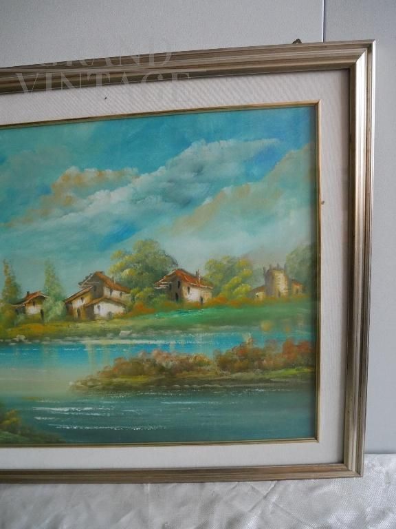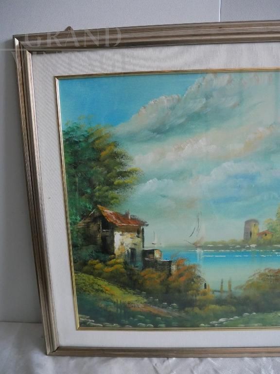 Dipinto di Armando Ballanti (Senigallia 1922-2009) con paesaggio lacustre, olio su tela anni '70, entro cornice con vetro protettivo. Sul retro si trova il certificato di autenticità. Ottimo stato di conservazione.