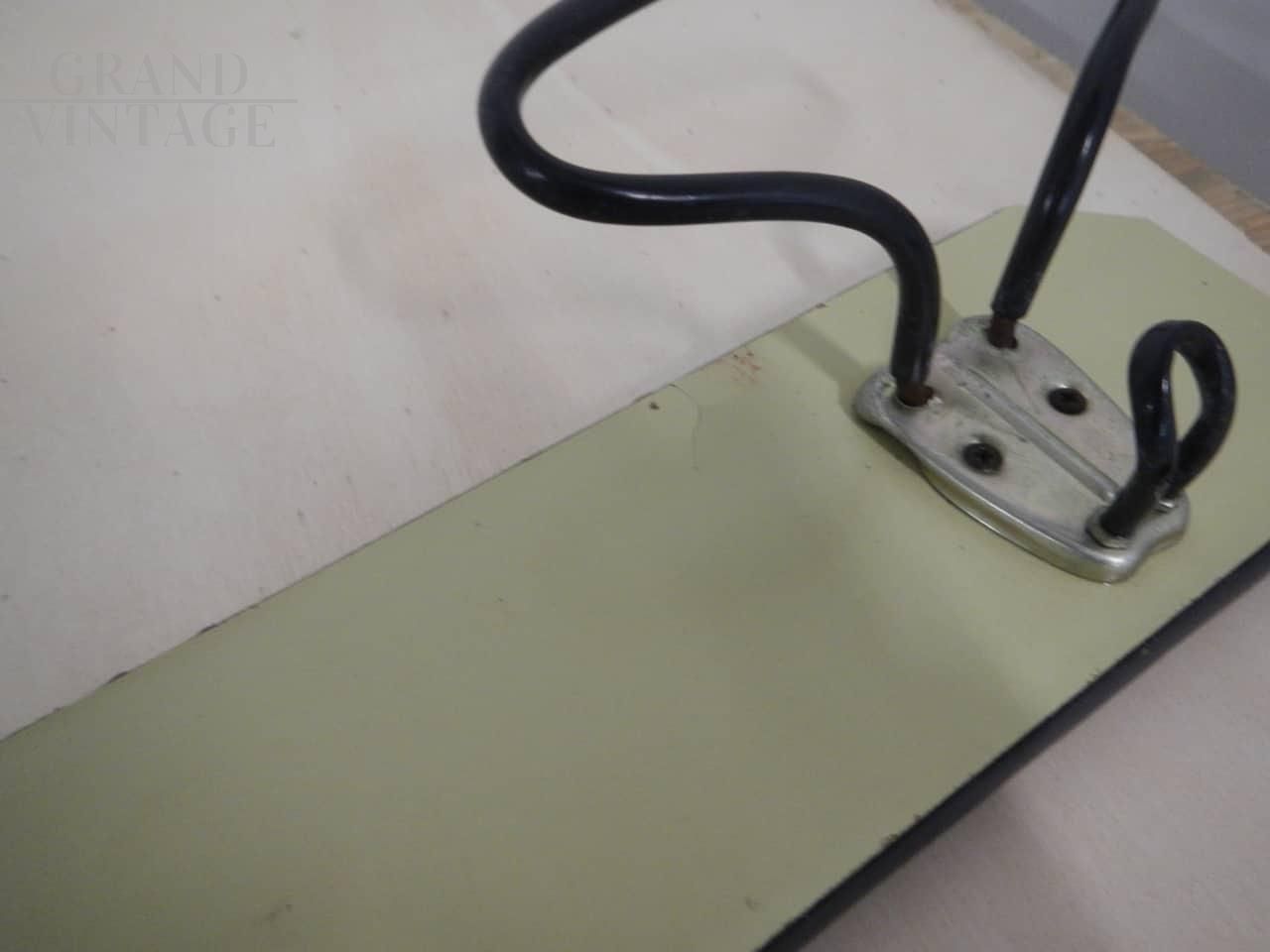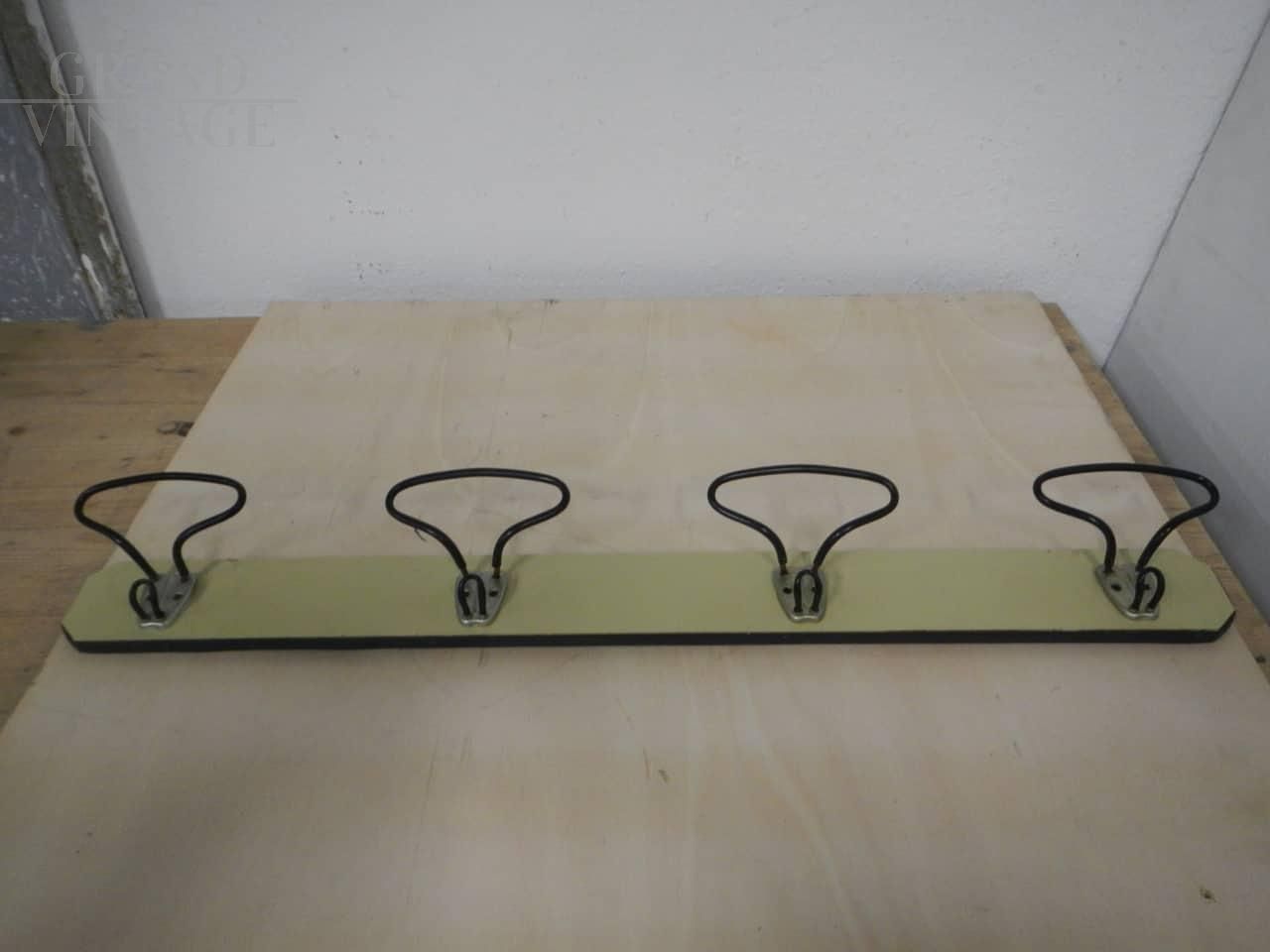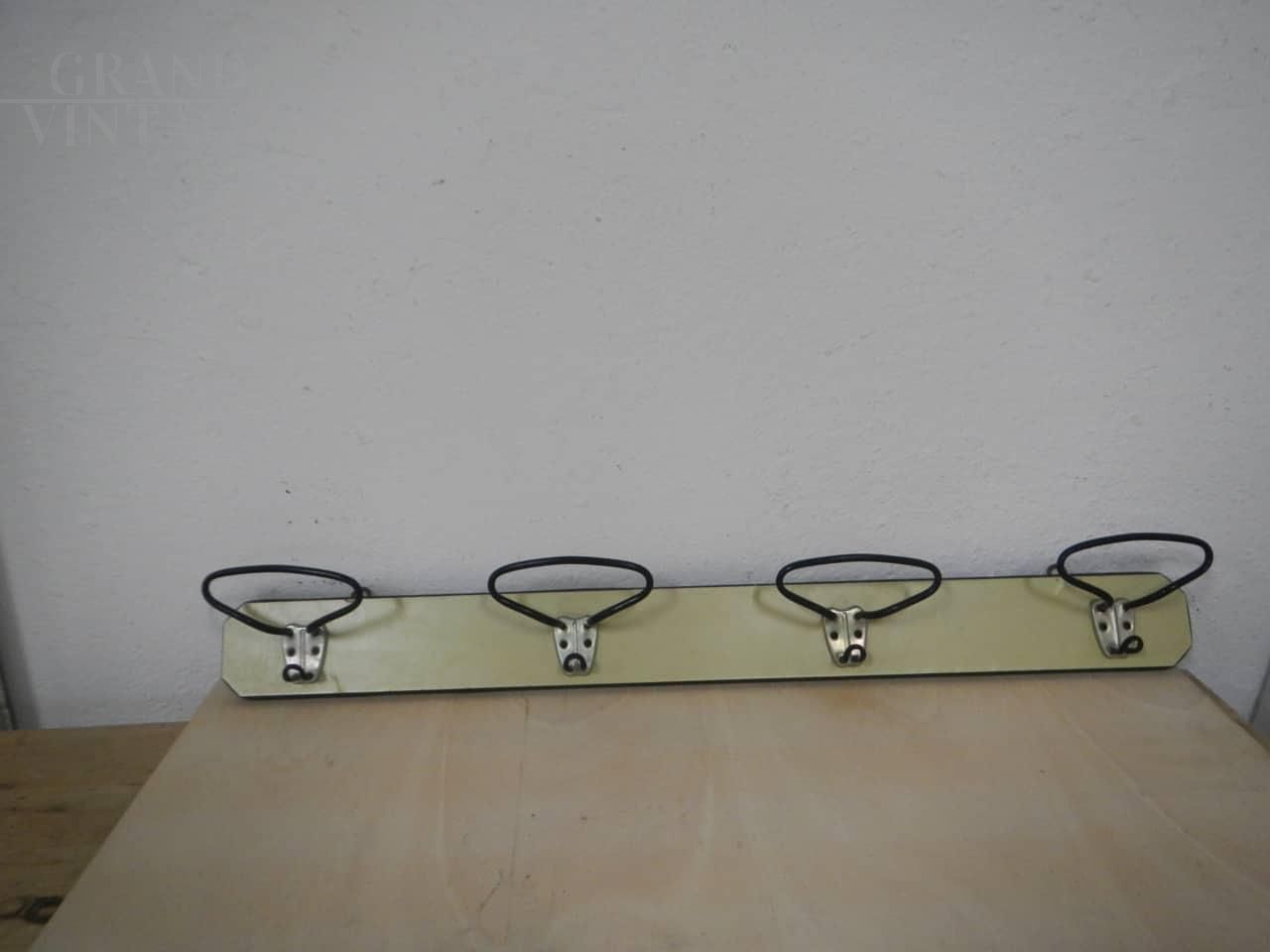 Attaccapanni vintage da parete in legno compresso rivestito in formica, completo di 4 ganci appendiabiti e 2 ganci posteriori per fissarlo al muro.