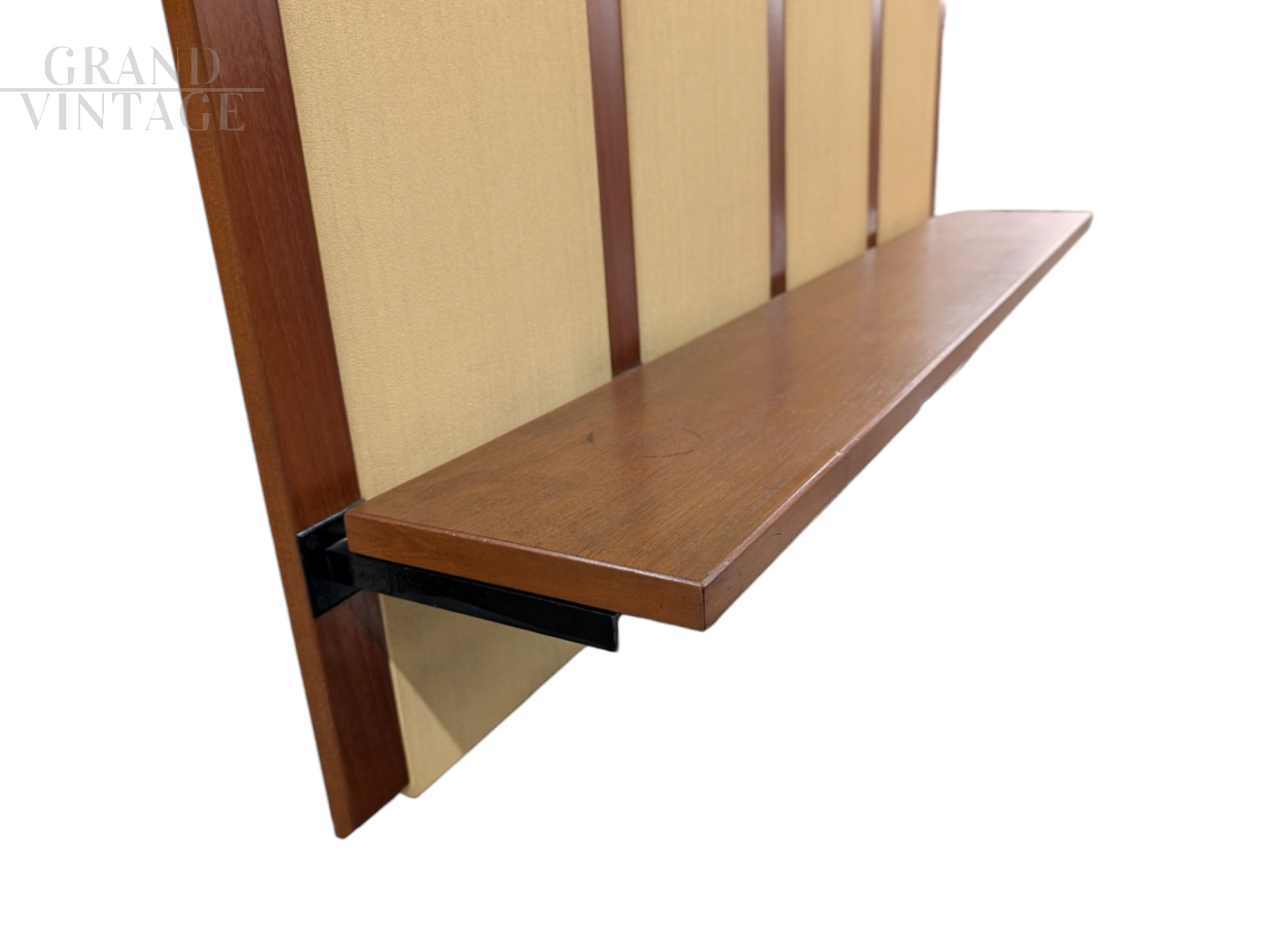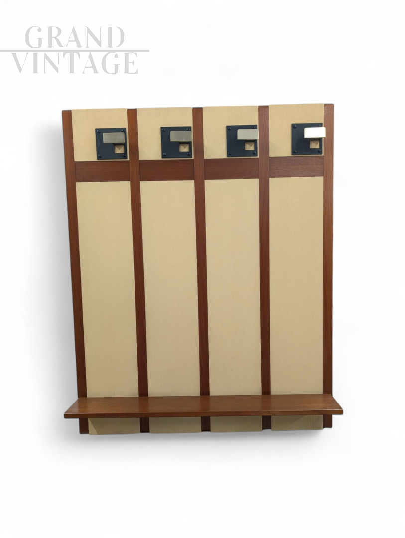 Attaccapanni vintage da parete legno, tessuto beige e ottone, anni '70