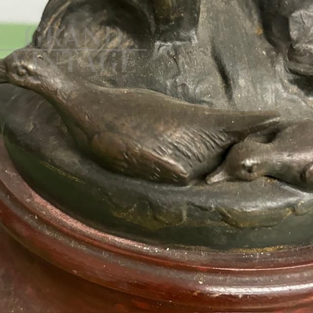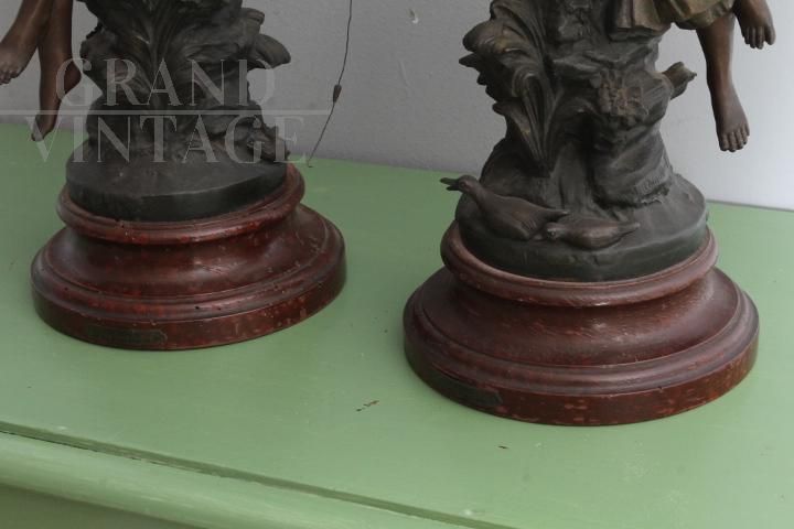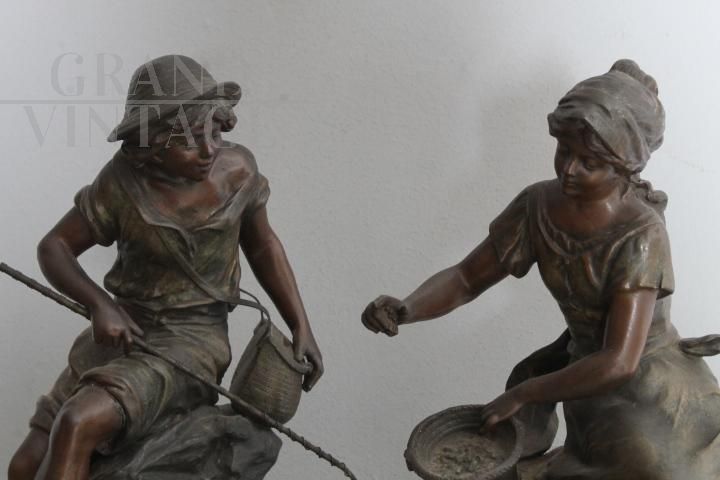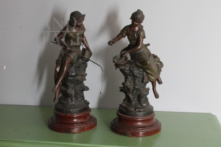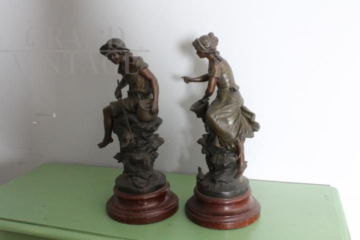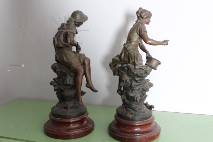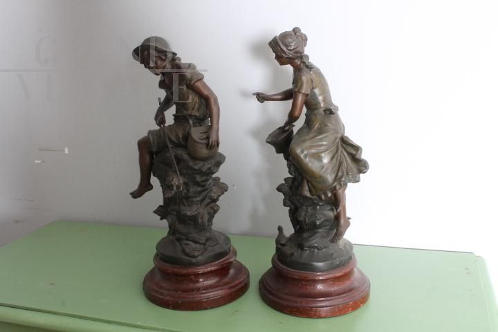 Coppia di sculture antiche firmate Auguste Moreau di fine '800, periodo Liberty, in antimonio patinato su base modanata in legno, di bellissima qualità, raffiguranti pescatore e contadina, firmati alla base.