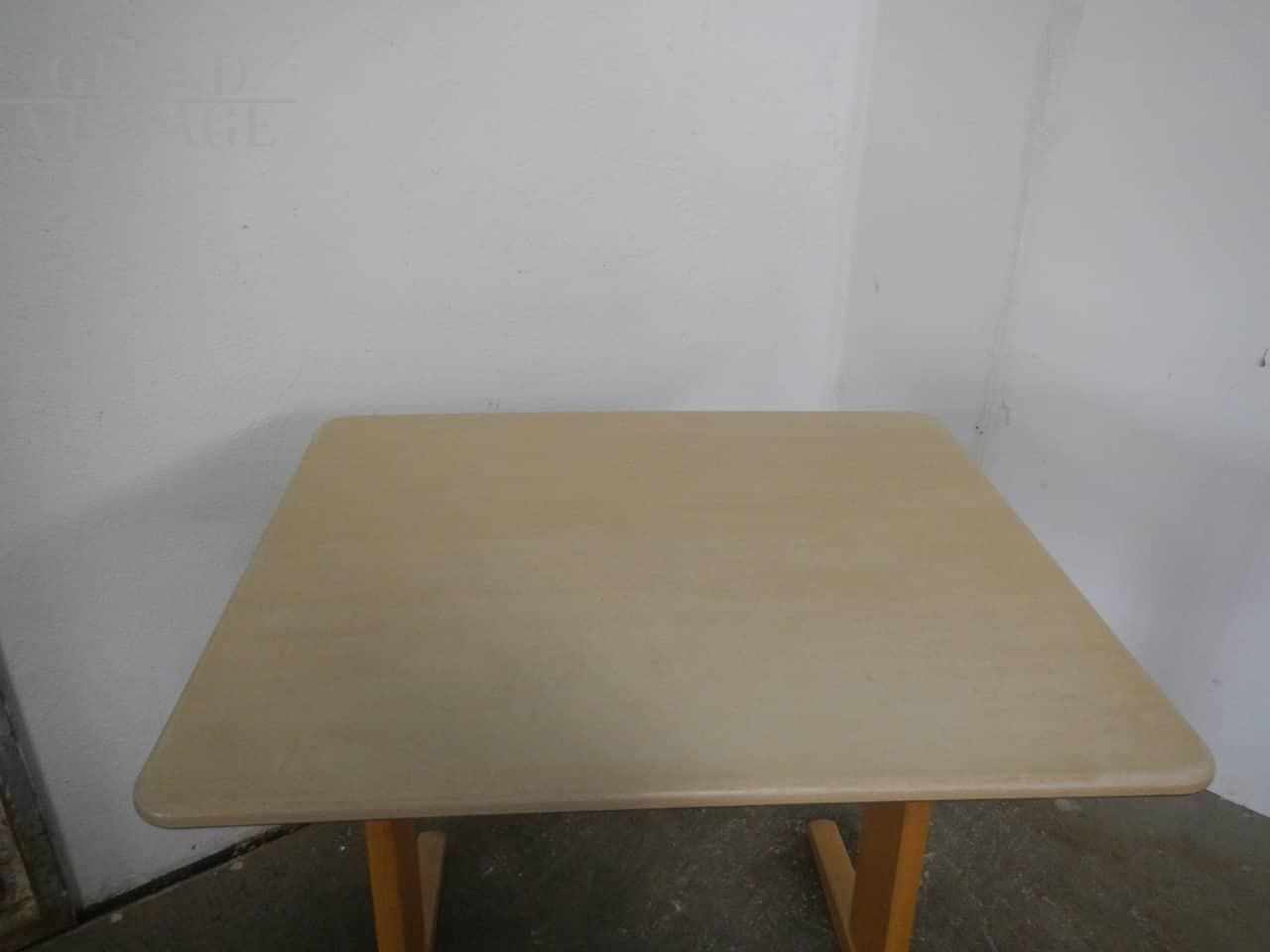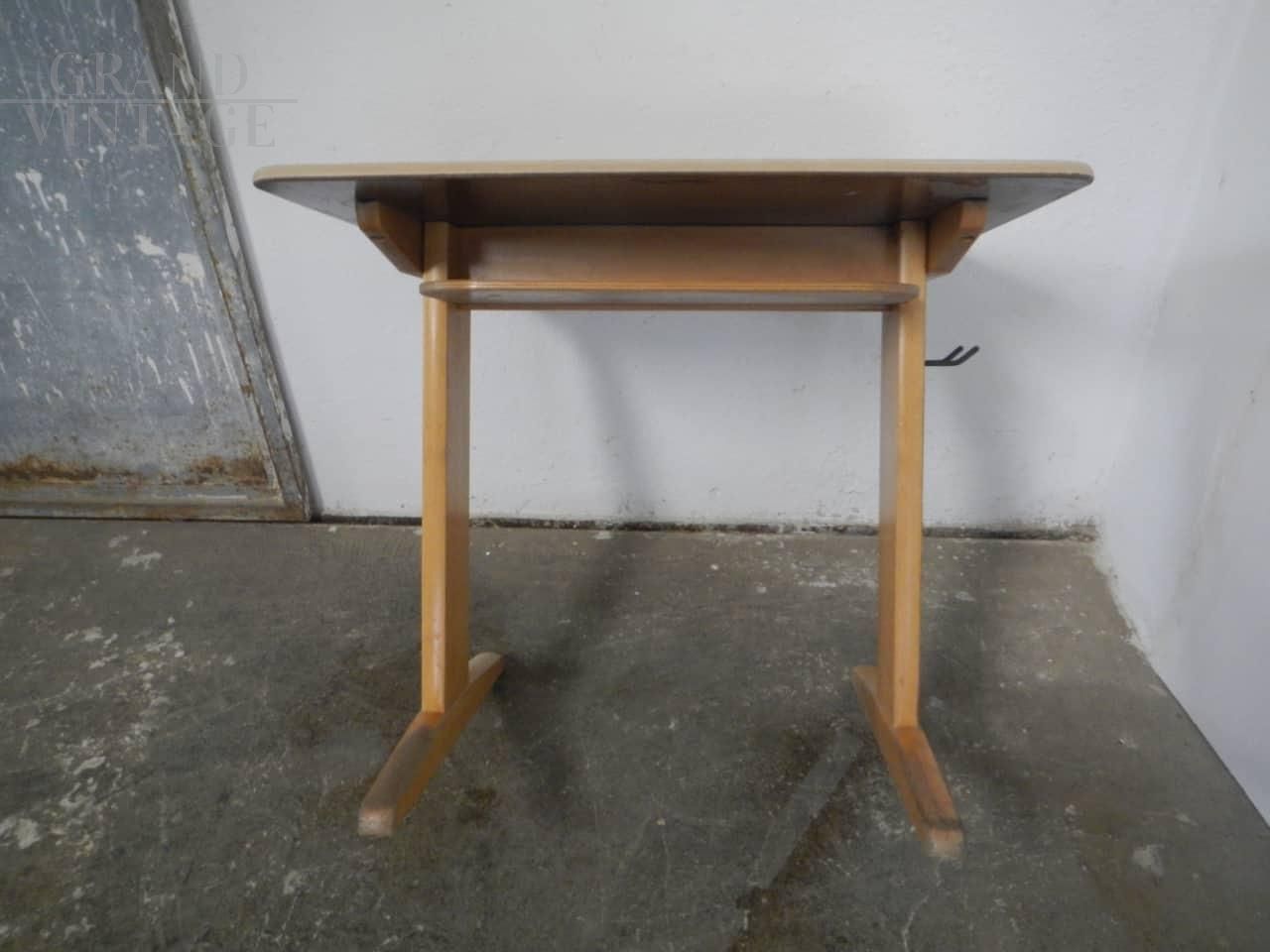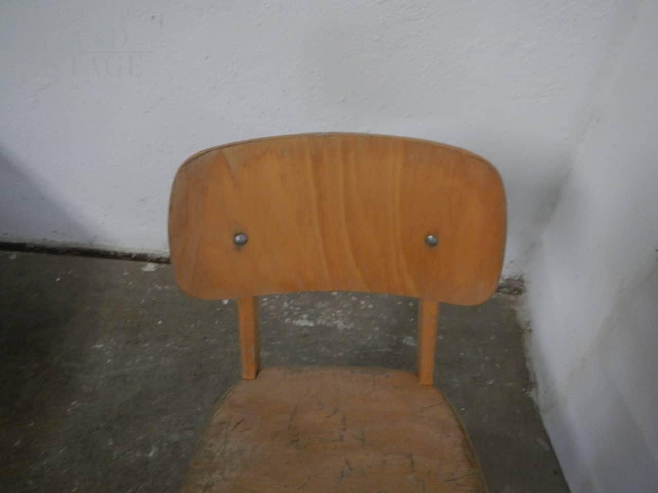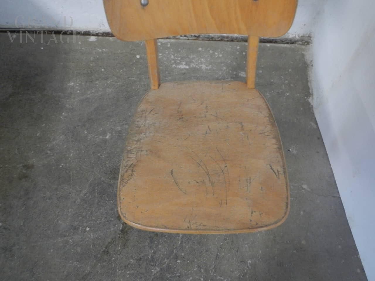Banchetto scolastico vintage con sedia in stile Casala Germania in legno di faggio con gancio porta cartella in ferro nero. La sedia misura cm 34 x 34 cm, altezza 66 cm, altezza seduta 37 cm, e presenta vari segni d’uso. Struttura buona.