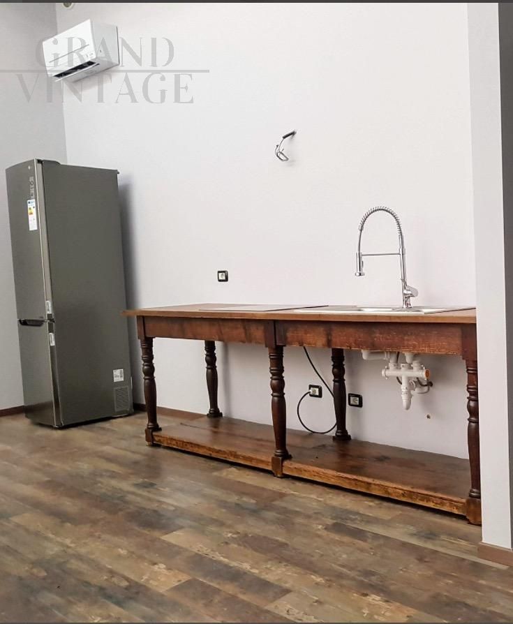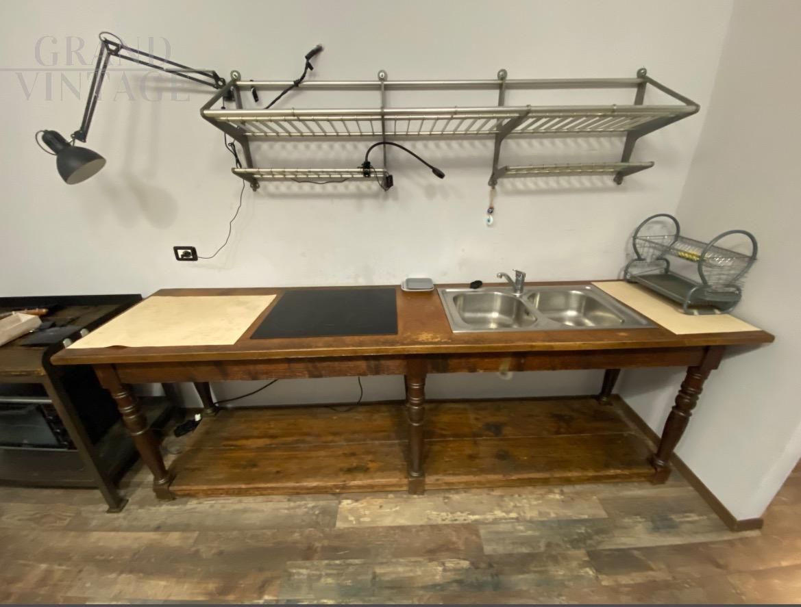Questo banco da lavoro da tappezziere dei primi del Novecento proveniente dalla Francia è stato trasformato in un banco da cucina completo di 2 lavelli in acciaio inox e 1 piastra a induzione, perfetto come isola o penisola, adatto per un arredamento industriale ma anche country.