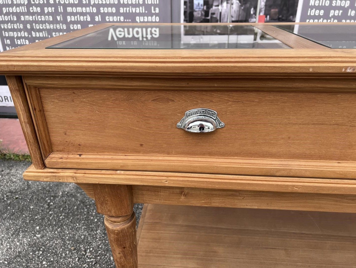 Banco da negozio vintage in legno chiaro con piano in vetro a bacheca, cassettone ampio e ripiano sottostante. Maniglie in alluminio personalizzate con il marchio Replay.