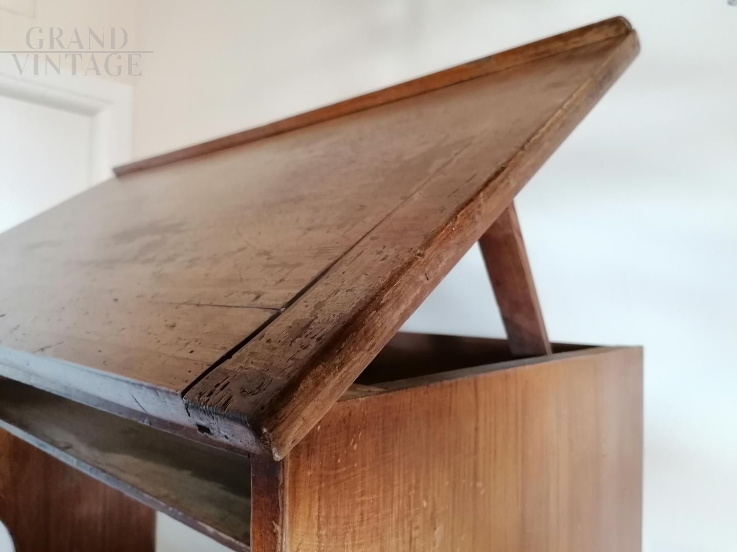 Il banco è in legno massello di abete, con piano a ribalta ad inclinazione regolabile tramite fermo, completo di ripiano portaoggetti e poggiapiedi.