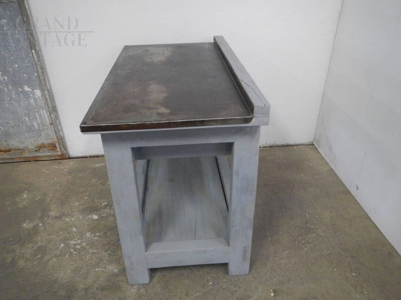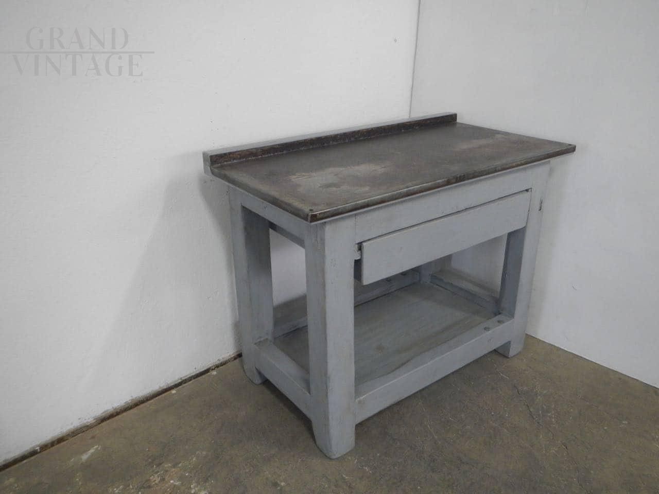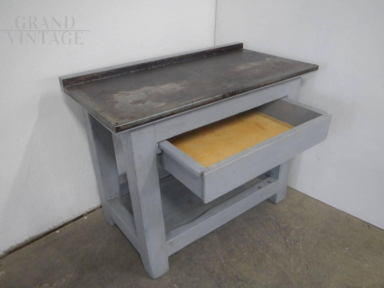 Bancone industriale da officina in legno di abete laccato con piano in metallo e un capiente cassetto centrale. Restaurato e lasciato in patina, il piano è trattato con vernice da ferro.
