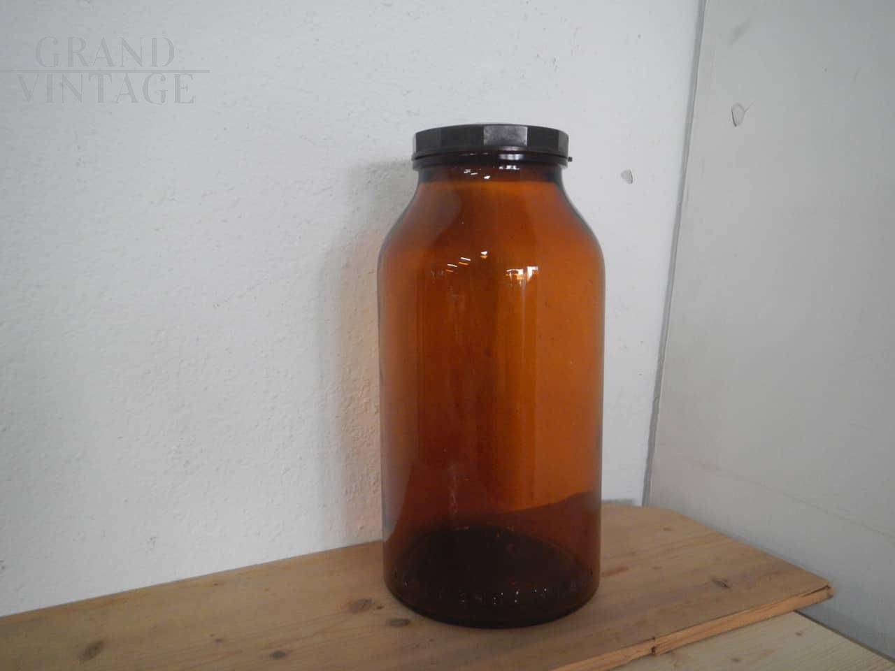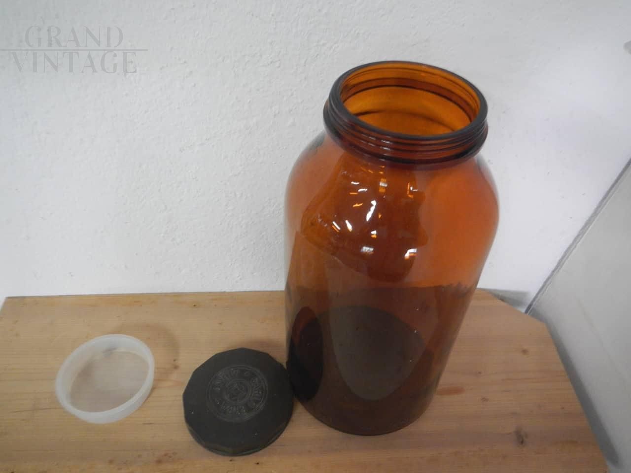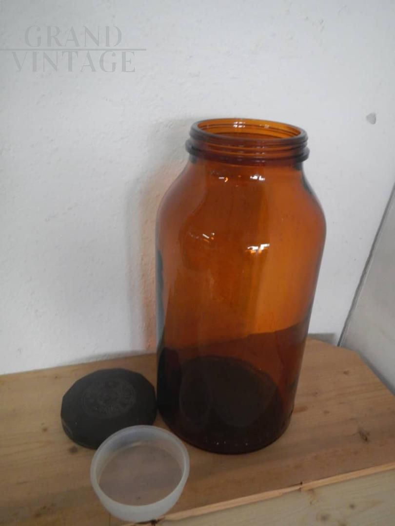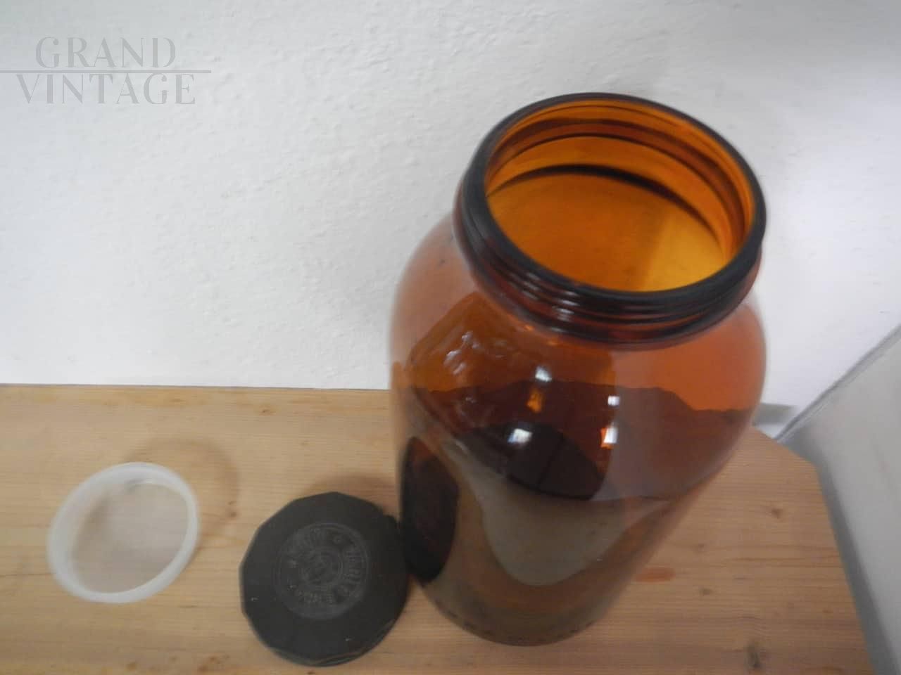 Bottiglia barattolo vintage da medicinali in vetro scuro con doppio tappo in plastica, marchiata Carlo Erba nel vetro e nel tappo. In ottime condizioni.