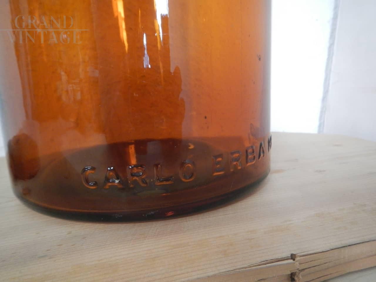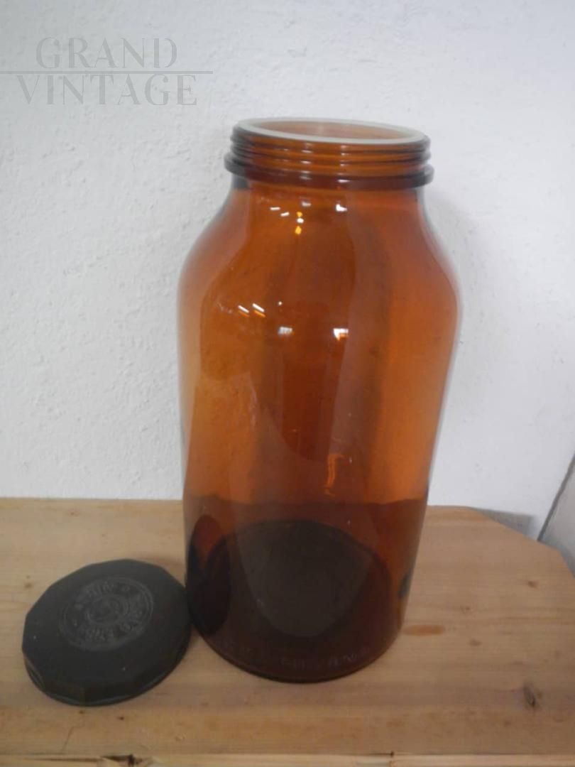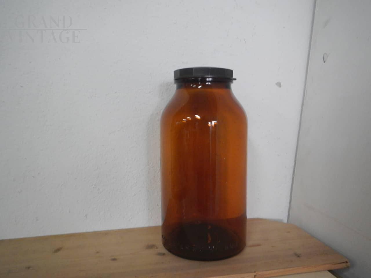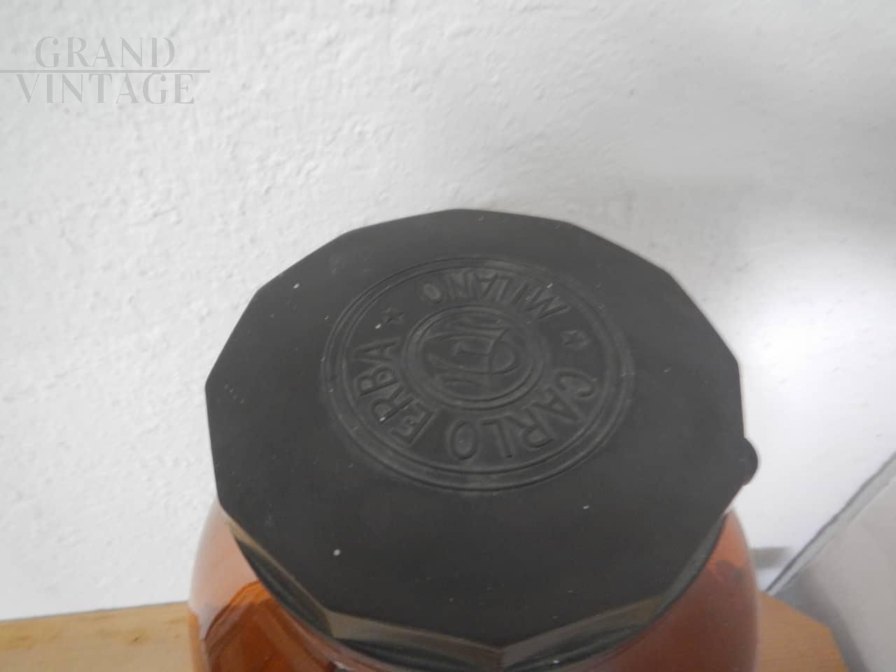 Bottiglia barattolo vintage da medicinali in vetro scuro con doppio tappo in plastica, marchiata Carlo Erba nel vetro e nel tappo. In ottime condizioni.