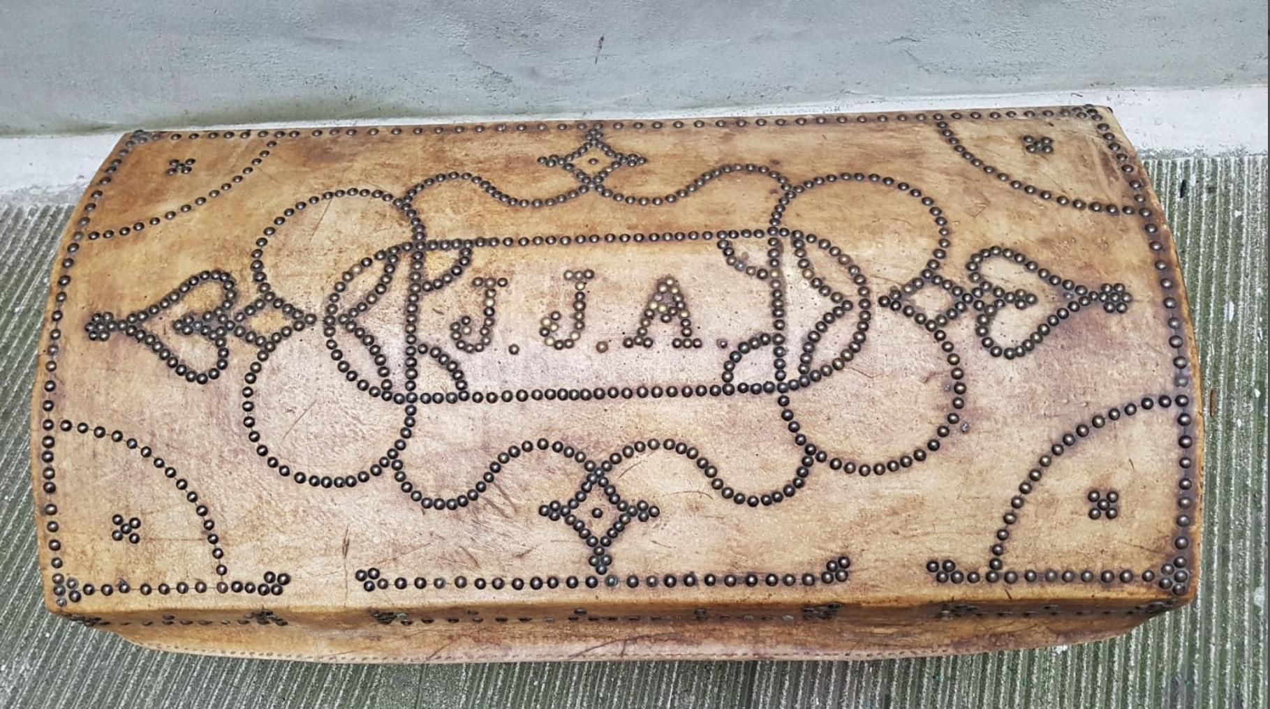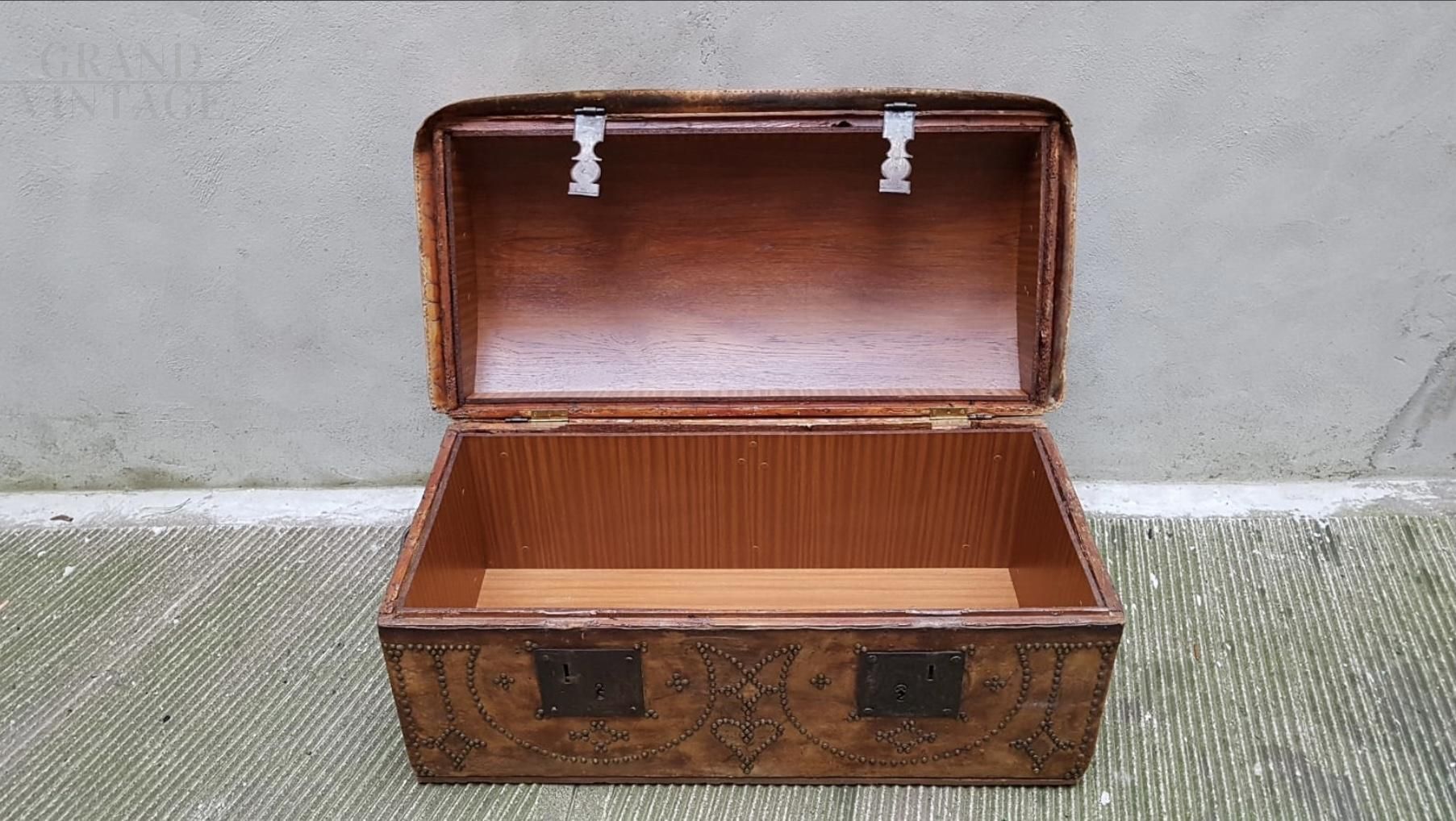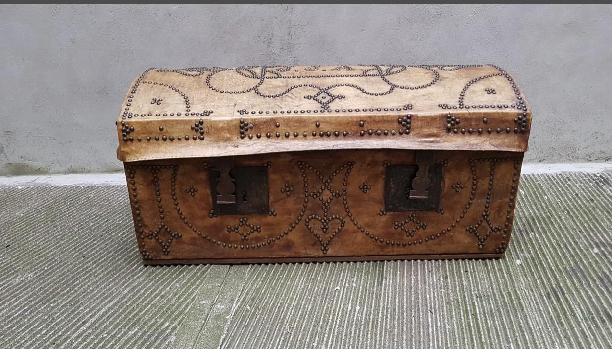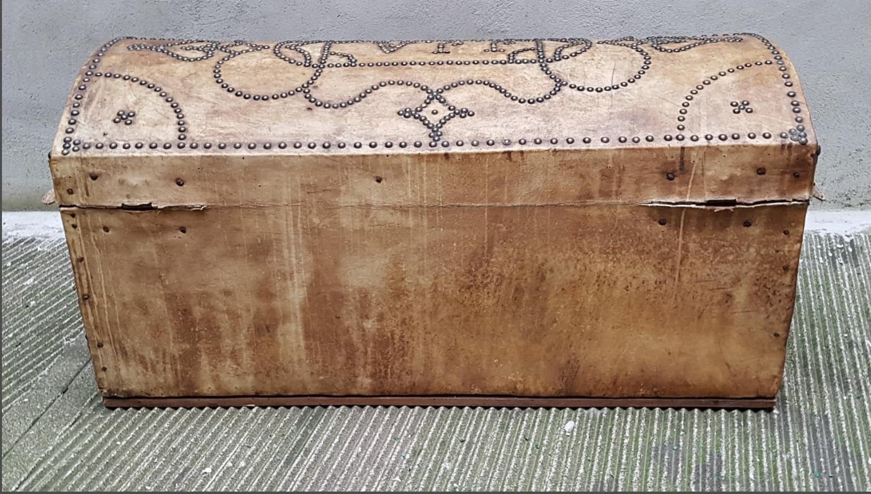 Baule in pergamena con borchie dei primi del novecento con le iniziali del proprietario. Proviene dal Portogallo ed é in ottime condizioni, completamente restaurato e foderato in legno.