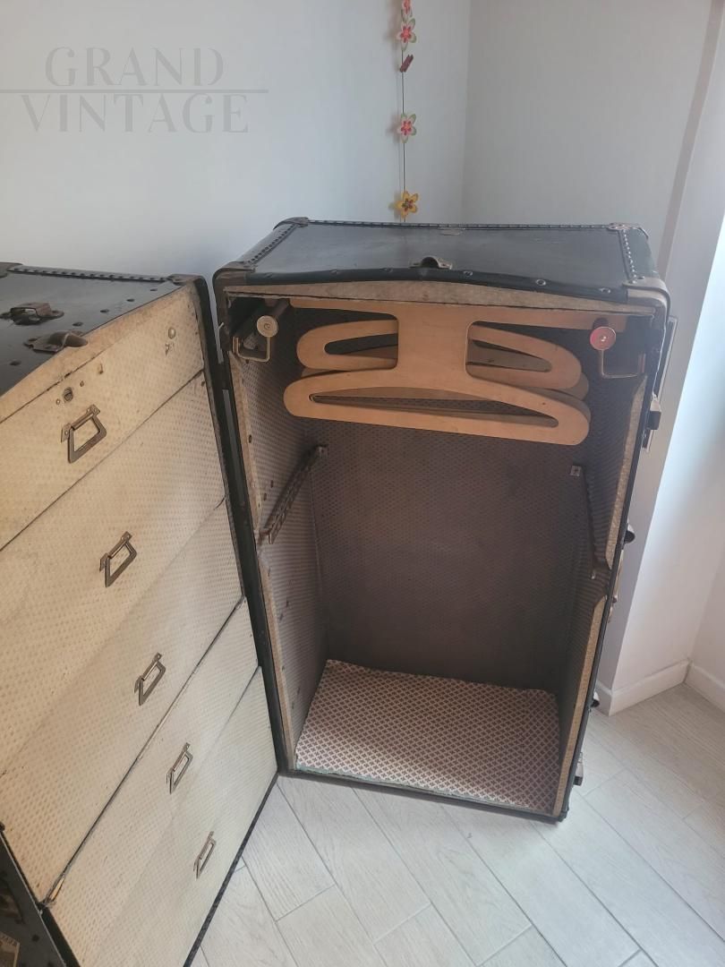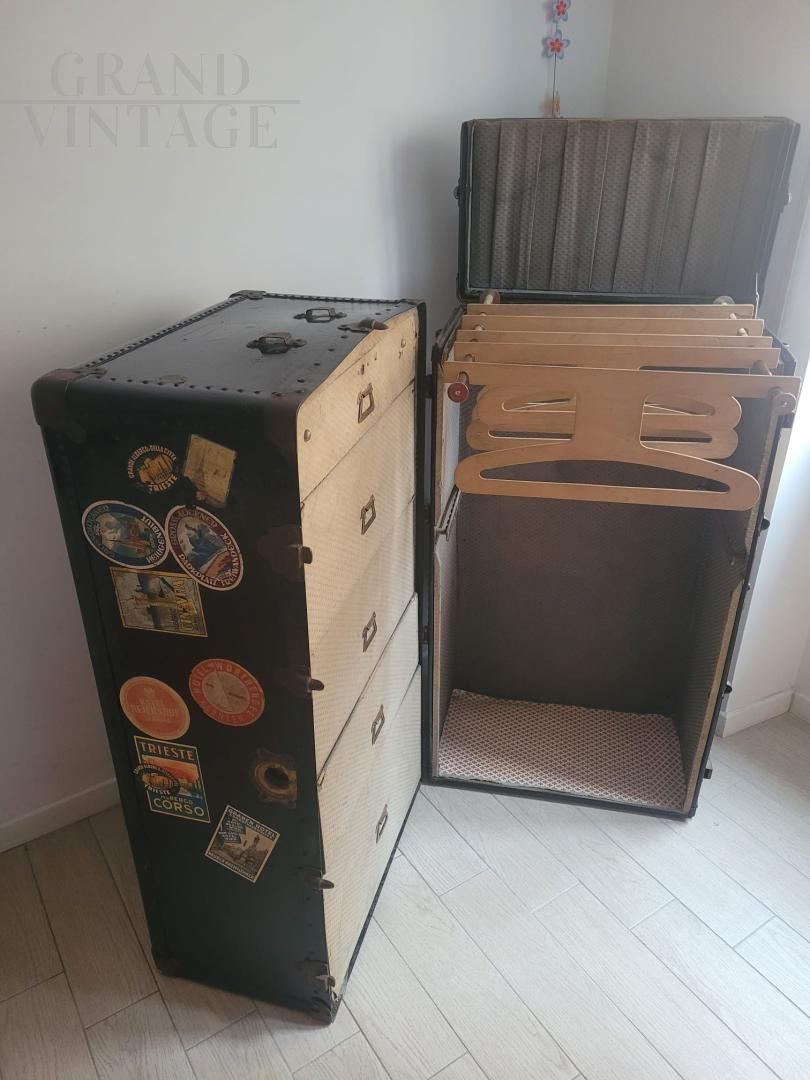 Baule armadio da viaggio vintage con 5 cassetti interni di varie misure e vano con 5 appendini in legno, con tubo allungabile e sezione apribile nella parte superiore. I cassetti sono rivestiti in tessuto, un po' rovinato. L'esterno del baule è di ferro con vari adesivi dei vari viaggi effettuati dal proprietario del baule. C'è la serratura ma manca la chiave.